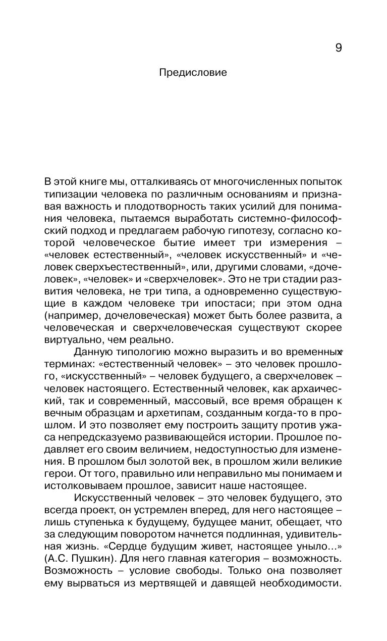 Признавая важность типизации человека по различным основаниям и плодотворность таких усилий в понимании человека, авторы пытаются выработать системно-философский подход и предлагают рабочую гипотезу, согласно которой человеческое бытие имеет три измерения — это «человек естественный», «человек искусственный» и «человек сверхъестественный», или, другими словами, «дочеловек», «человек» и «сверхчеловек». Это не три стадии развития человека, не три типа, а одновременно существующие в каждом человеке три ипостаси.