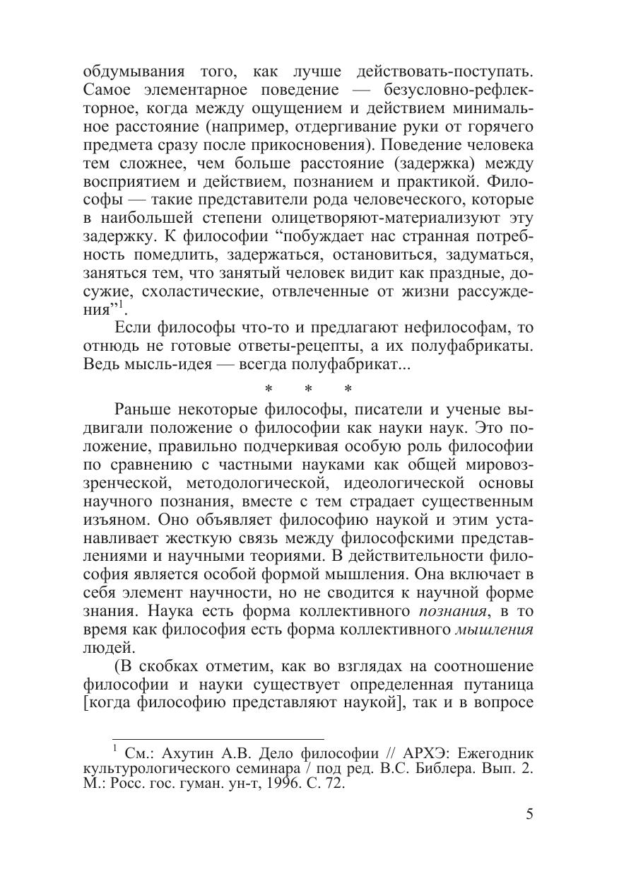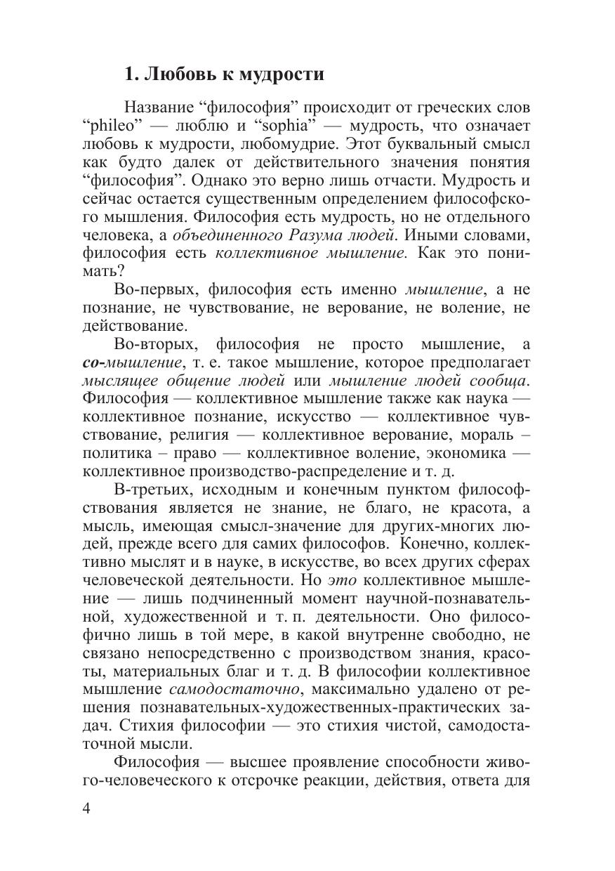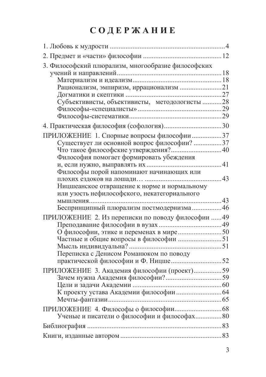 В книге обосновывается идея философии как особого типа культуры, обсуждаются темы: отличие философии от науки, предмет и “части” философии, многообразие философских учений и направлений, значение практической философии.