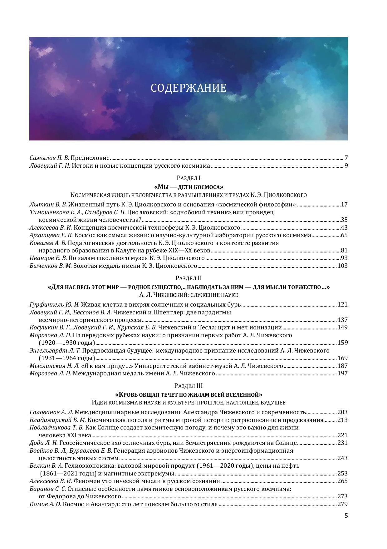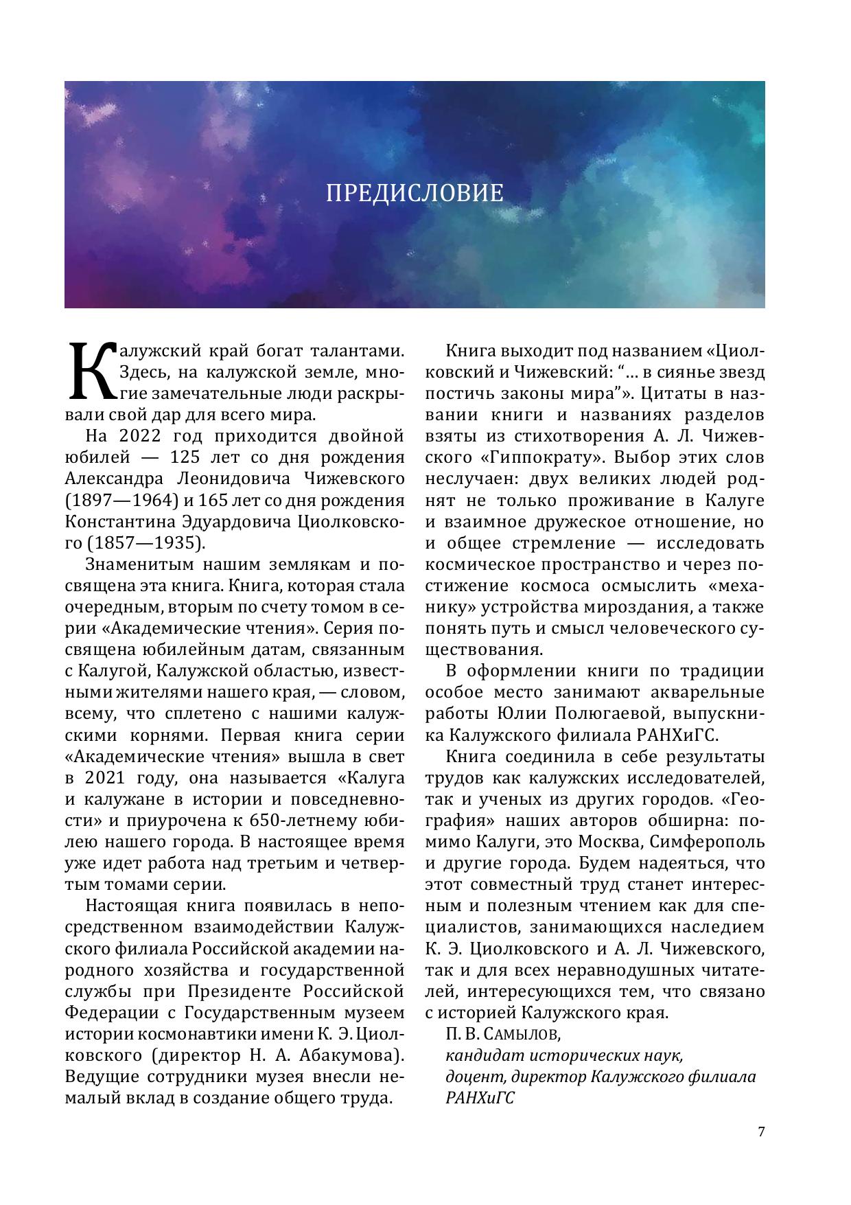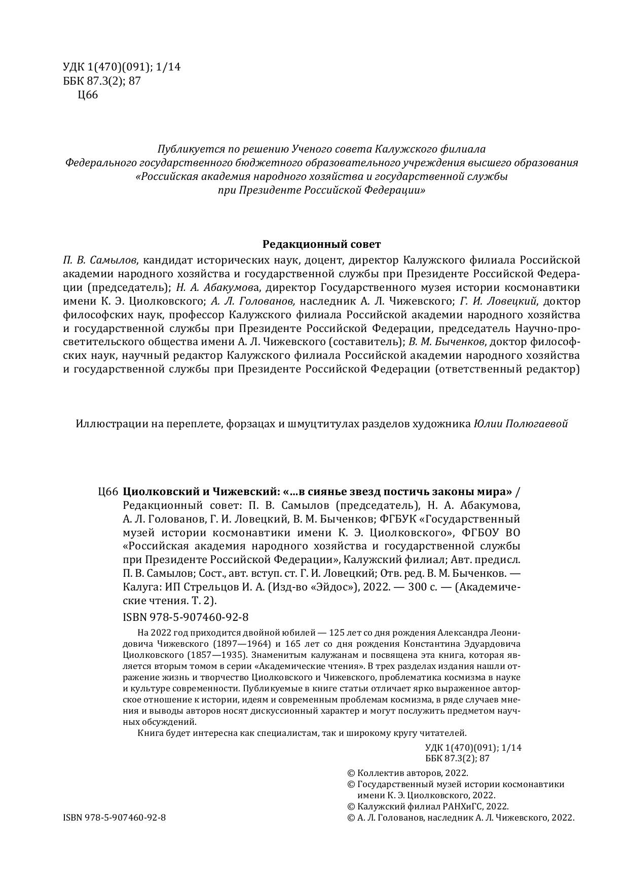 На 2022 год приходится двойной юбилей — 125 лет со дня рождения Александра Леонидовича Чижевского (1897—1964) и 165 лет со дня рождения Константина Эдуардовича Циолковского (1857—1935). Знаменитым калужанам и посвящена эта книга, которая является вторым томом в серии «Академические чтения». В трех разделах издания нашли отражение жизнь и творчество Циолковского и Чижевского, проблематика космизма в науке и культуре современности. Публикуемые в книге статьи отличает ярко выраженное авторское отношение к истории, идеям и современным проблемам космизма, в ряде случаев мнения и выводы авторов носят дискуссионный характер и могут послужить предметом научных обсуждений. Книга будет интересна как специалистам, так и широкому кругу читателей.