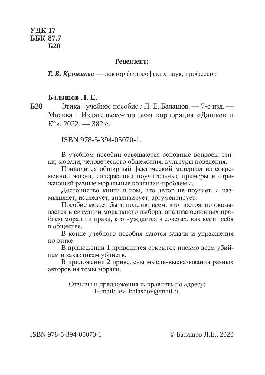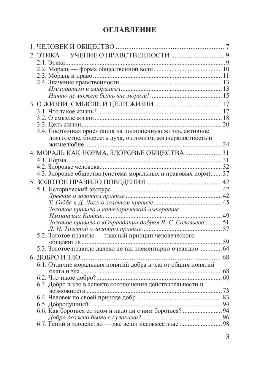 В учебном пособии освещаются основные вопросы этики, морали, человеческого общежития, культуры поведения. Приводится обширный фактический материал из современной жизни, содержащий поучительные примеры и отражающий разные моральные коллизии-проблемы. Достоинство книги в том, что автор не поучает, а размышляет, исследует, анализирует, аргументирует. Пособие может быть полезно всем, кто постоянно оказывается в ситуации морального выбора, анализа основных проблем морали и права, кто нуждается в советах, как вести себя в обществе. В конце учебного пособия даются задачи и упражнения по этике. В приложении 1 приводится открытое письмо всем убийцам и заказчикам убийств. В приложении 2 приведены мысли-высказывания разных авторов на темы морали.