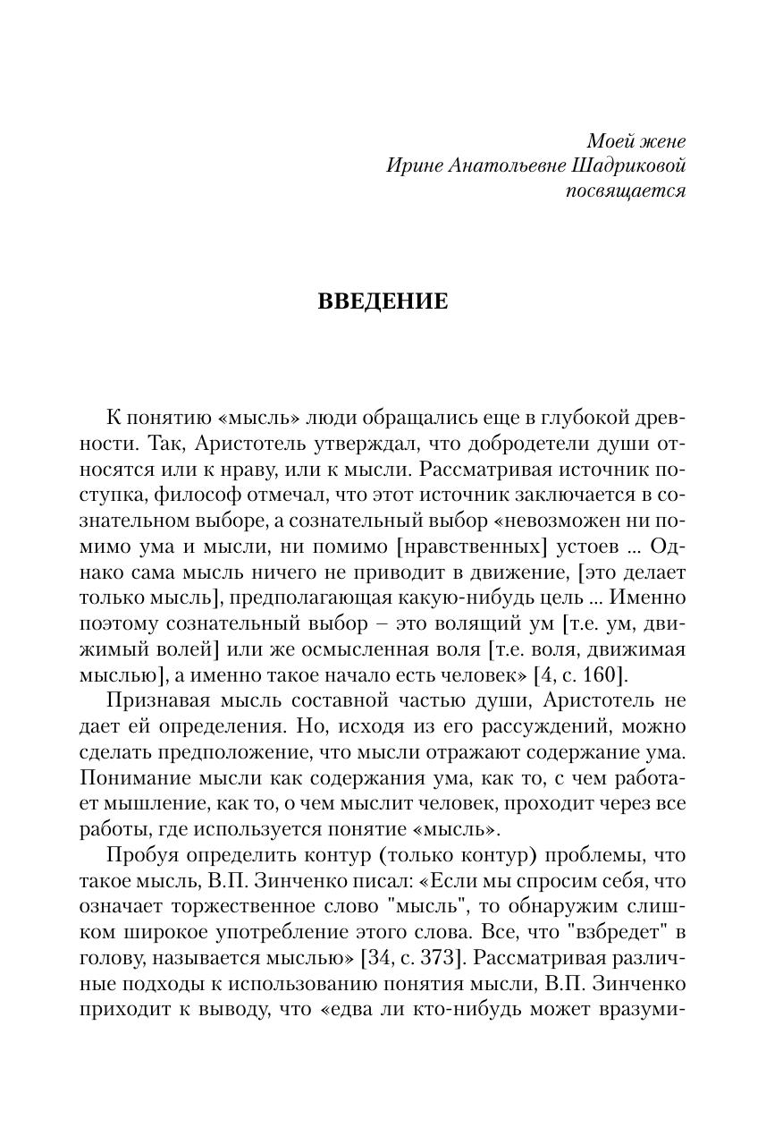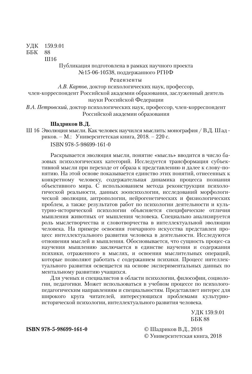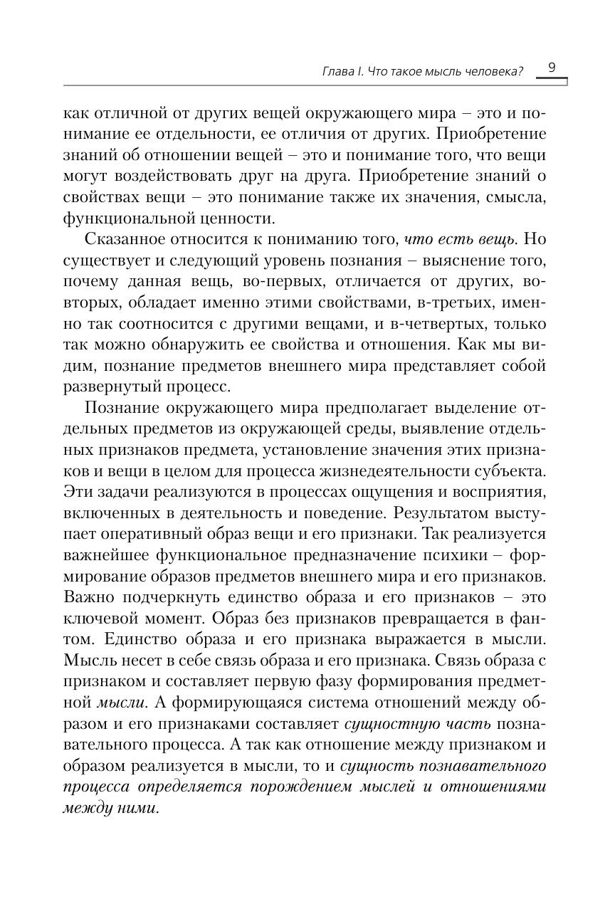 Раскрывается эволюция мысли, понятие «мысль» вводится в число базовых психологических категорий. Исследуется трансформация субъективной мысли при переходе от образа к представлению и далее к слову-понятию. На этой основе показывается единство этих понятий, отнесенных к конкретному человеку, содержательная динамика процесса познания объективного мира. С использованием метода реконструкции психологической реальности, данных зоопсихологии, исследований морфологической эволюции, антропологии, нейрогенетических и физиологических проблем, а также результатов работ по психологии деятельности и культурно-исторической психологии объясняется специфические отличия мышления животных от мышления человека. Специально анализируется роль мыслетворчества и словотворчества в интеллектуальной эволюции человека. На примере освоения гончарного искусства представлен процесс интеллектуального развития человека в деятельности. Исследуются отношения мыслей и мышления. Обосновывается, что сущность процесса научения мышлению заключается в единстве научения и содержания психики, отраженного в мыслях, и освоения мыслительных операций, которые позволяют работать с содержанием психики. Процесс интеллектуального развития освещается на основе экспериментальных данных по ментальному развитию учащихся. Для ученых и специалистов в области психологии, философии, социологии, педагогики. Может использоваться в учебном процессе по психолого-педагогическим направлениям и специальностям. Представляет интерес для широкого круга читателей, интересующихся проблемами культурно-исторической психологии, интеллектуального развития человека.