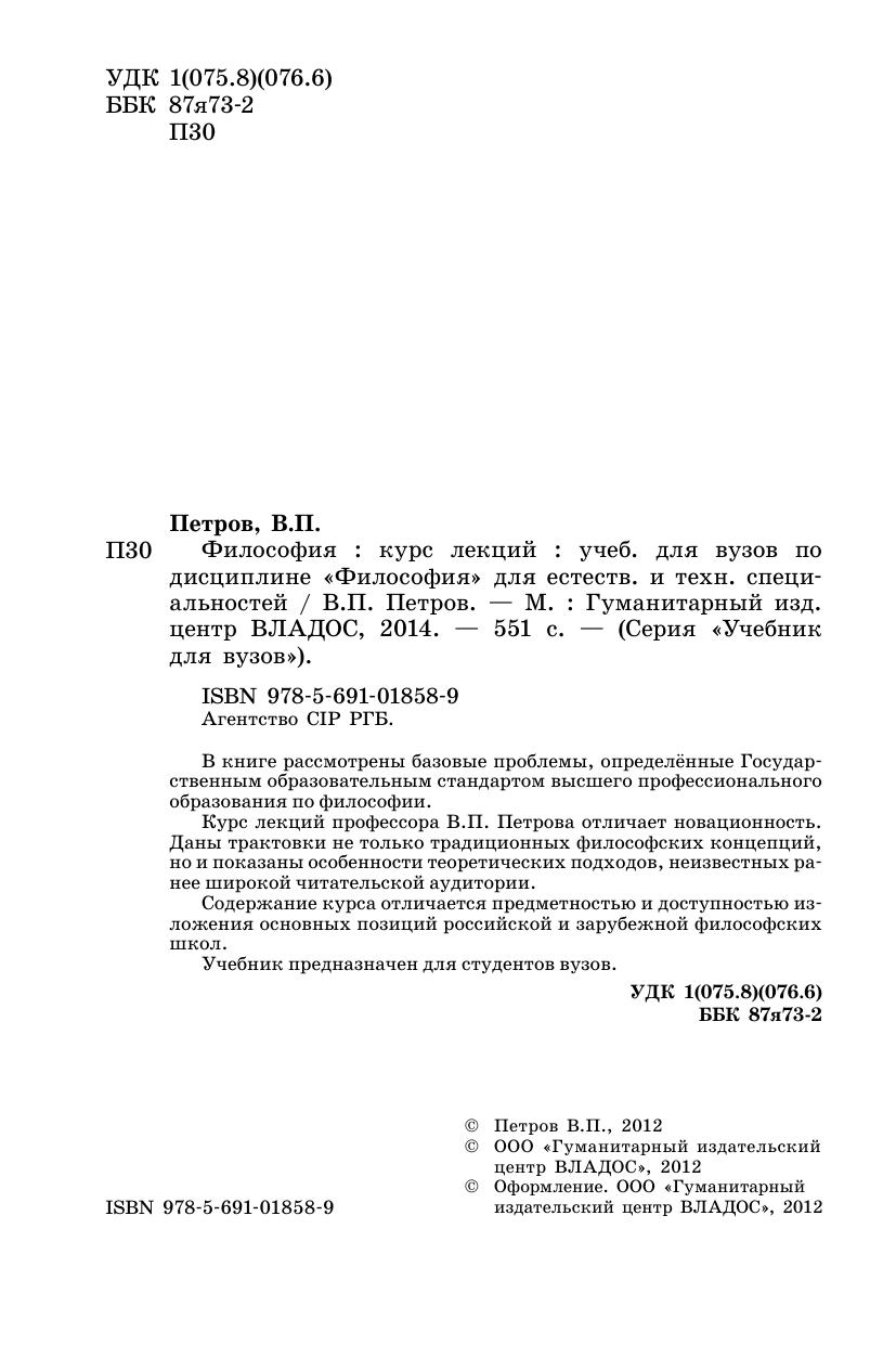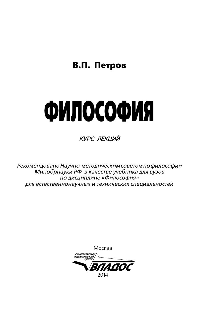 В книге рассмотрены базовые проблемы, определённые Государственным образовательным стандартом высшего профессионального образования по философии. Курс лекций профессора В.П. Петрова отличает новационность. Даны трактовки не только традиционных философских концепций, но и показаны особенности теоретических подходов, неизвестных ранее широкой читательской аудитории.