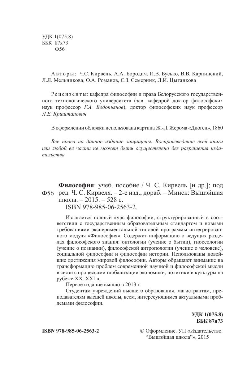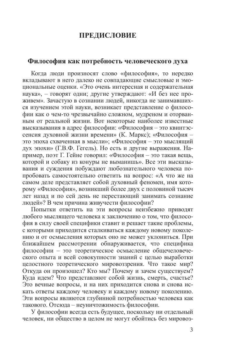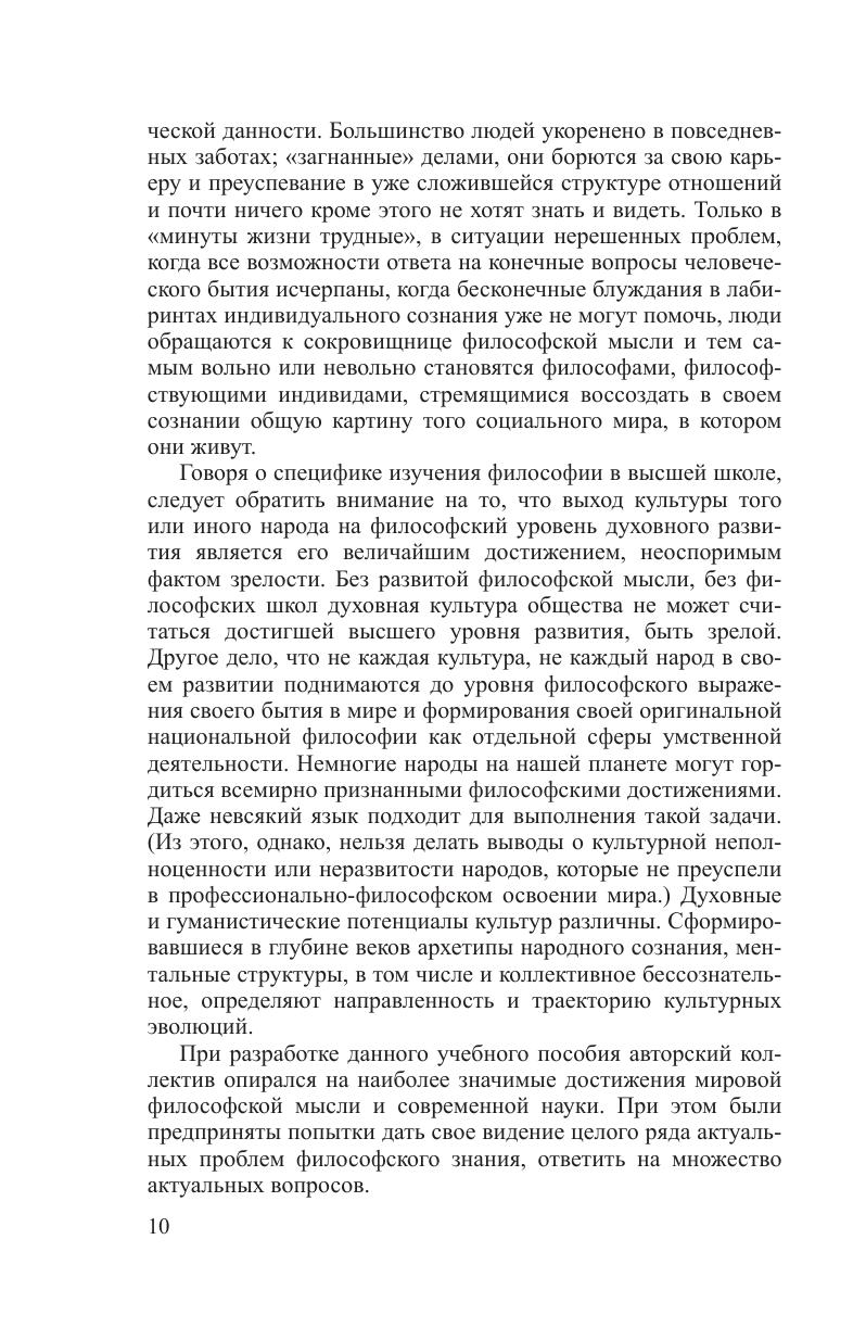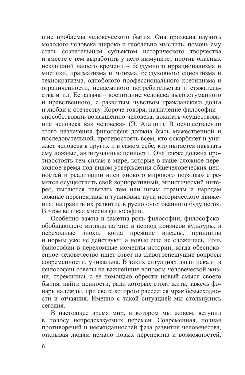 Излагается полный курс философии, структурированный в соответствии с государственным образовательным стандартом и новыми требованиями экспериментальной типовой программы интегрированного модуля «Философия». Содержит информацию о ведущих разделах философского знания: онтологии (учение о бытии), гносеологии (учение о познании), философской антропологии (учение о человеке), социальной философии и философии истории. Использованы новейшие достижения мировой философии. Авторы обращают внимание на трансформацию проблем современной научной и философской мысли в связи с процессами глобализации экономики, политики и культуры на рубеже ХХ–ХХI в. Студентам высших учебных заведений, магистрантам, преподавателям высшей школы, всем, интересующимся актуальными проблемами философии.