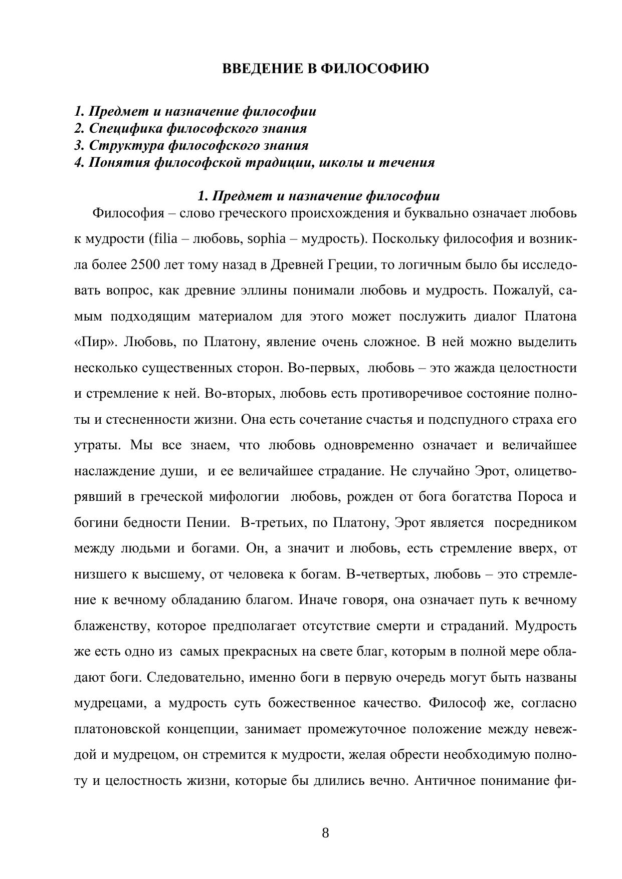 Книга представляет собой предельно краткое изложение истории европейской философии, основных разделов философского знания наиболее актуальных проблем современной философии. Оно написано в и живой, увлекательной форме и отвечает на многие волнующие современного человека вопросы мировоззренческого и духовного порядка, способствует расширению гуманитарной эрудиции, развивает культуру и силу мышления. Для студентов гуманитарных вузов, будет интересно для аспирантов и преподавателей философии, может быть полезен для учащихся колледжей, старших классов общеобразовательных школ, а также для самого широкого круга читателей, испытывающих потребность в совершенствовании своей гуманитарной образованности и интересующихся философскими вопросами.