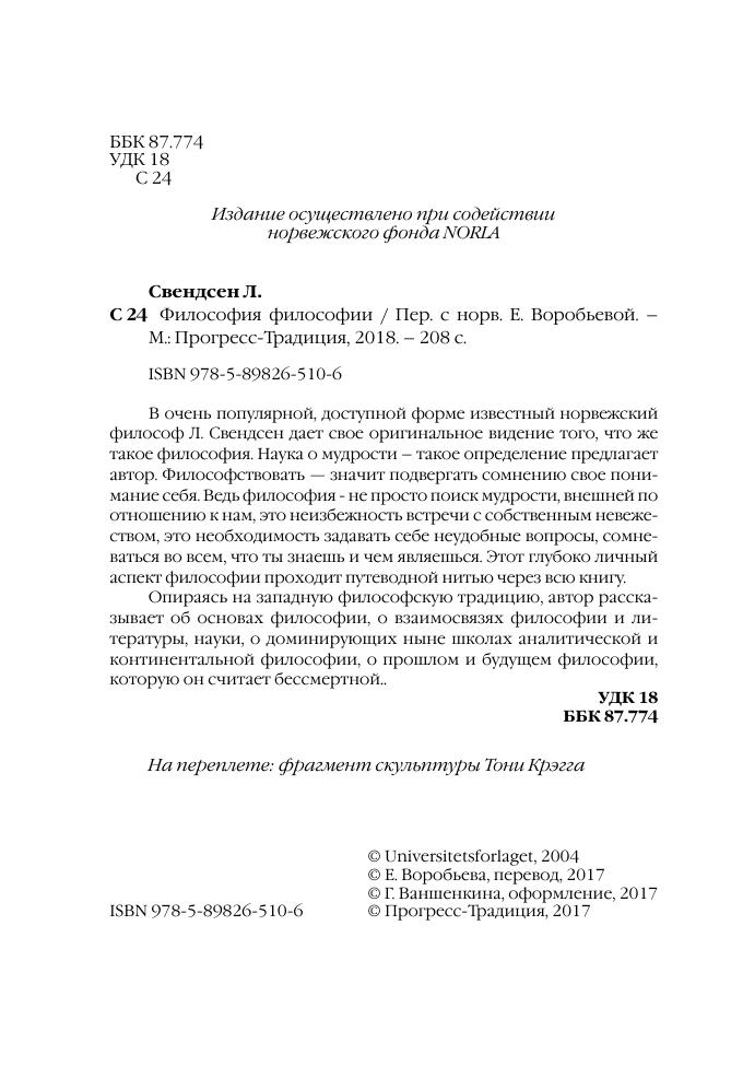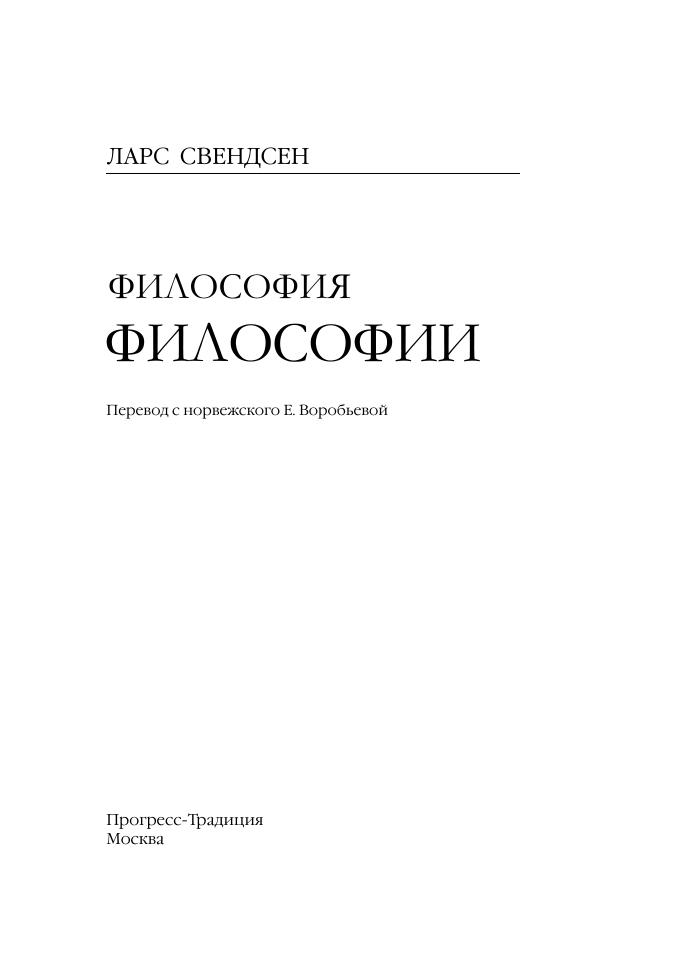 В очень популярной, доступной форме известный норвежский философ Л. Свендсен дает свое оригинальное видение того, что же такое философия. Наука о мудрости – такое определение предлагает автор. Философствовать — значит подвергать сомнению свое понимание себя. Ведь философия - не просто поиск мудрости, внешней по отношению к нам, это неизбежность встречи с собственным невежеством, это необходимость задавать себе неудобные вопросы, сомневаться во всем, что ты знаешь и чем являешься. Этот глубоко личный аспект философии проходит путеводной нитью через всю книгу.