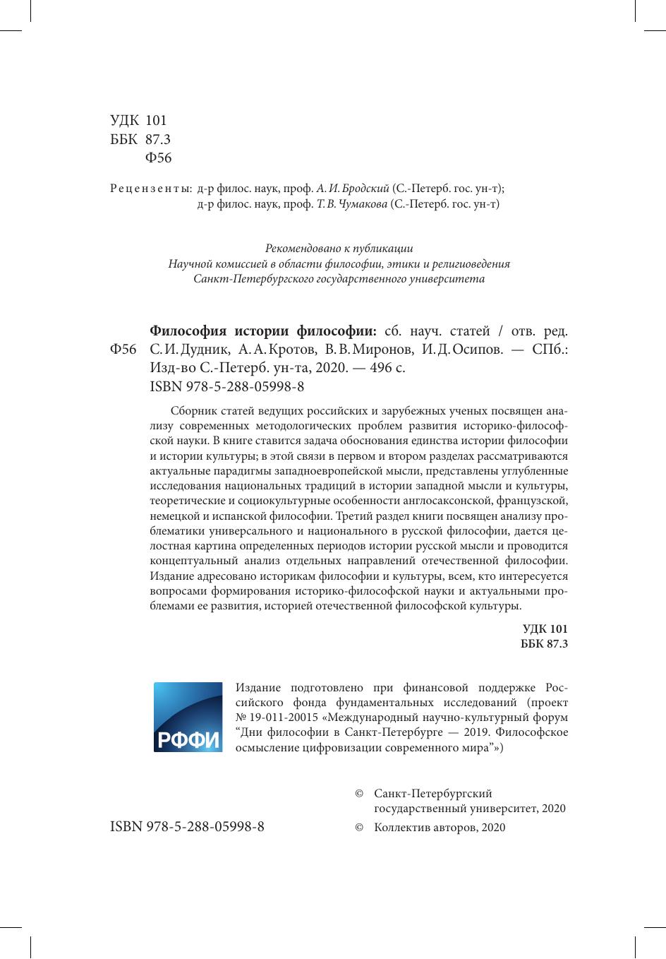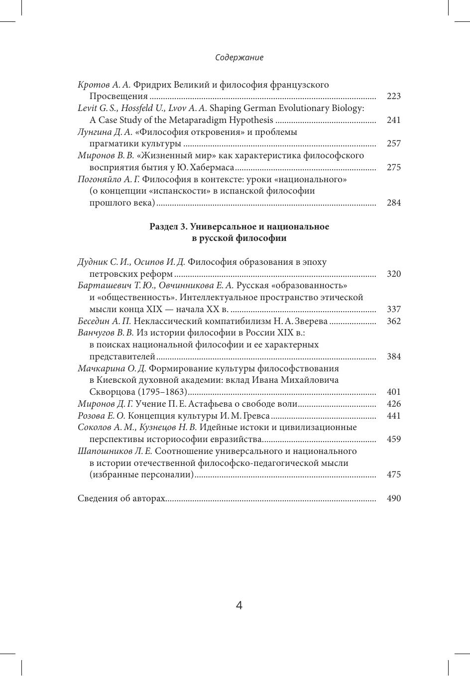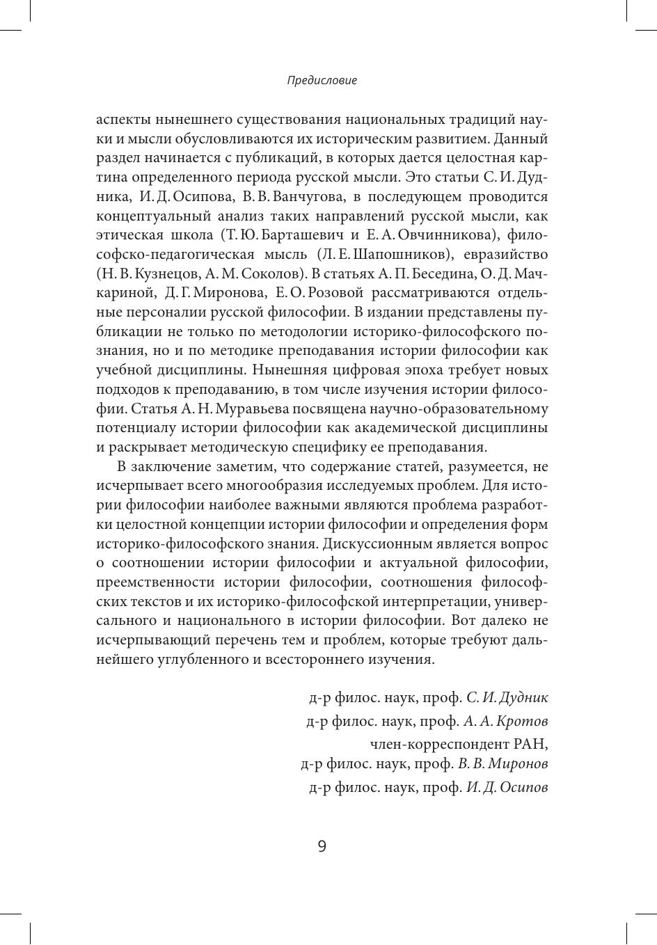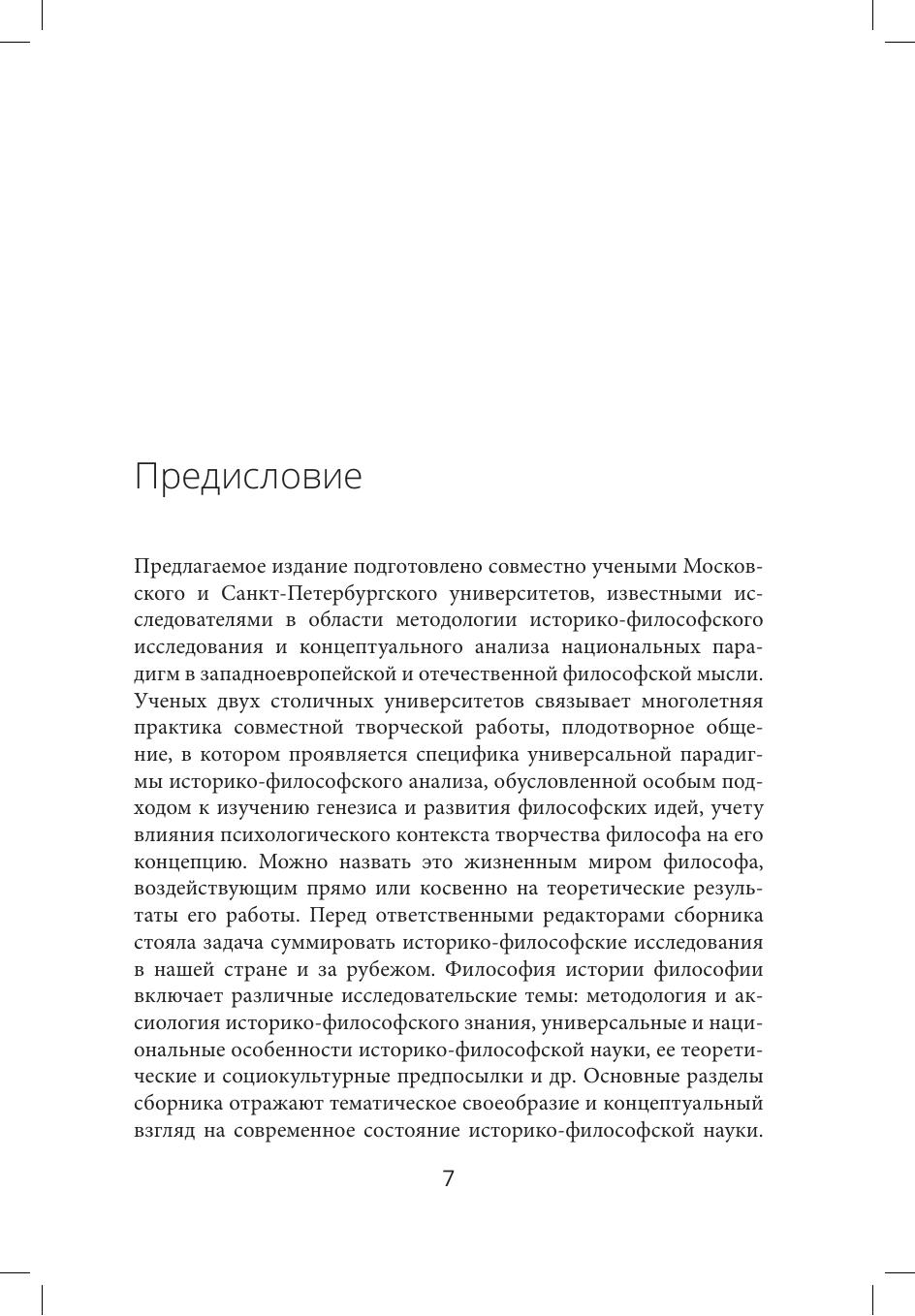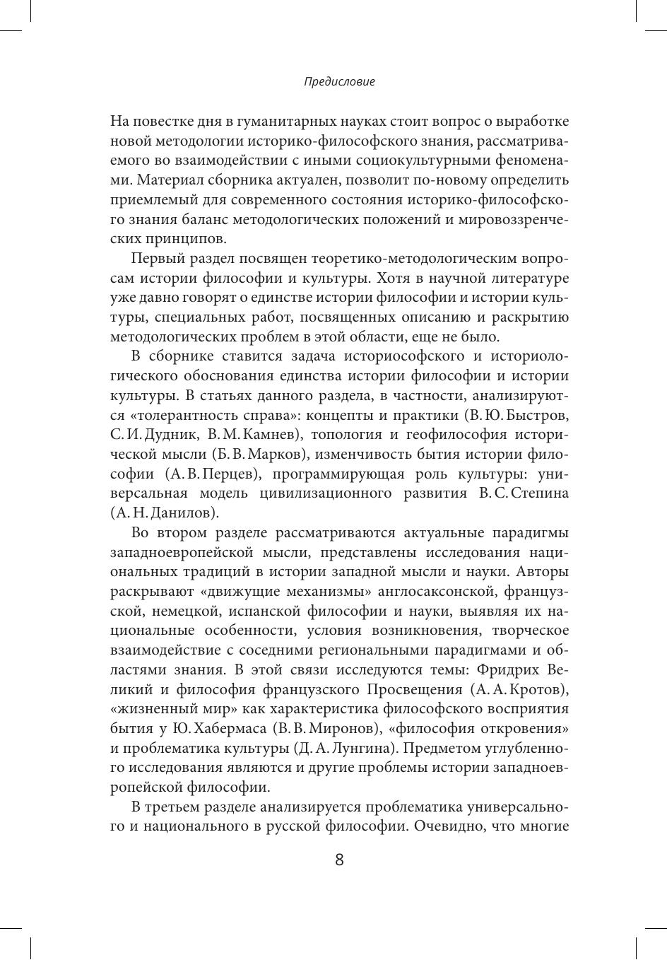Сборник статей ведущих российских и зарубежных ученых посвящен анализу современных методологических проблем развития историко-философской науки. В книге ставится задача обоснования единства истории философии и истории культуры; в этой связи в первом и втором разделах рассматриваются актуальные парадигмы западноевропейской мысли, представлены углубленные исследования национальных традиций в истории западной мысли и культуры, теоретические и социокультурные особенности англосаксонской, французской, немецкой и испанской философии. Третий раздел книги посвящен анализу проблематики универсального и национального в русской философии, дается целостная картина определенных периодов истории русской философии, дается целостная картина определённых периодов истории русской мысли и проводится концептуальный анализ отдельных направлений отечественной философии. Издание адресовано историкам философии и культуры, всем, кто интересуется вопросами формирования историко-философской науки и актуальными проблемами ее развития, историей отечественной философской культуры.