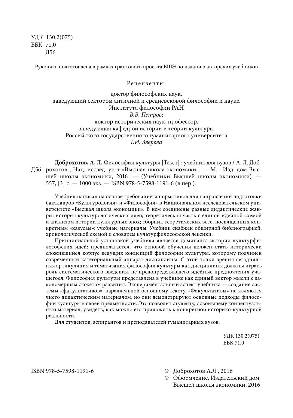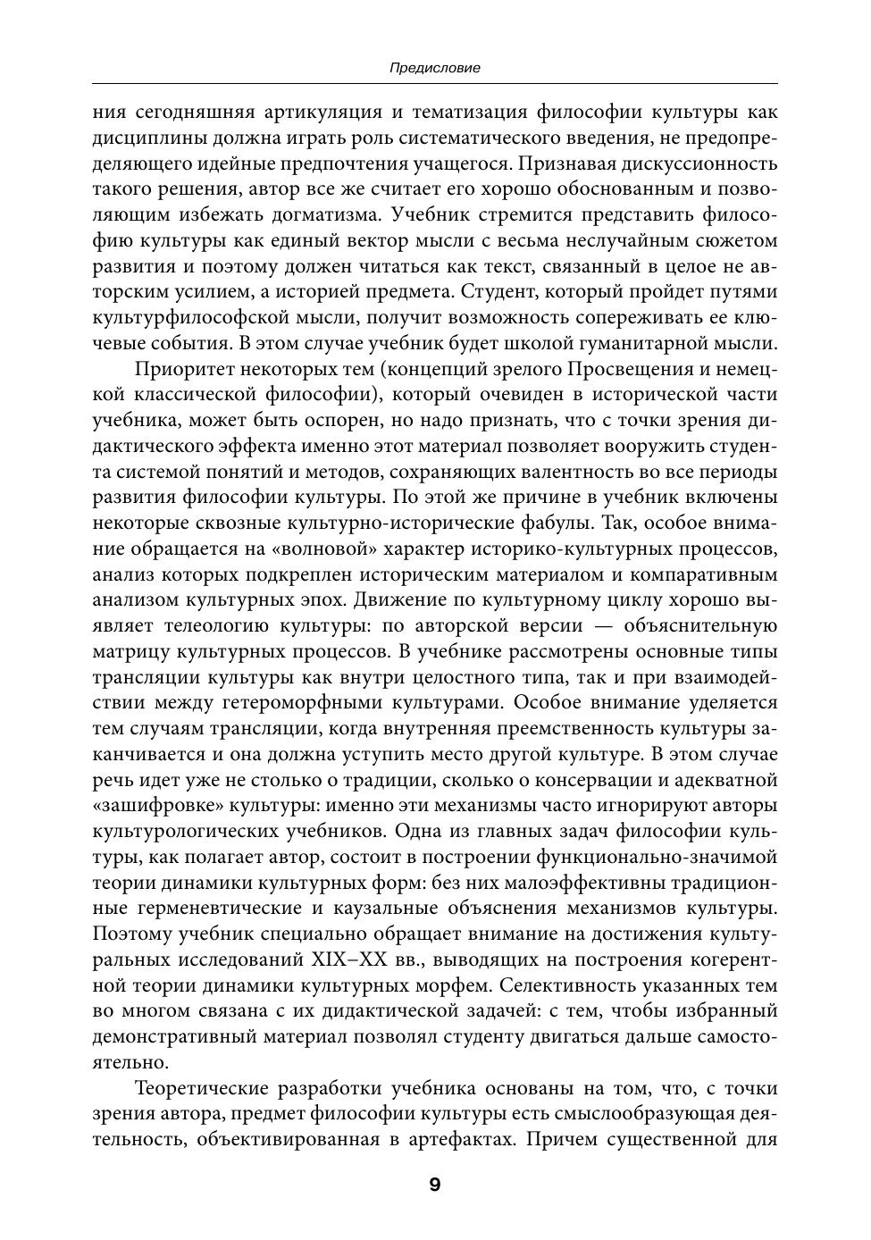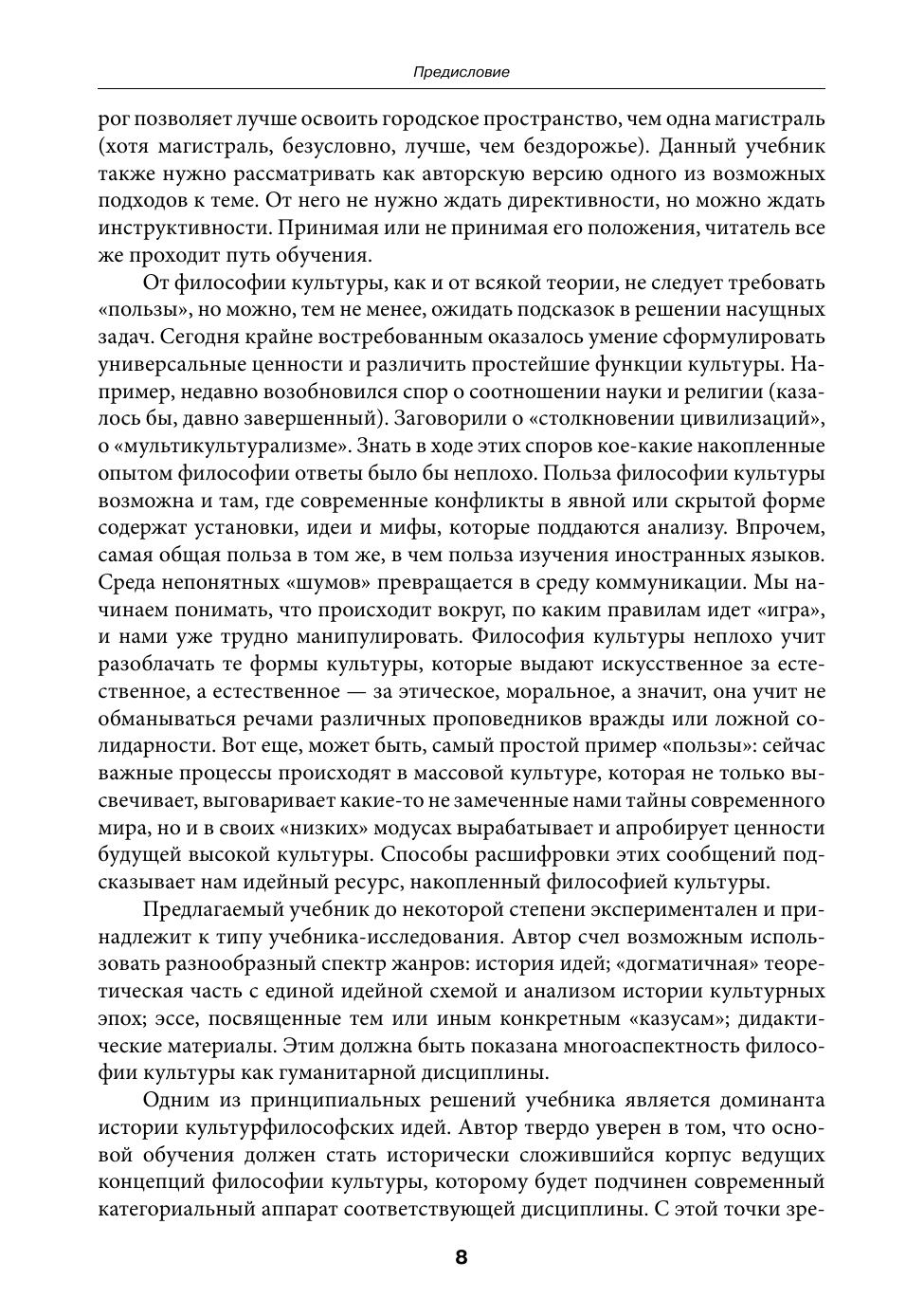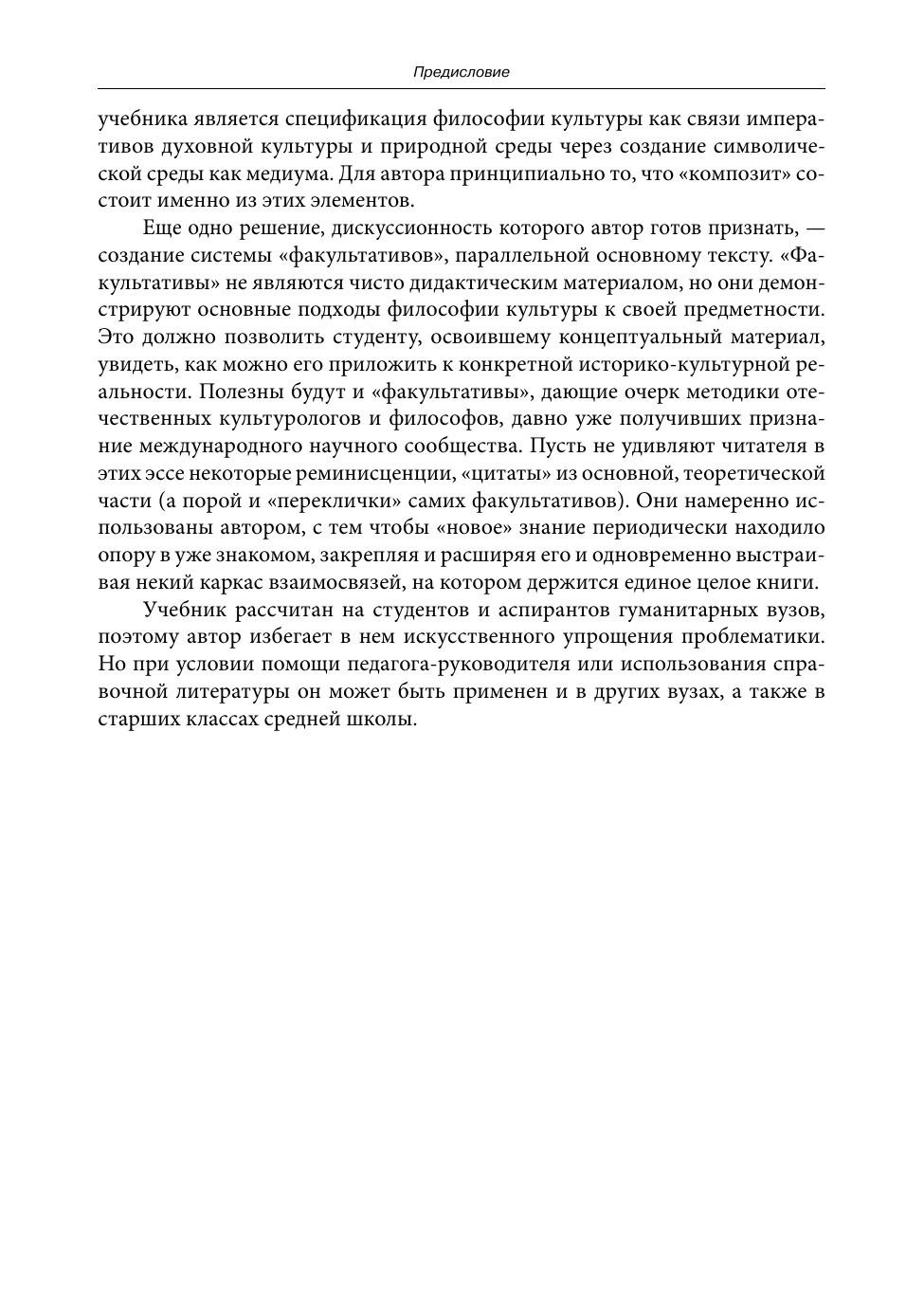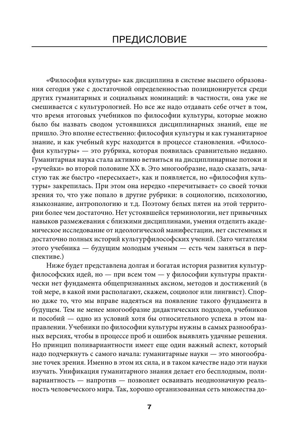 Учебник написан на основе требований и нормативов для направлений подготовки бакалавров «Культурология» и «Философия» в Национальном исследовательском университете «Высшая школа экономики». В нем соединены разные дидактические жанры: история культурологических идей; теоретическая часть с единой идейной схемой и анализом истории культурных эпох; сборник теоретических эссе, посвященных конкретным «казусам»; учебные материалы. Учебник снабжен обширной библиографией, хронологической схемой и словарем культурфилософской лексики. Принципиальной установкой учебника является доминанта истории культурфилософских идей: предполагается, что основой обучения должен стать исторически сложившийся корпус ведущих концепций философии культуры, которому подчинен современный категориальный аппарат дисциплины. С этой точки зрения сегодняшняя артикуляция и тематизация философии культуры как дисциплины должны играть роль систематического введения, не предопределяющего идейные предпочтения учащегося. Философия культуры представлена в учебнике как единый вектор мысли с закономерным сюжетом развития. Экспериментальный аспект учебника — создание системы «факультативов», параллельной основному тексту. «Факультативы» не являются чисто дидактическим материалом, но они демонстрируют основные подходы философии культуры к своей предметности. Это позволит студенту, освоившему концептуальный материал, увидеть, как можно его приложить к конкретной историко-культурной реальности. Для студентов, аспирантов и преподавателей гуманитарных вузов.