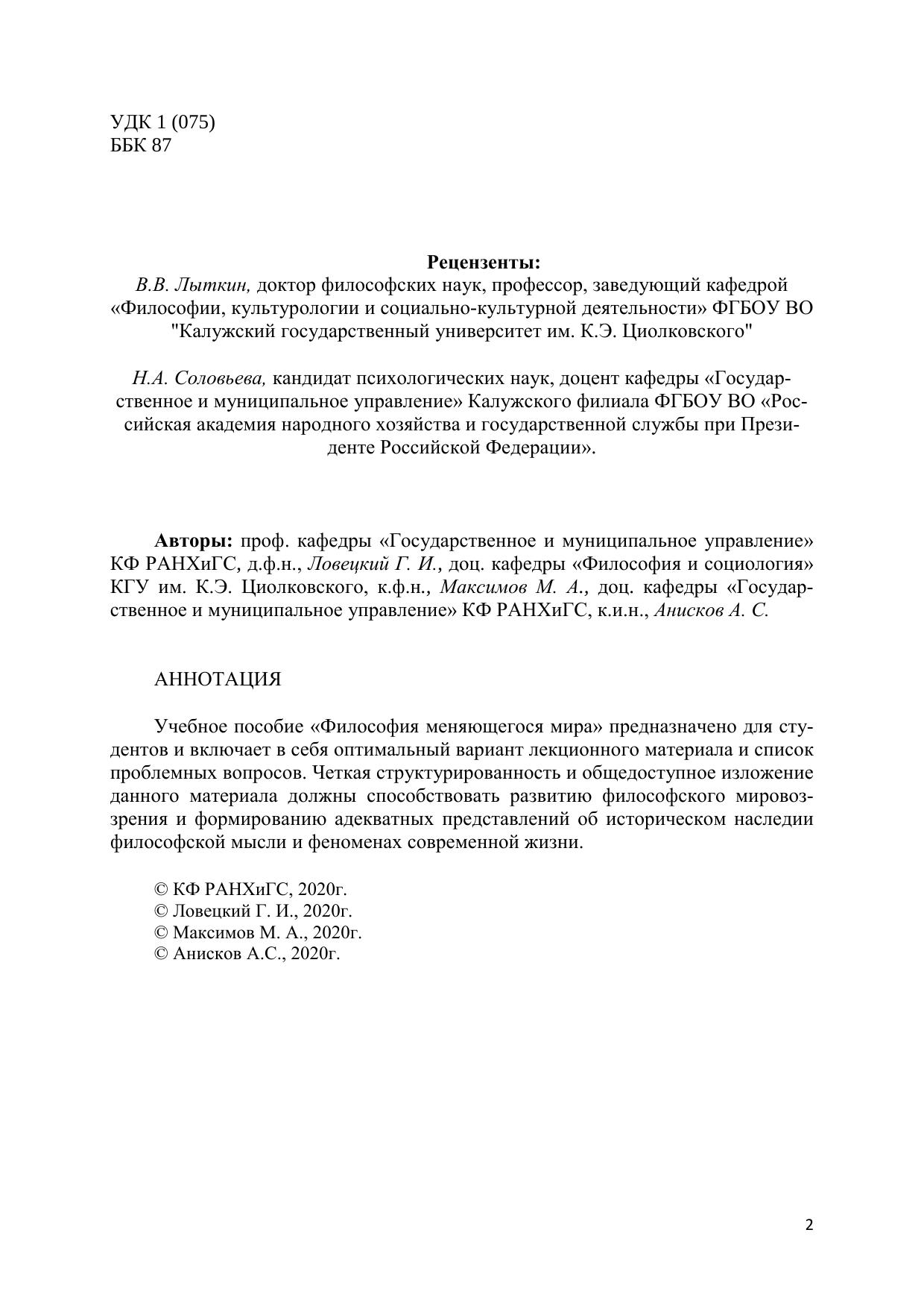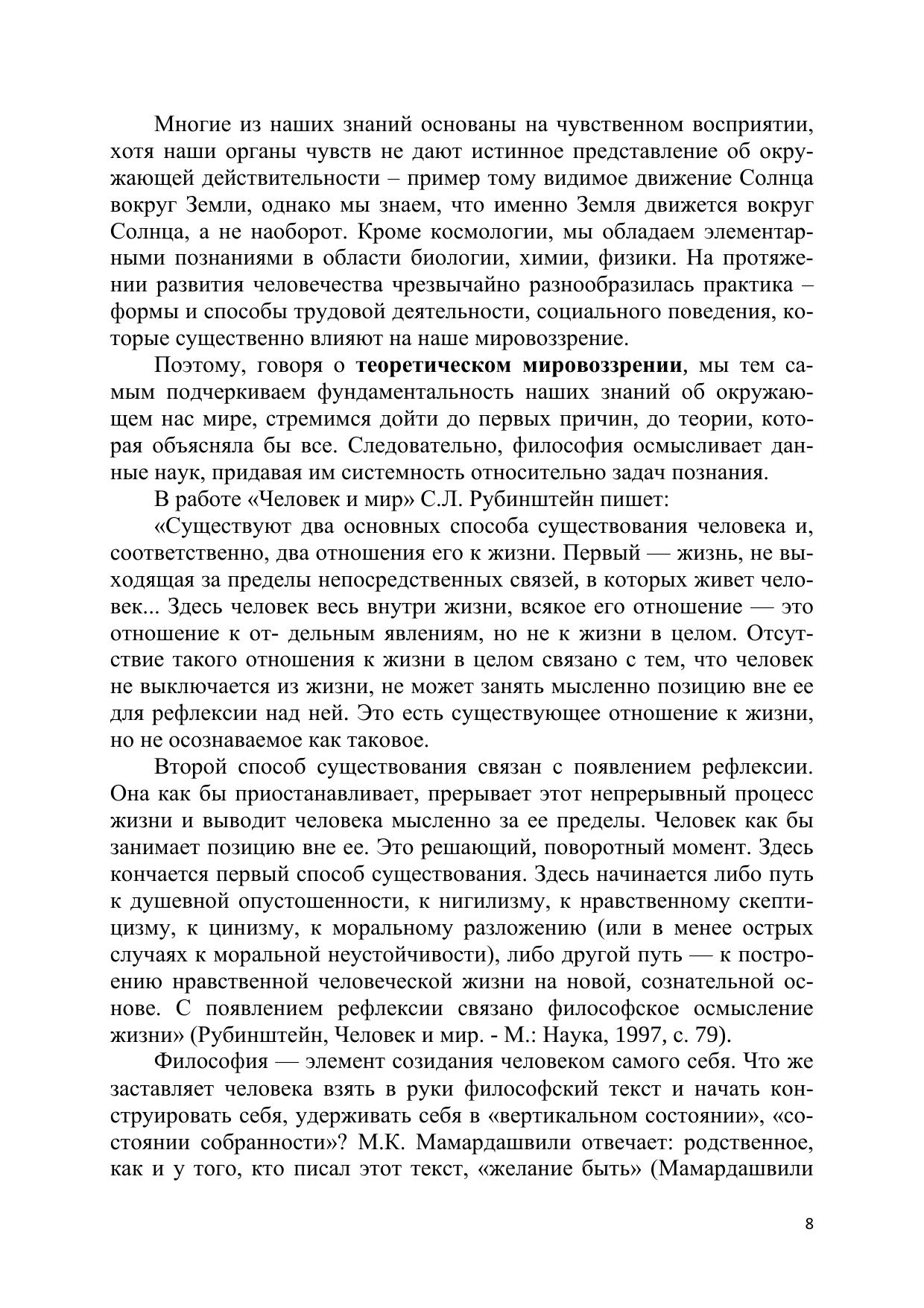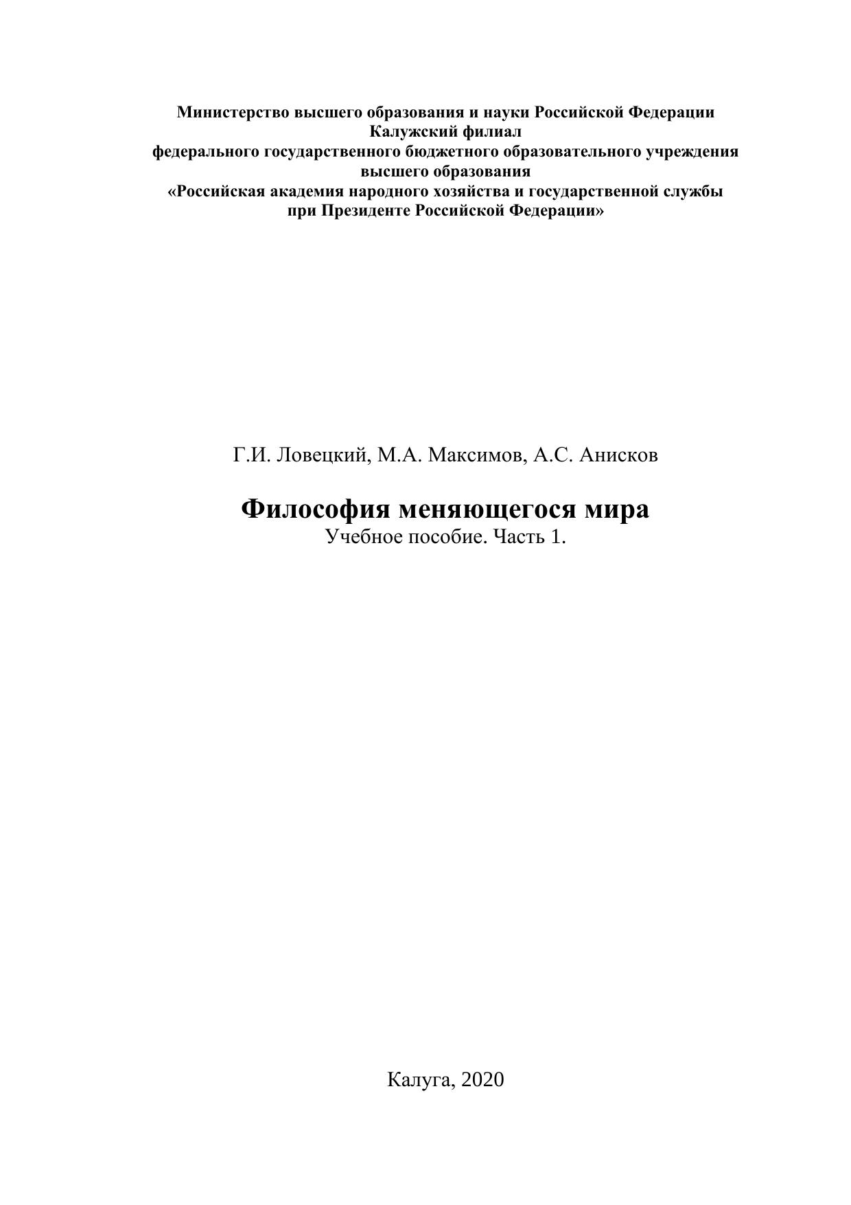 Учебное пособие «Философия меняющегося мира» предназначено для сту-дентов и включает в себя оптимальный вариант лекционного материала и список проблемных вопросов. Четкая структурированность и общедоступное изложение данного материала должны способствовать развитию философского мировоз-зрения и формированию адекватных представлений об историческом наследии философской мысли и феноменах современной жизни.