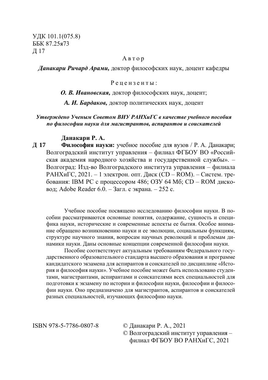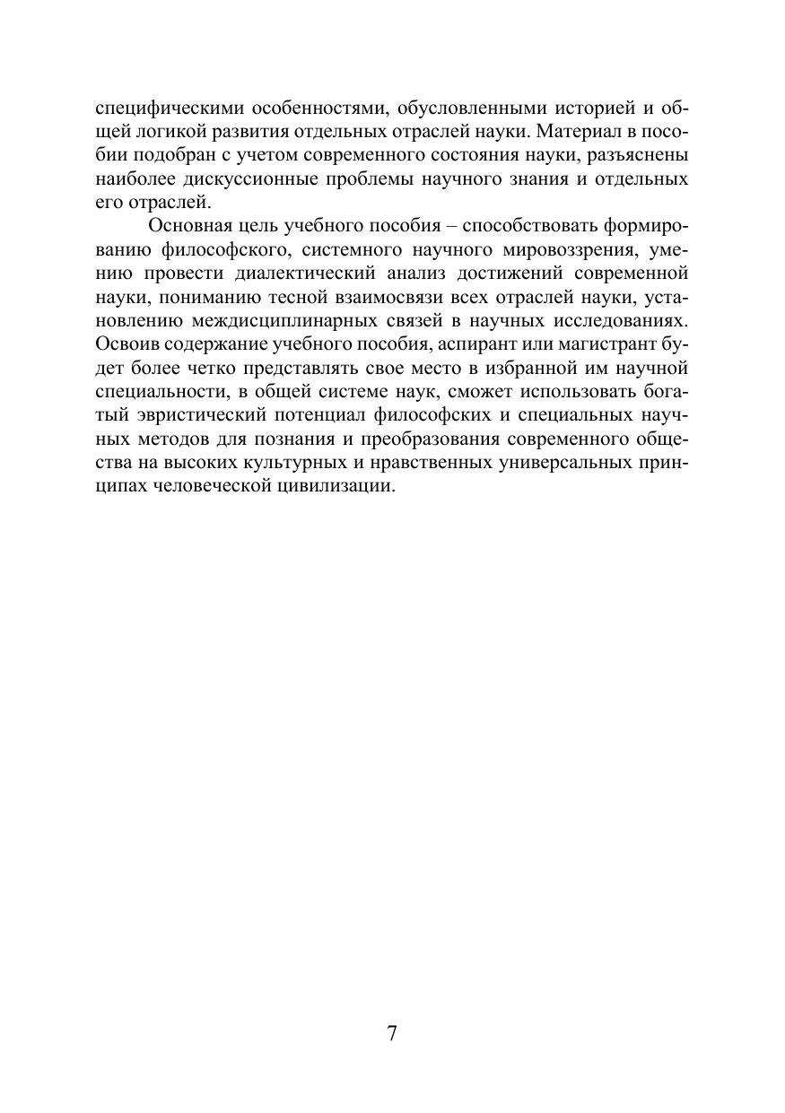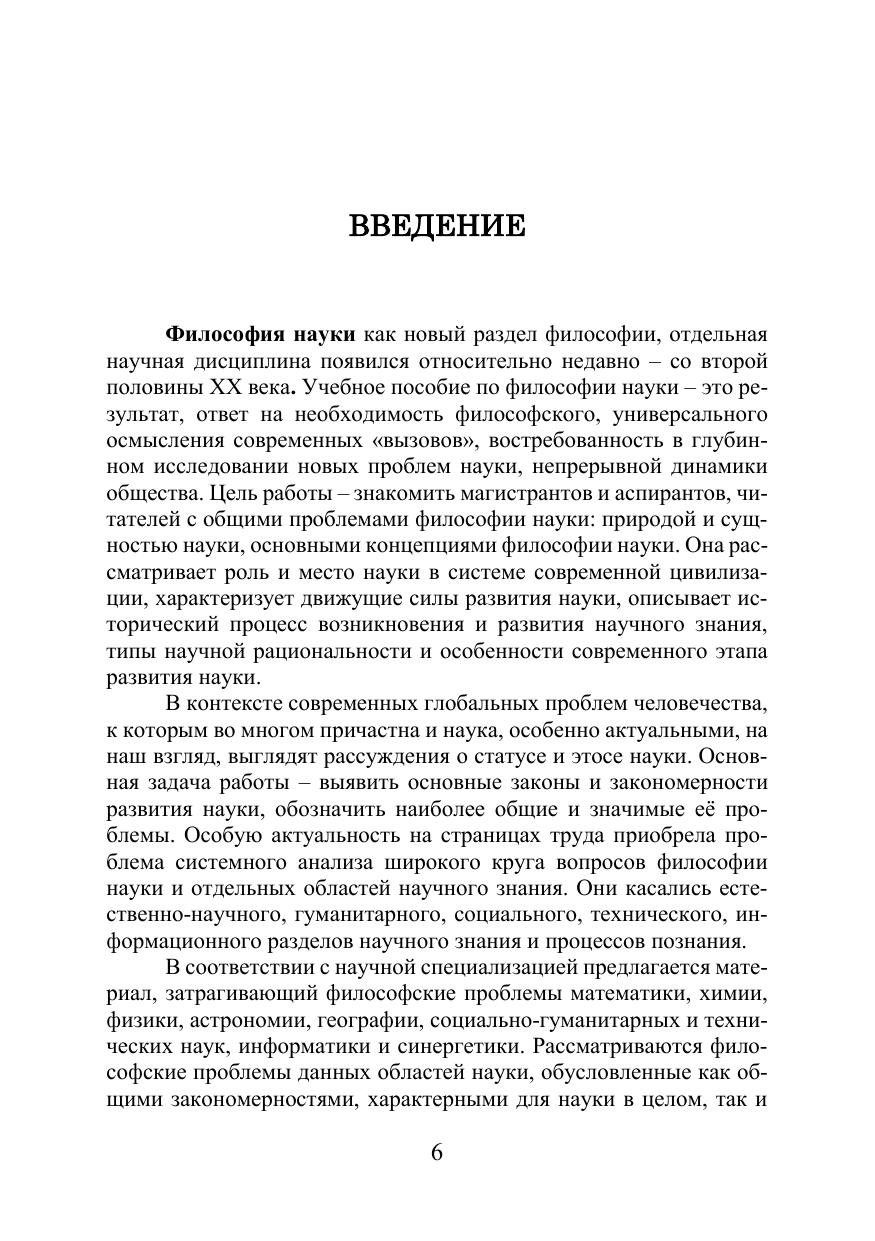 Учебное пособие посвящено исследованию философии науки. В по-собии рассматриваются основные понятия, содержание, сущность и специ-фика науки, исторические и современные аспекты ее бытия. Особое внима-ние обращено возникновению науки и ее эволюции, социальным функциям, структуре научного знания, вопросам научных революций и проблемам ди-намики науки. Даны основные концепции современной философии науки. Пособие соответствует актуальным требованиям Федерального госу-дарственного образовательного стандарта высшего образования и программе кандидатского экзамена для аспирантов и соискателей по дисциплине «Исто-рия и философия науки». Учебное пособие может быть использовано студен-тами, магистрантами, аспирантами и соискателями всех специальностей для подготовки к экзамену по истории и философии науки, философии и филосо-фии науки. Оно предназначено для магистрантов, аспирантов и соискателей разных специальностей, изучающих философию науки.