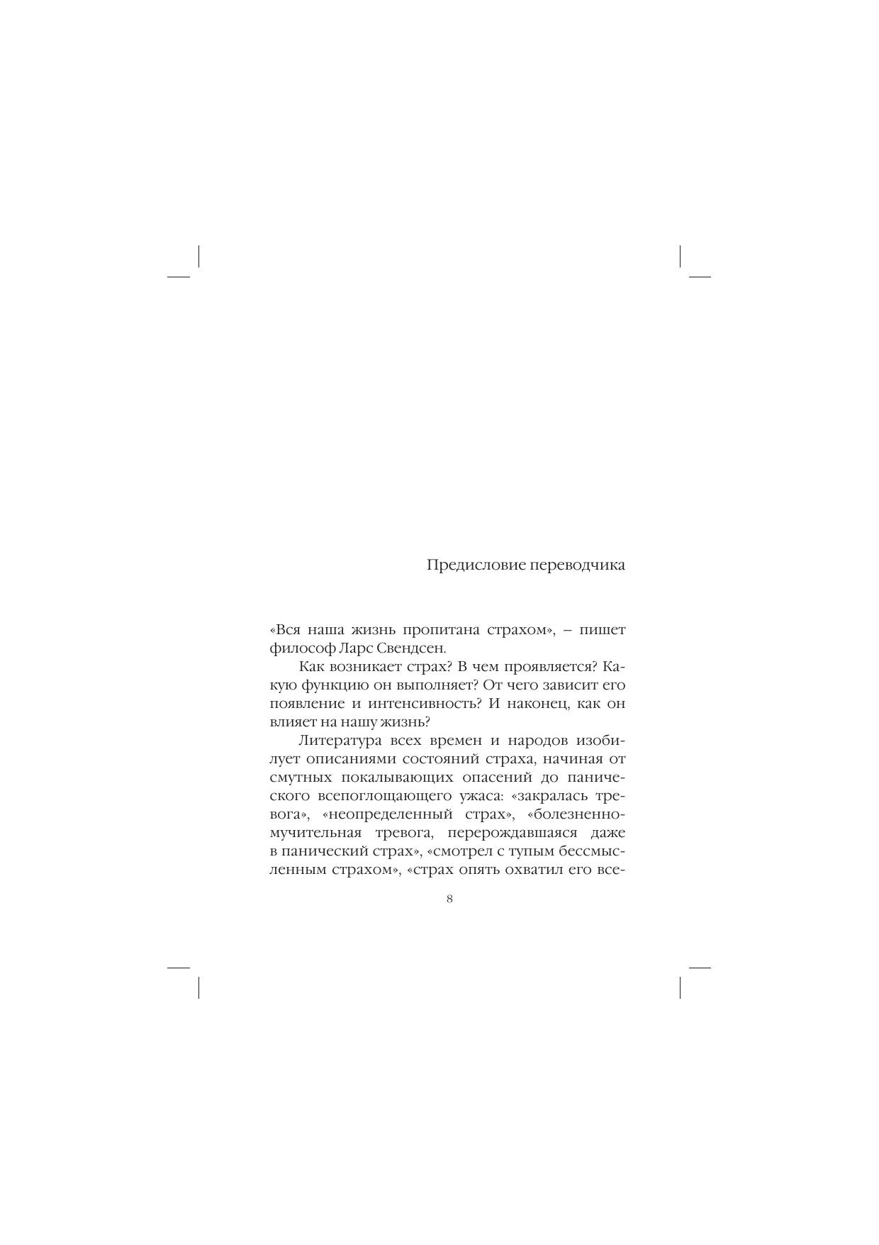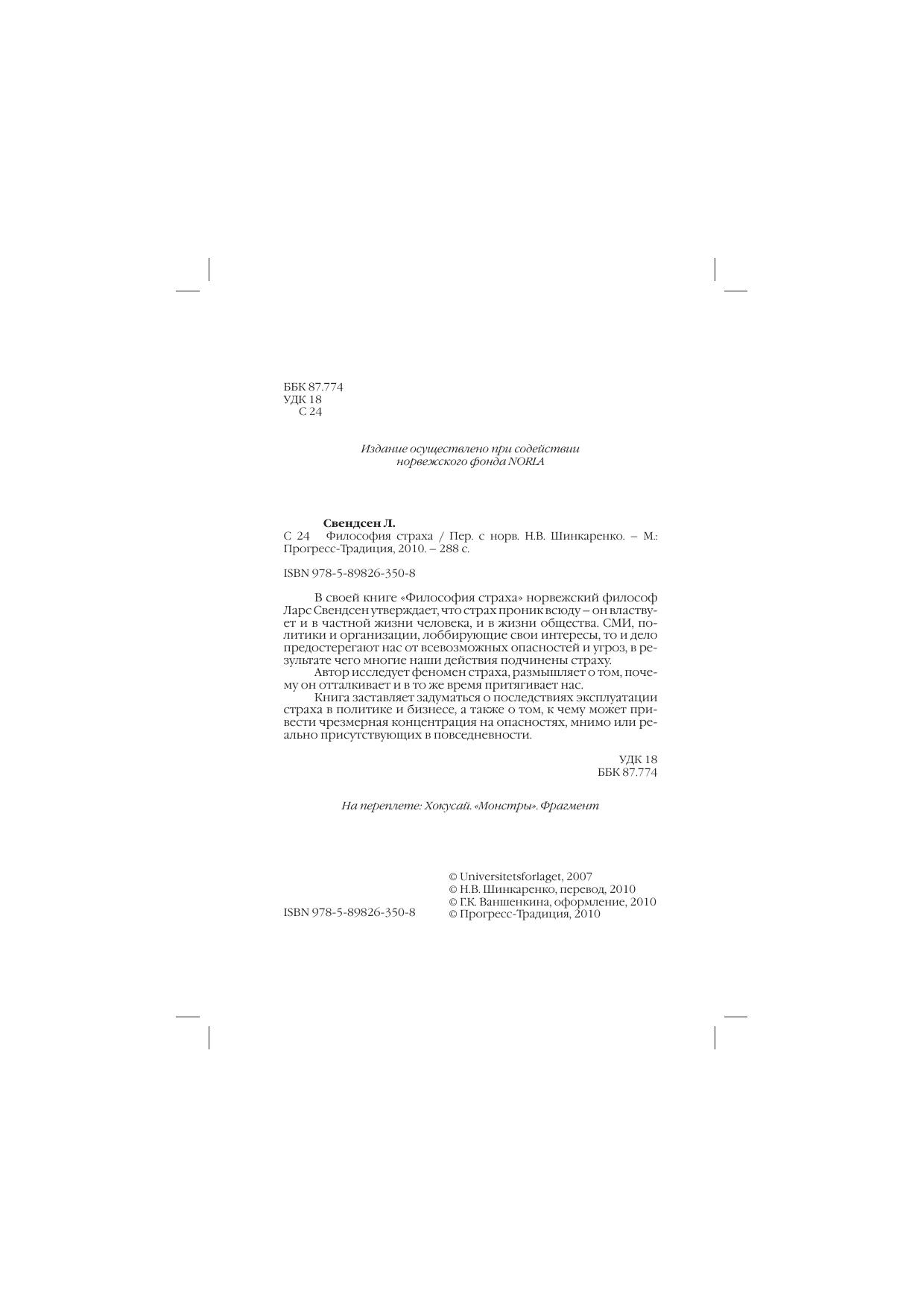 В своей книге "Философия страха" норвежский философ Ларс Свендсен утверждает, что страх проник всюду – он властвует и в частной жизни человека, и в жизни общества. СМИ, политики и организации, лоббирующие свои интересы, то и дело предостерегают нас от всевозможных опасностей и угроз, в результате чего многие наши действия подчинены страху.