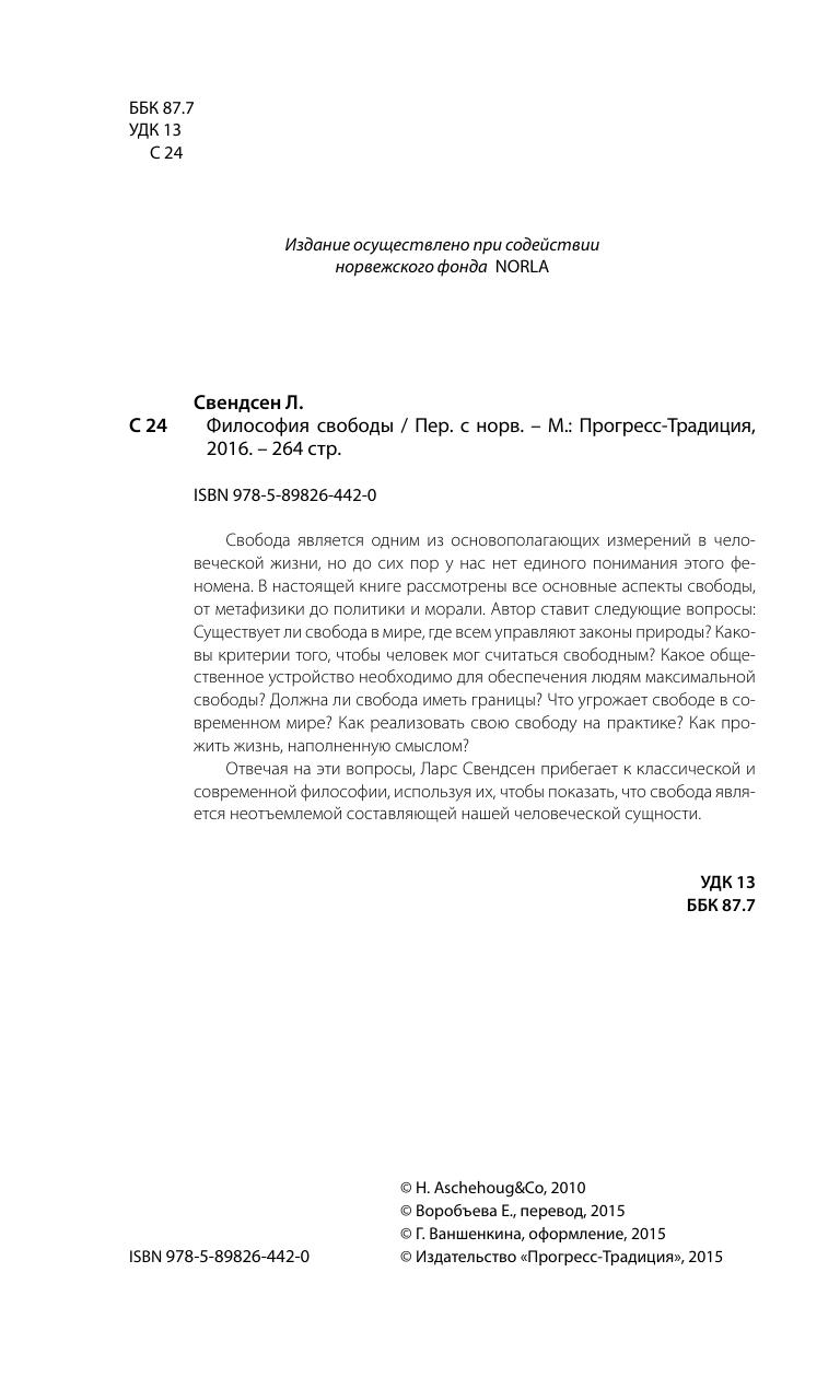 Отвечая на эти вопросы, Ларс Свендсен прибегает к классической и современной философии, используя их, чтобы показать, что свобода является неотъемлемой составляющей нашей человеческой сущности.