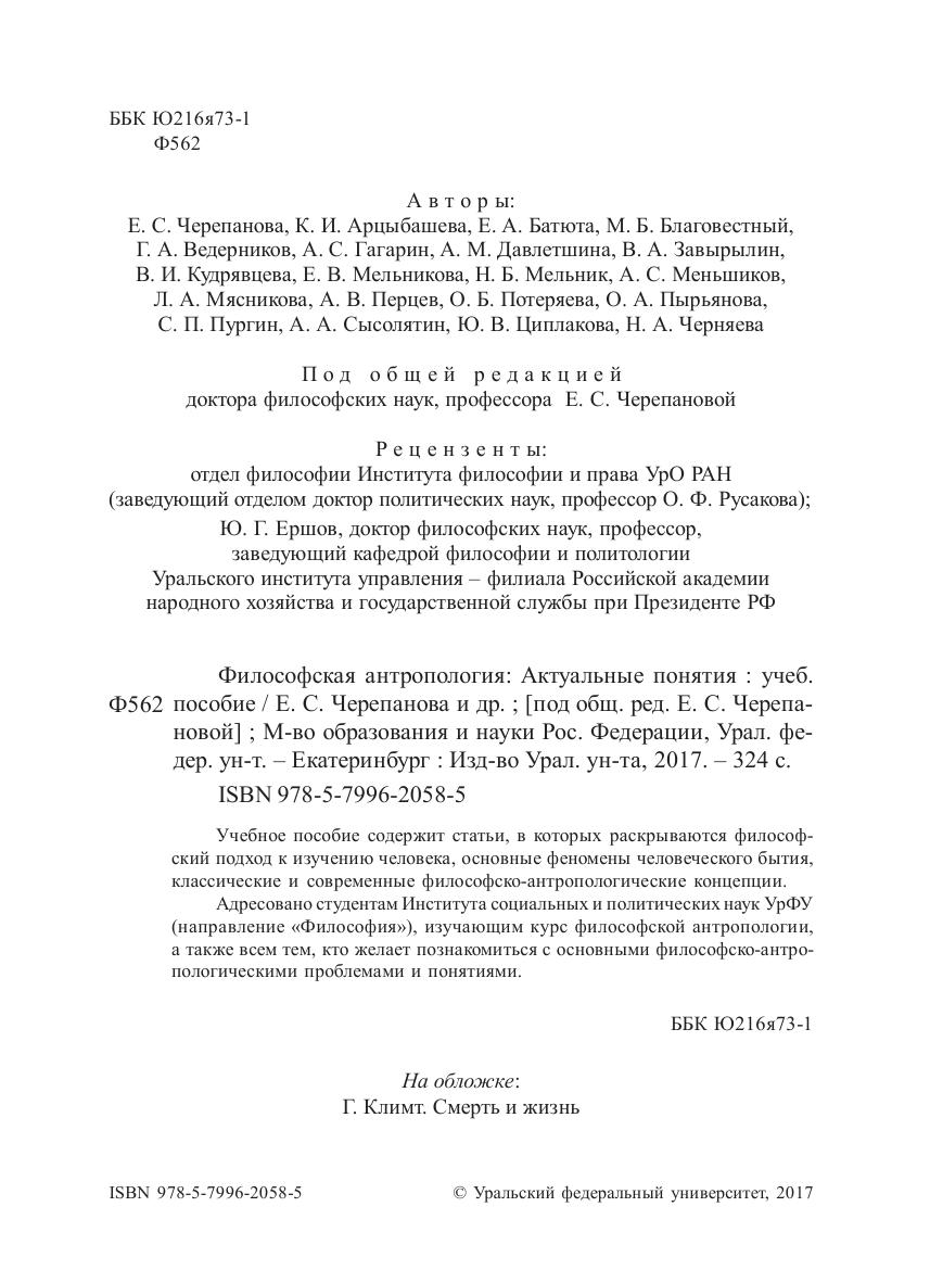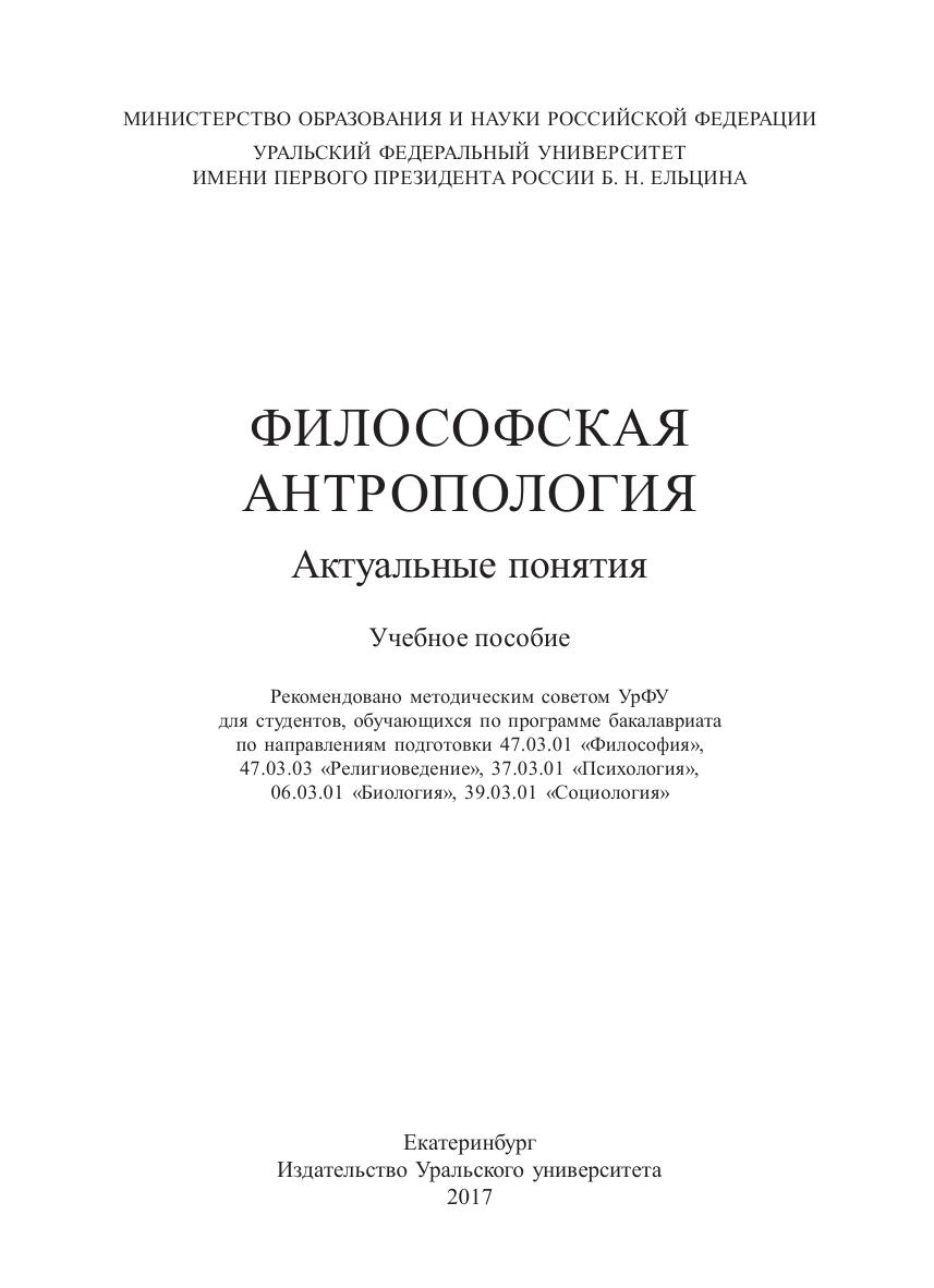 Учебное пособие содержит статьи, в которых раскрываются философский подход к изучению человека, основные феномены человеческого бытия, классические и современные философско-антропологические концепции. Адресовано студентам Института социальных и политических наук УрФУ (направление «Философия»), изучающим курс философской антропологии, а также всем тем, кто желает познакомиться с основными философско-антропологическими проблемами и понятиями.