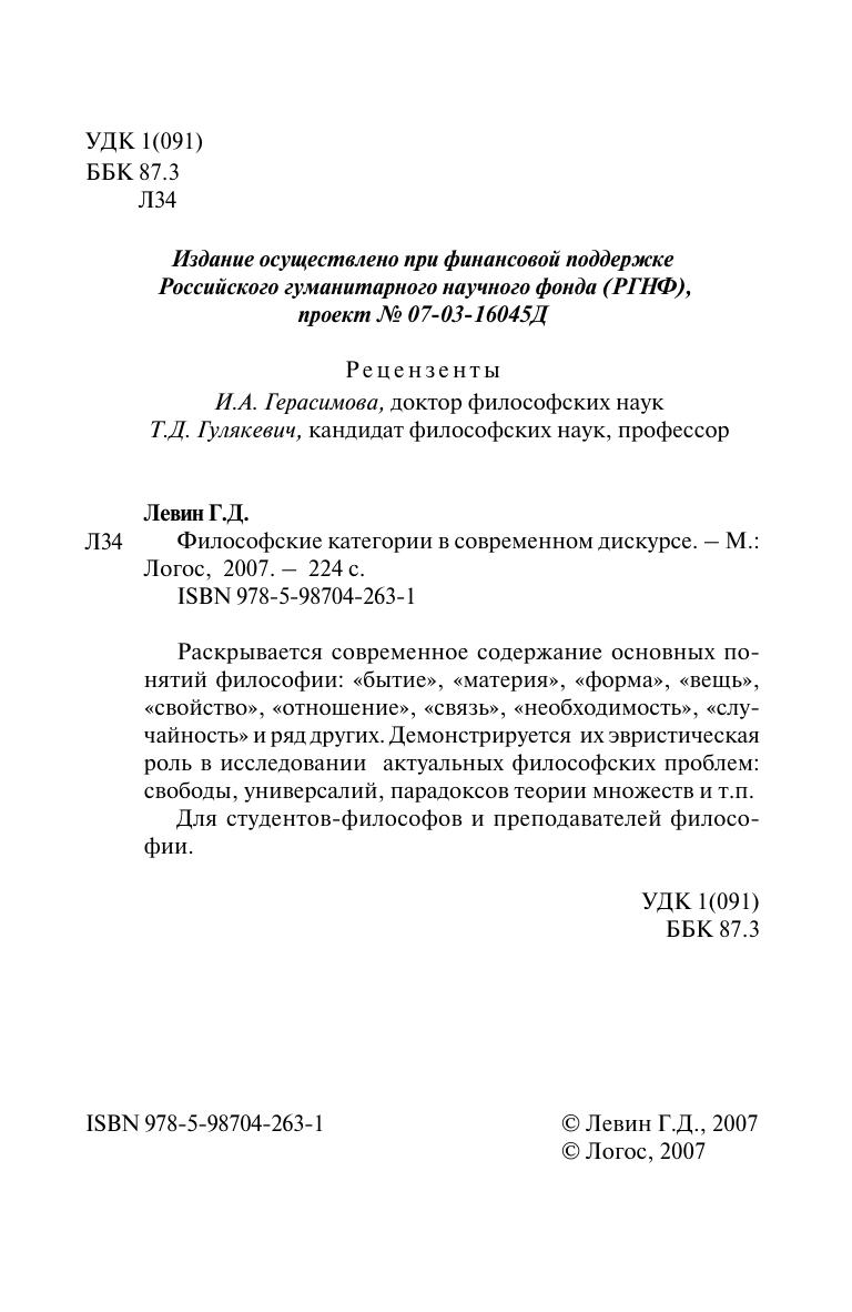 Раскрывается современное содержание основных понятий философии: «бытие», «материя», «форма», «вещь», «свойство», «отношение», «связь», «необходимость», «случайность» и ряд других. Демонстрируется их эвристическая роль в исследовании актуальных философских проблем: свободы, универсалий, парадоксов теории множеств и т.п. Для студентов-философов и преподавателей философии.