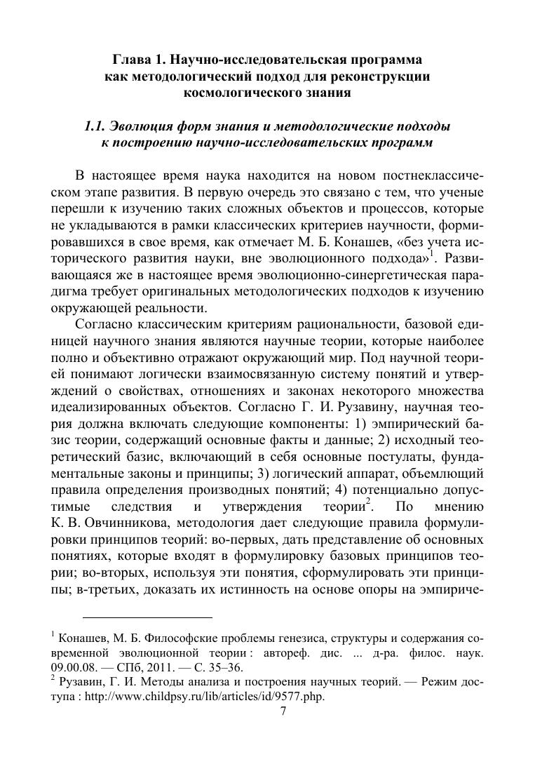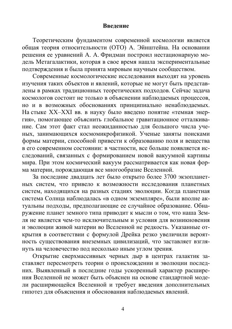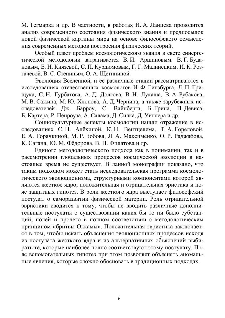 В монографии рассмотрены философские проблемы становления, содержания и структуры современной космологии. Введено в научный оборот понятие исследовательской программы эволюционизма как методологической основы для изучения процессов развития на различных уровнях структурной организации материи. Выявлены ее структурные компоненты. В роли жесткого ядра выступает философский принцип самоорганизации материи. Роль отрицательной эвристики сводится к тому, чтобы исключить методологические подходы, предполагающие существование чего-либо принципиально непознаваемого. Положительная эвристика требует объяснять эволюционные процессы, исходя из постулата жесткого ядра и из альтернативных объяснений, выбирать те, которые наиболее полно соответствуют этому постулату. Поясзащитных гипотез при этом служит для объяснения аномальных явлений, которые сложно обосновать в традиционных подходах. Монография может быть использована при изучении курсов «Естественнонаучная картина мира», «Концепции современного естествознания», «Философские вопросы естествознания», «Философские проблемы естествознания», «Философия и методология научного знания» (магистратура), а также полезна студентам направления подготовки «Философия», «Культурология», «Теология», учителям естествознания и возрождающегося в школе курса астрономии.