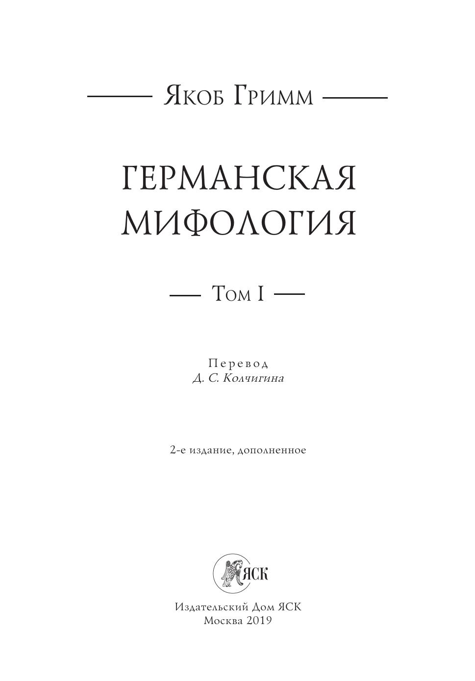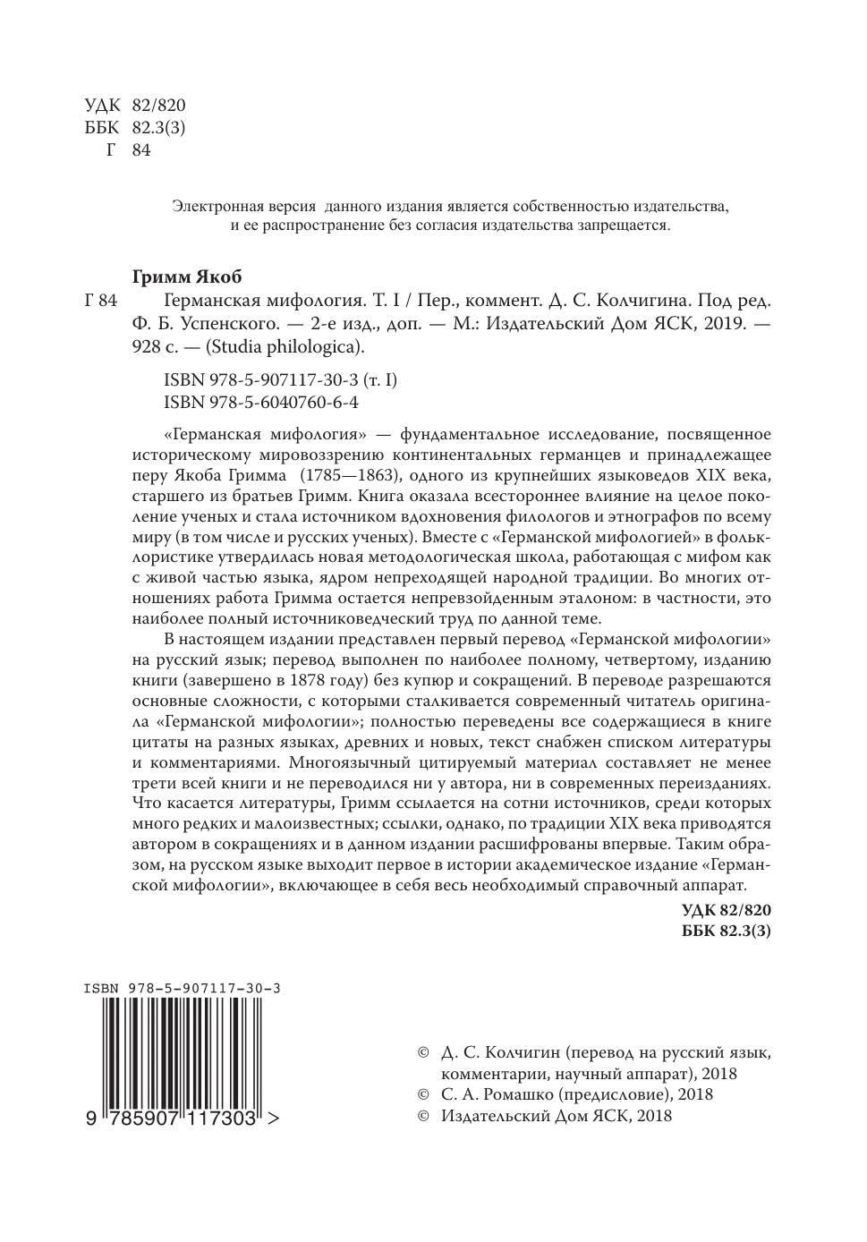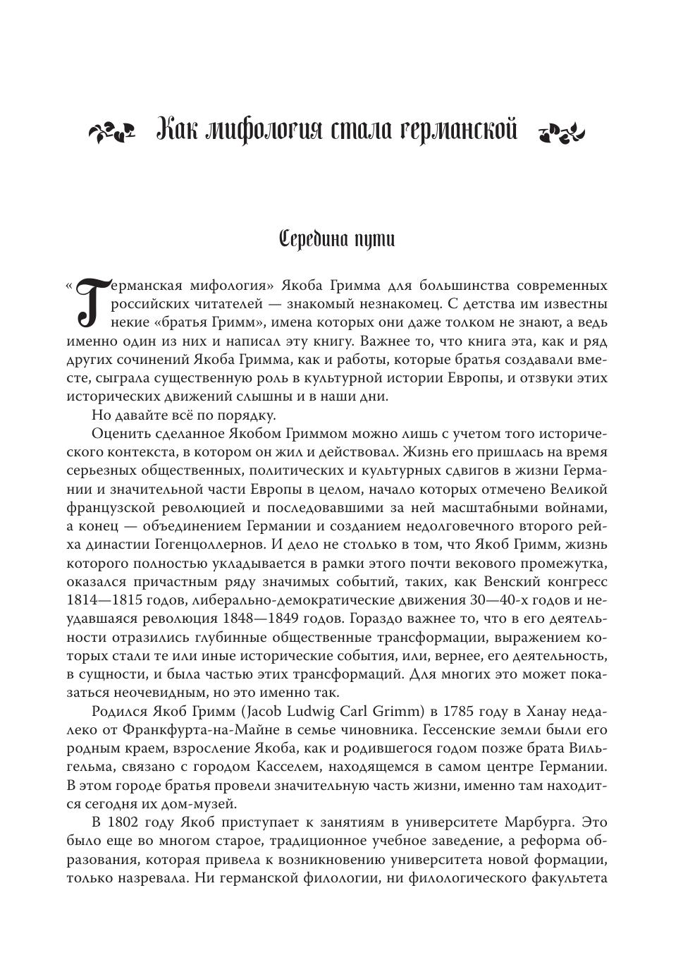 «Германская мифология» — фундаментальное исследование, посвященное историческому мировоззрению континентальных германцев и принадлежащее перу Якоба Гримма (1785—1863), одного из крупнейших языковедов XIX века, старшего из братьев Гримм. Книга оказала всестороннее влияние на целое поколение ученых и стала источником вдохновения филологов и этнографов по всему миру (в том числе и русских ученых). Вместе с «Германской мифологией» в фольклористике утвердилась новая методологическая школа, работающая с мифом как с живой частью языка, ядром непреходящей народной традиции. Во многих отношениях работа Гримма остается непревзойденным эталоном: в частности, это наиболее полный источниковедческий труд по данной теме. В настоящем издании представлен первый перевод «Германской мифологии» на русский язык, перевод выполнен по наиболее полному, четвертому, изданию книги (завершено в 1878 году) без купюр и сокращений. В переводе разрешаются основные сложности, с которыми сталкивается современный читатель оригинала «Германской мифологии», полностью переведены все содержащиеся в книге цитаты на разных языках, древних и новых, текст снабжен списком литературы и комментариями. Многоязычный цитируемый материал составляет не менее трети всей книги и не переводился ни у автора, ни в современных переизданиях. Что касается литературы, Гримм ссылается на сотни источников, среди которых много редких и малоизвестных, ссылки, однако, по традиции XIX века приводятся автором в сокращениях и в данном издании расшифрованы впервые. Таким образом, на русском языке выходит первое в истории академическое издание «Германской мифологии», включающее в себя весь необходимый справочный аппарат.
