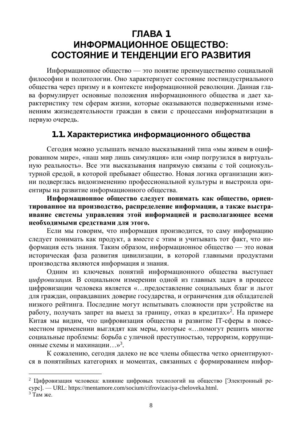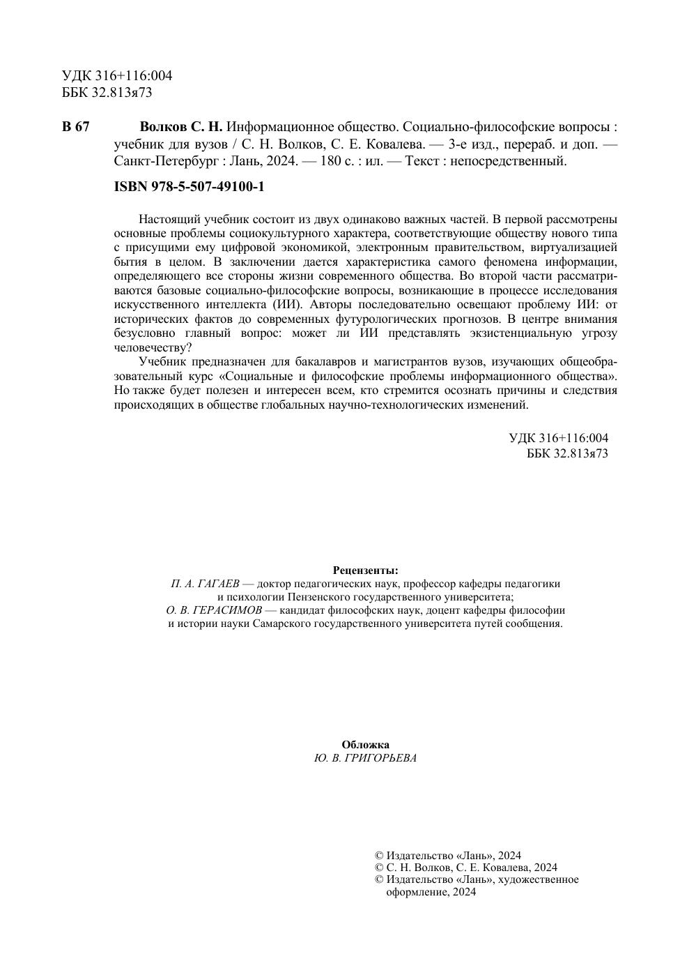Настоящий учебник состоит из двух одинаково важных частей. В первой рассмотрены основные проблемы социокультурного характера, соответствующие обществу нового типа с присущими ему цифровой экономикой, электронным правительством, виртуализацией бытия в целом. В заключении дается характеристика самого феномена информации, определяющего все стороны жизни современного общества. Во второй части рассматриваются базовые социально-философские вопросы, возникающие в процессе исследования искусственного интеллекта (ИИ). Авторы последовательно освещают проблему ИИ: от исторических фактов до современных футурологических прогнозов. В центре внимания безусловно главный вопрос: может ли ИИ представлять экзистенциальную угрозу человечеству? Учебник предназначен для бакалавров и магистрантов вузов, изучающих общеобразовательный курс «Социальные и философские проблемы информационного общества». Но также будет полезен и интересен всем, кто стремится осознать причины и следствия происходящих в обществе глобальных научно-технологических изменений.