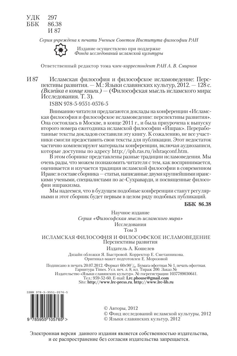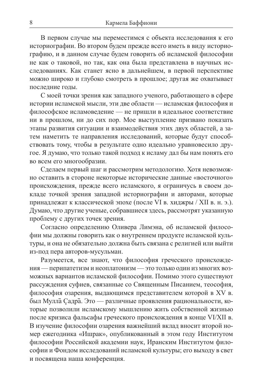 Вниманию читателя предлагаются доклады на конференции "Исламская философия и философское исламоведение: перспективы развития". Она состоялась в Москве, в конце 2011 г., и была приурочена к выпуску второго номера ежегодника исламской философии "Ишрак". Переработанные тексты докладов составили эту книгу. К сожалению, не все участники смогли предоставить свои тексты для публикации. Этот недостаток частично компенсируют материалы конференции, включая аудиозаписи, которые доступны по адресу http://iph.ras.ru/ishraqconf.htm. В этом сборнике представлены разные традиции исламоведения. Мы очень рады, что можем познакомить читателя с тем, как воспринимается, оценивается и изучается традиция исламской философии в современном Иране: в составе сборника - статьи, написанные двумя крупшейшими иранскими учеными, специалистами по ас-Сухраварди, и посвященные философии ишракизма.