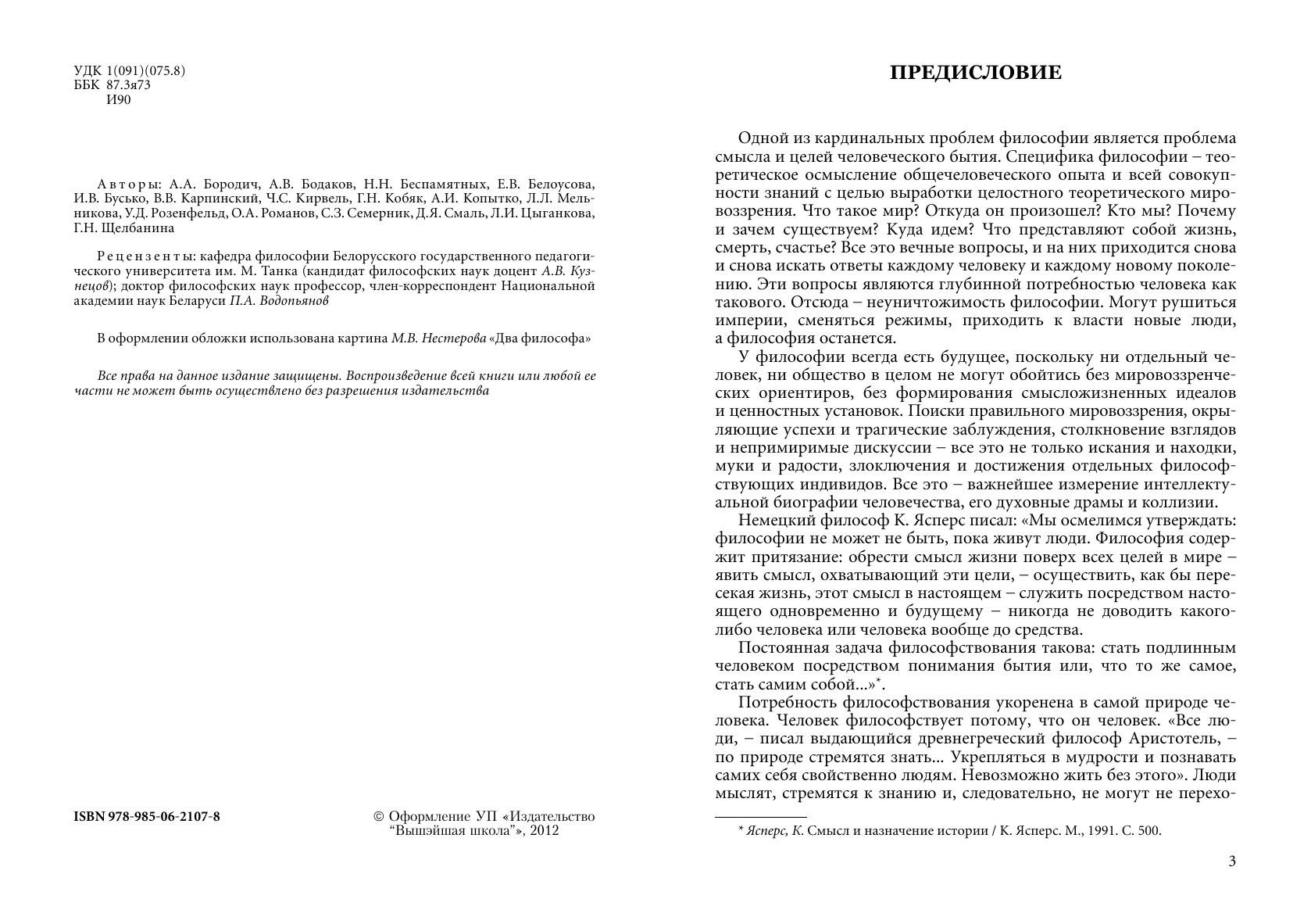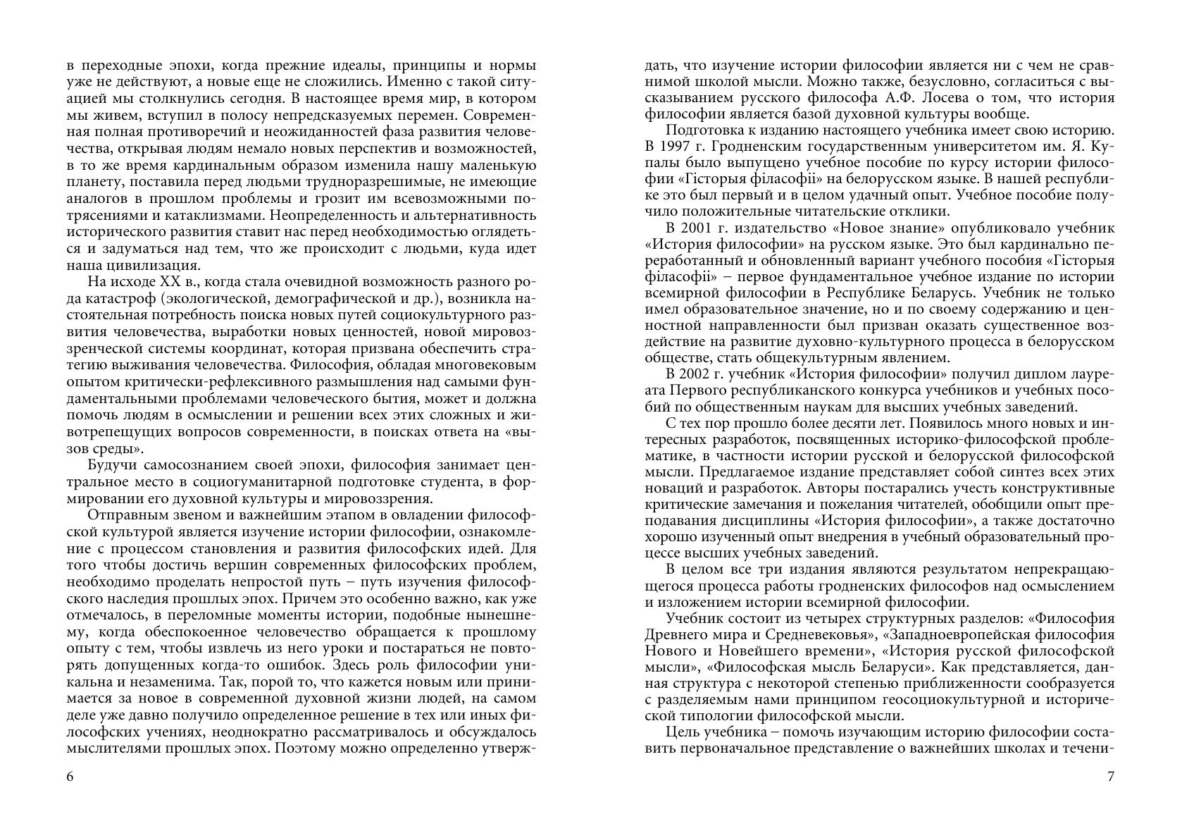 Дается систематическое изложение развития мировой философской мысли. Включает разделы: "Философия Древнего мира и Средневековья", "Западноевропейская философия Нового и Новейшего времени", "История русской философской мысли", "Философская мысль Беларуси". Раскрывает сложные коллизии становления и развития теоретического мировоззрения, знакомит с основными философскими направлениями, течениями и школами. Учтены новейшие подходы к объяснению сущности и характера историко-философского процесса. Для студентов, магистрантов, аспирантов социально-гуманитарных специальностей, всех, кого интересует философия.