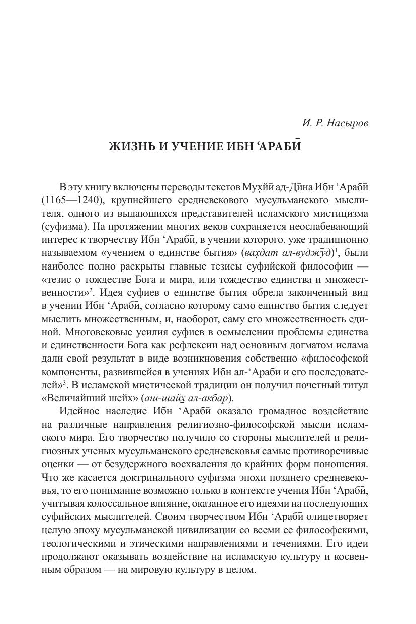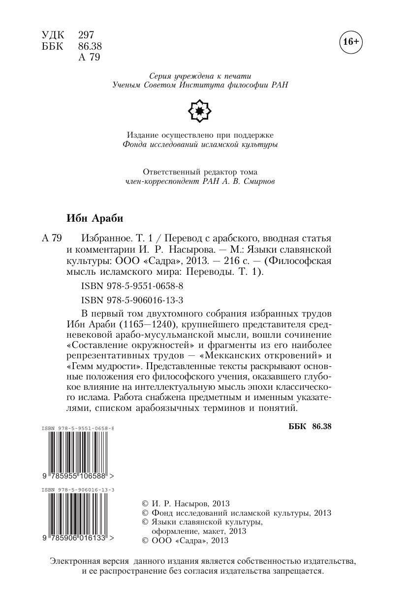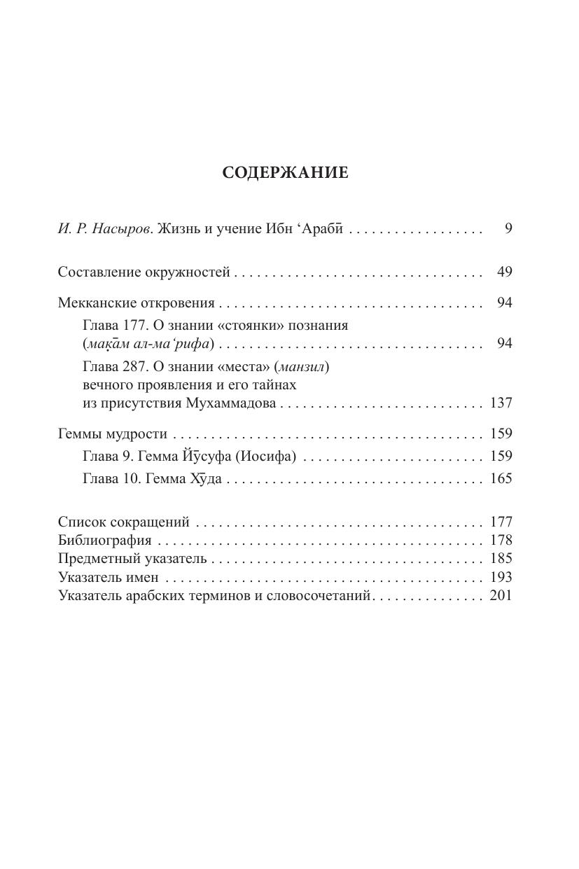 В первый том двухтомного собрания избранных трудов Ибн Араби (1165—1240), крупнейшего представителя средневековой арабо-мусульманской мысли, вошли сочинение «Составление окружностей» и фрагменты из его наиболее репрезентативных трудов — «Мекканских откровений» и «Гемм мудрости». Представленные тексты раскрывают основные положения его философского учения, оказавшего глубокое влияние на интеллектуальную мысль эпохи классического ислама. Работа снабжена предметным и именным указателями, списком арабоязычных терминов и понятий.