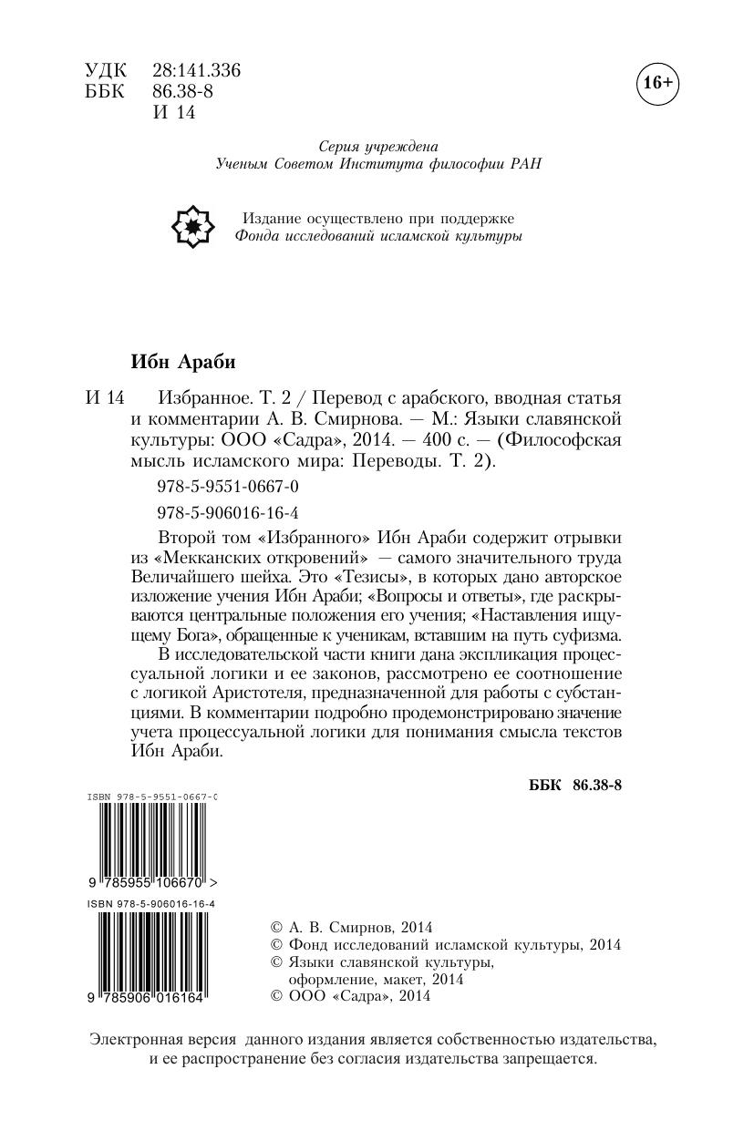 Второй том «Избранного» Ибн Араби содержит отрывки из «Мекканских откровений» — самого значительного труда Величайшего шейха. Это «Тезисы», в которых дано авторское изложение учения Ибн Араби, «Вопросы и ответы», где раскрываются центральные положения его учения, «Наставления ищущему Бога», обращенные к ученикам, вставшим на путь суфизма. В исследовательской части книги дана экспликация процессуальной логики и ее законов, рассмотрено ее соотношение с логикой Аристотеля, предназначенной для работы с субстанциями. В комментарии подробно продемонстрировано значение учета процессуальной логики для понимания смысла текстов Ибн Араби.
