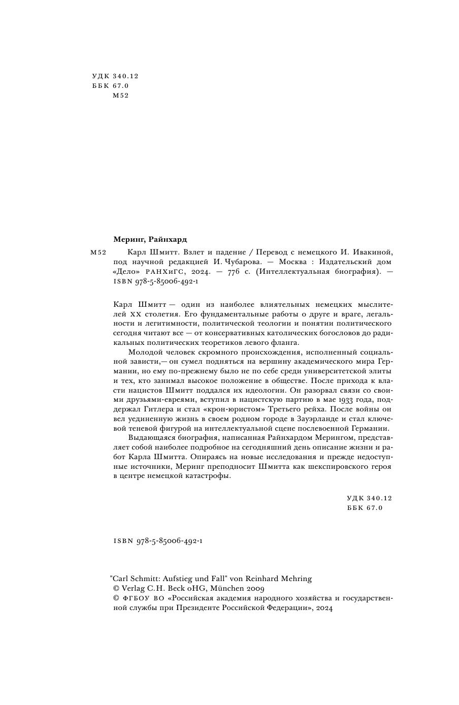 Карл Шмитт — один из наиболее влиятельных немецких мыслителей XX столетия. Его фундаментальные работы о друге и враге, легальности и легитимности, политической теологии и понятии политического сегодня читают все — от консервативных католических богословов до радикальных политических теоретиков левого фланга. Молодой человек скромного происхождения, исполненный социальной зависти, — он сумел подняться на вершину академического мира Германии, но ему по-прежнему было не по себе среди университетской элиты и тех, кто занимал высокое положение в обществе. После прихода к власти нацистов Шмитт поддался их идеологии. Он разорвал связи со своими друзьями-евреями, вступил в нацистскую партию в мае 1933 года, поддержал Гитлера и стал «крон-юристом» Третьего рейха. После войны он вел уединенную жизнь в своем родном городе в Зауэрланде и стал ключевой теневой фигурой на интеллектуальной сцене послевоенной Германии. Выдающаяся биография, написанная Райнхардом Мерингом, представляет собой наиболее подробное на сегодняшний день описание жизни и работ Карла Шмитта. Опираясь на новые исследования и прежде недоступные источники, Меринг преподносит Шмитта как шекспировского героя в центре немецкой катастрофы.