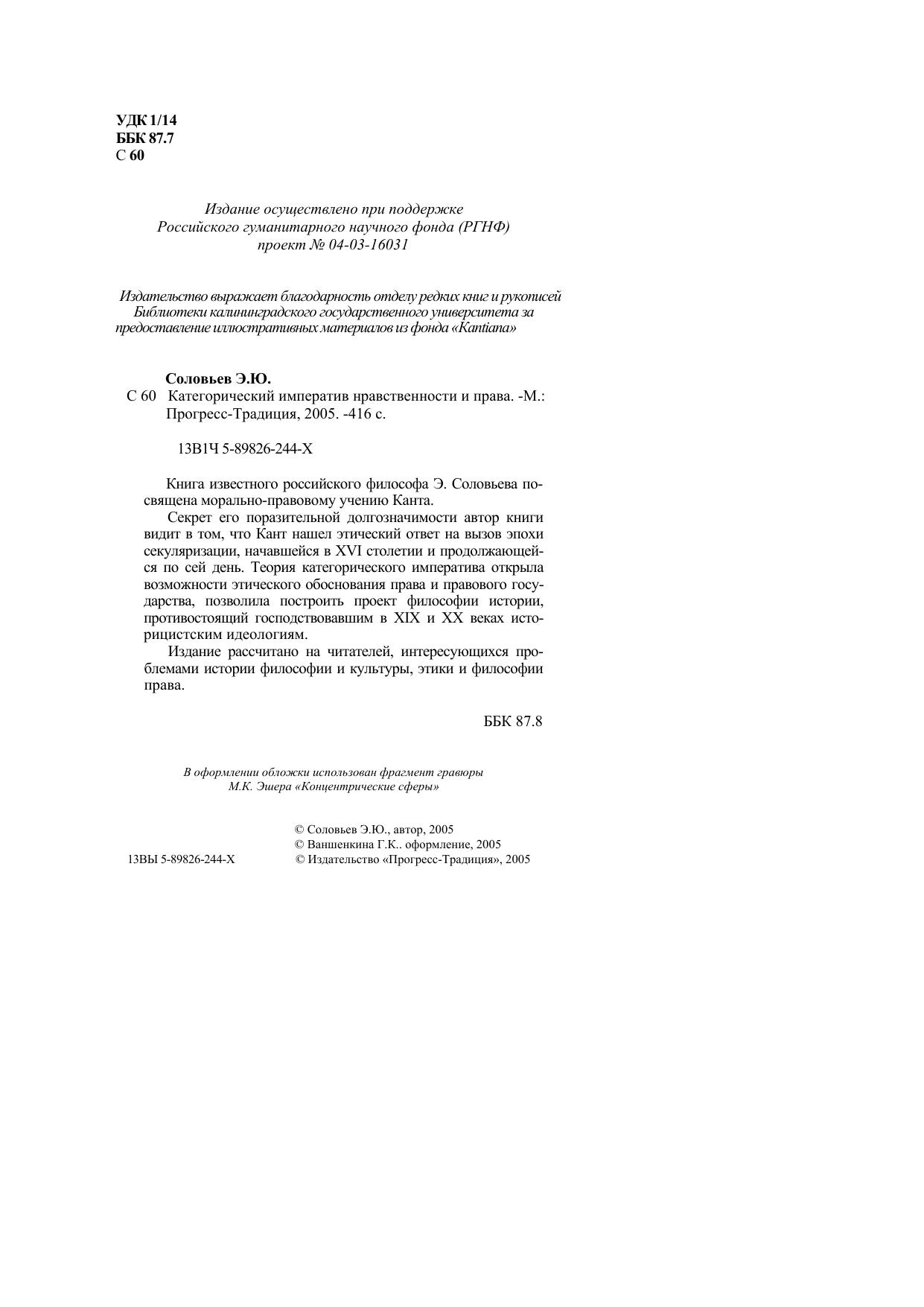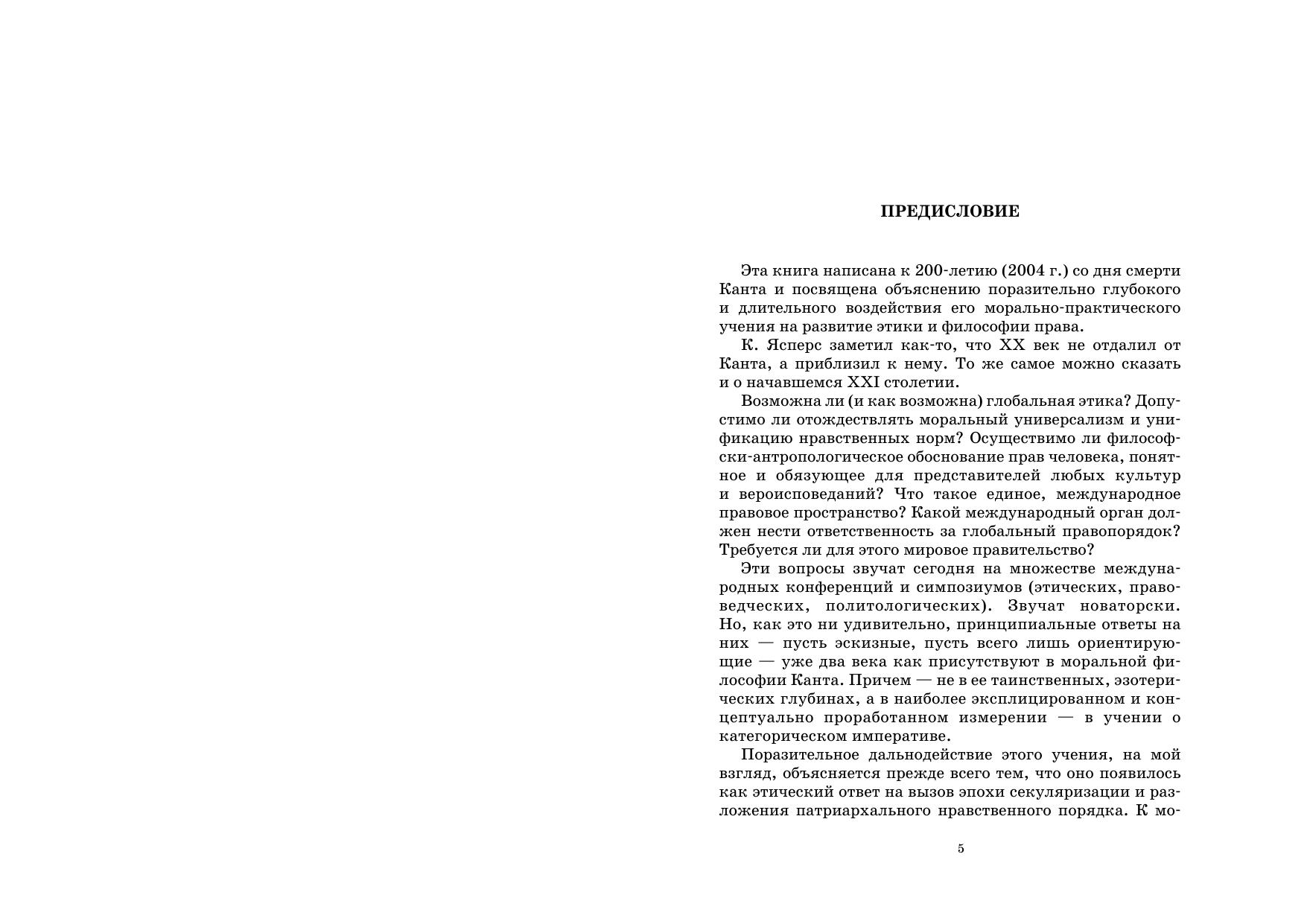 Книга известного российского философа Э. Соловьева посвящена морально-правовому учению Канта. Секрет его поразительной долгозначимости автор книги видит в том, что Кант нашел этический ответ на вызов эпохи секуляризации, начавшейся в XVI столетии и продолжающейся по сей день. Теория категорического императива открыла возможности этического обоснования права и правового государства, позволила построить проект философии истории, противостоящий господствовавшим в XIX и XX веках историцистским идеологиям. Издание рассчитано на читателей, интересующихся проблемами истории философии и культуры, этики и философии права.