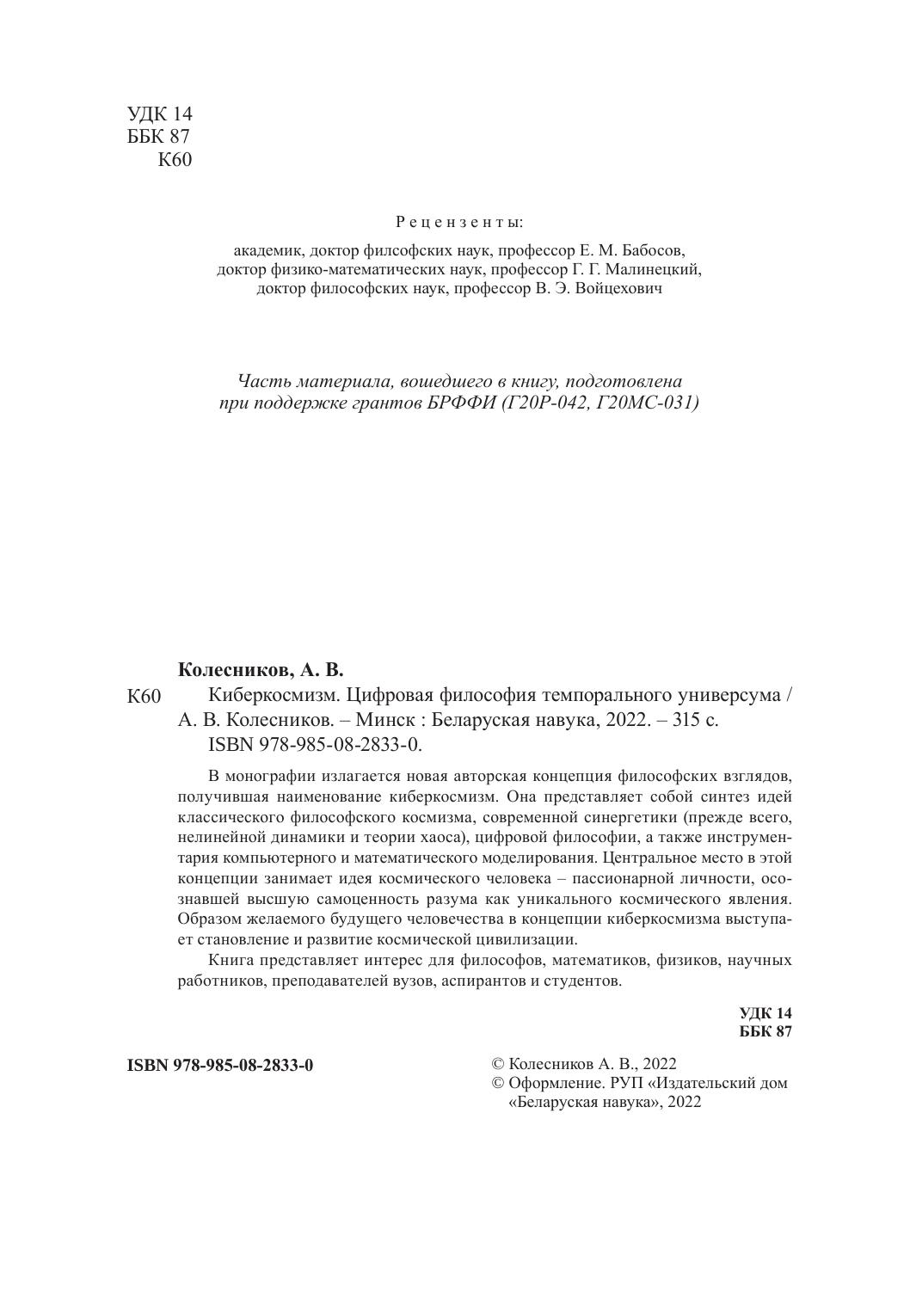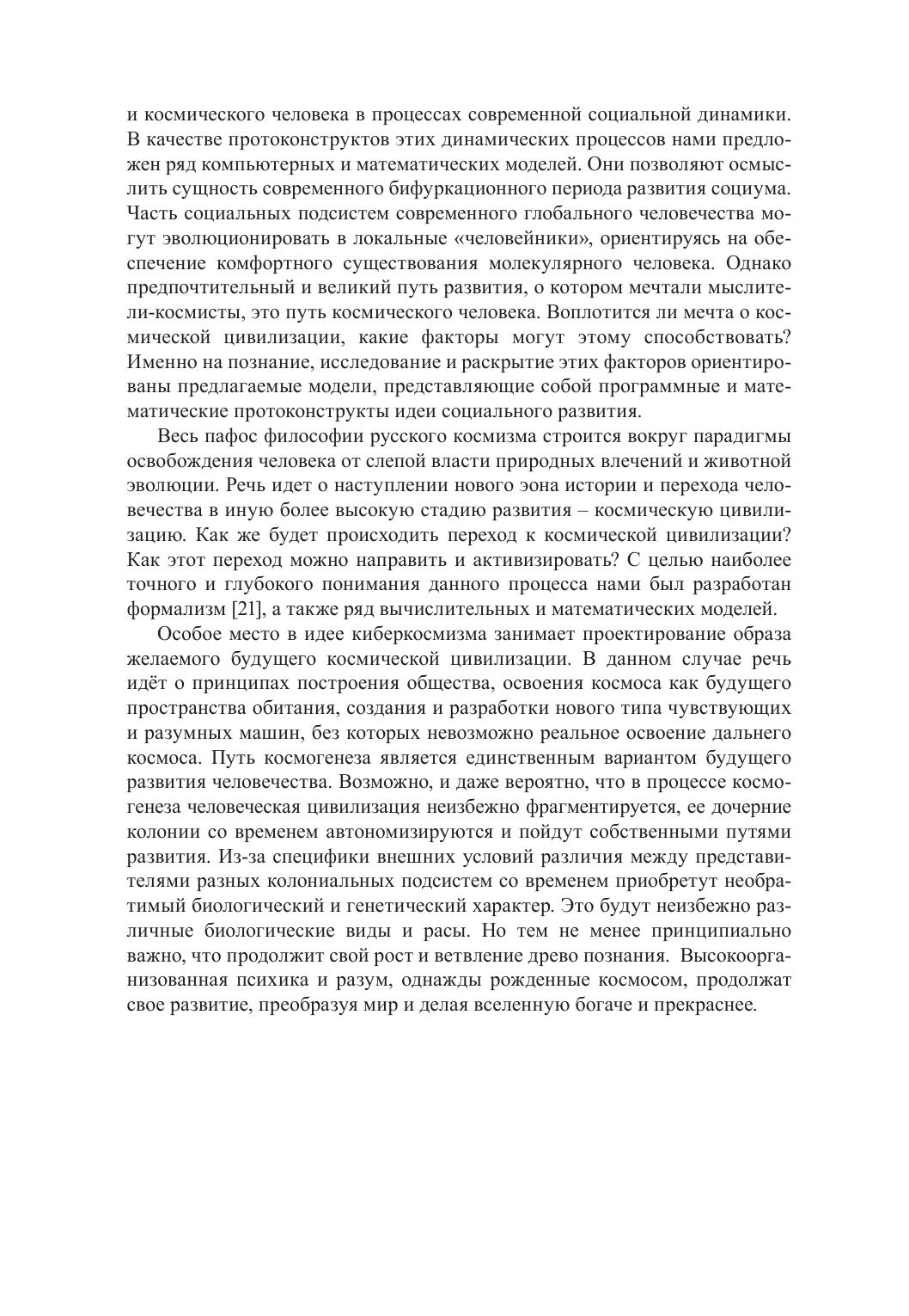 В монографии излагается новая авторская концепция философских взглядов, получившая наименование киберкосмизм. Она представляет собой синтез идей классического философского космизма, современной синергетики (прежде всего, нелинейной динамики и теории хаоса), цифровой философии, а также инструментария компьютерного и математического моделирования. Центральное место в этой концепции занимает идея космического человека – пассионарной личности, осознавшей высшую самоценность разума как уникального космического явления. Образом желаемого будущего человечества в концепции киберкосмизма выступает становление и развитие космической цивилизации. Книга представляет интерес для философов, математиков, физиков, научных работников, преподавателей вузов, аспирантов и студентов.