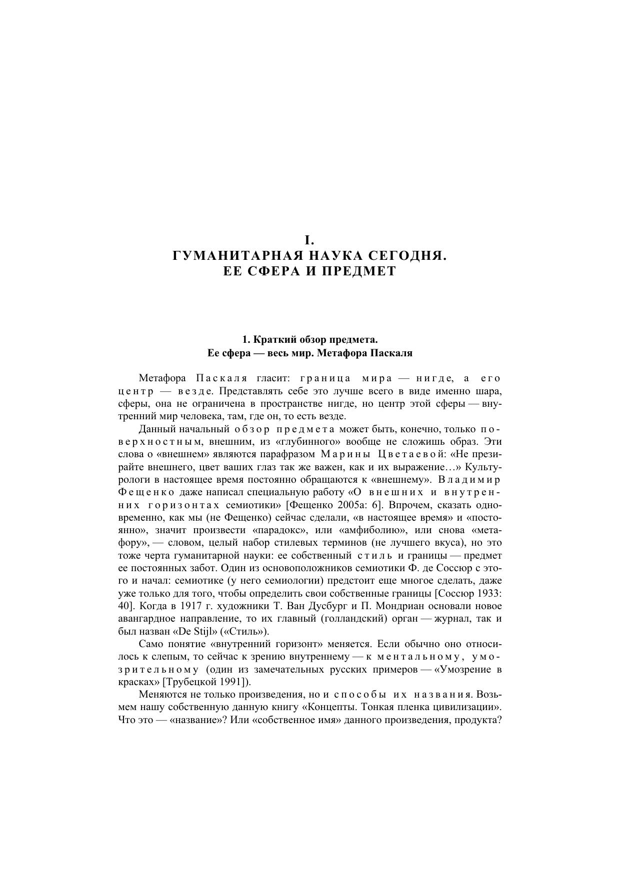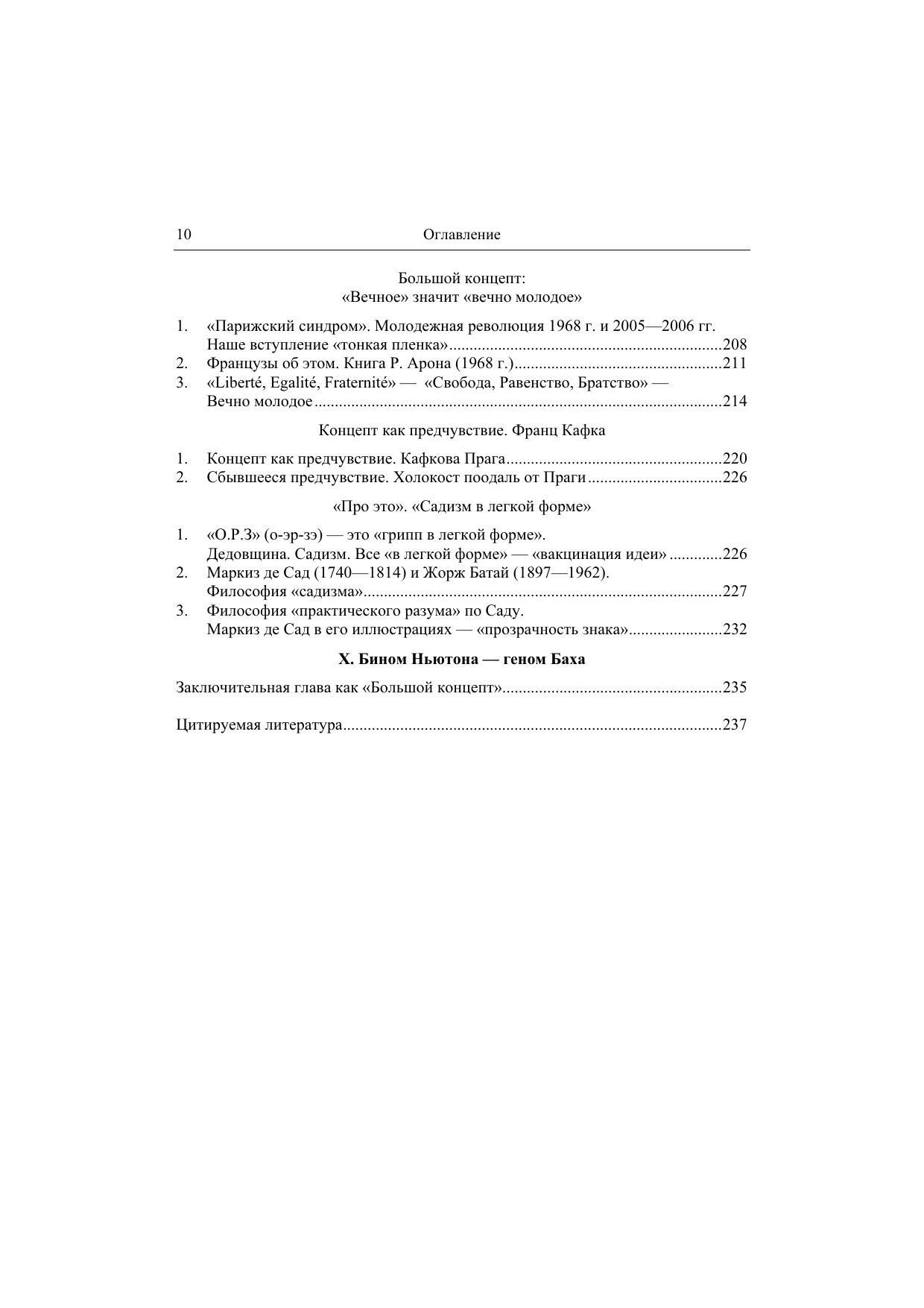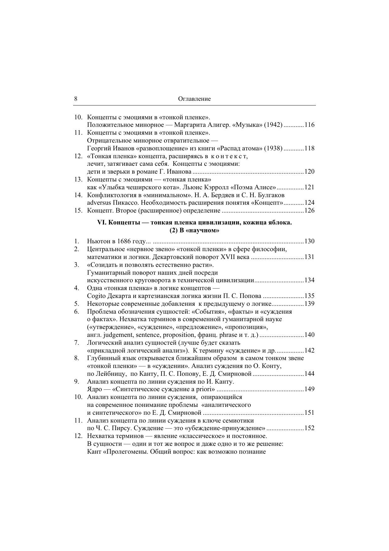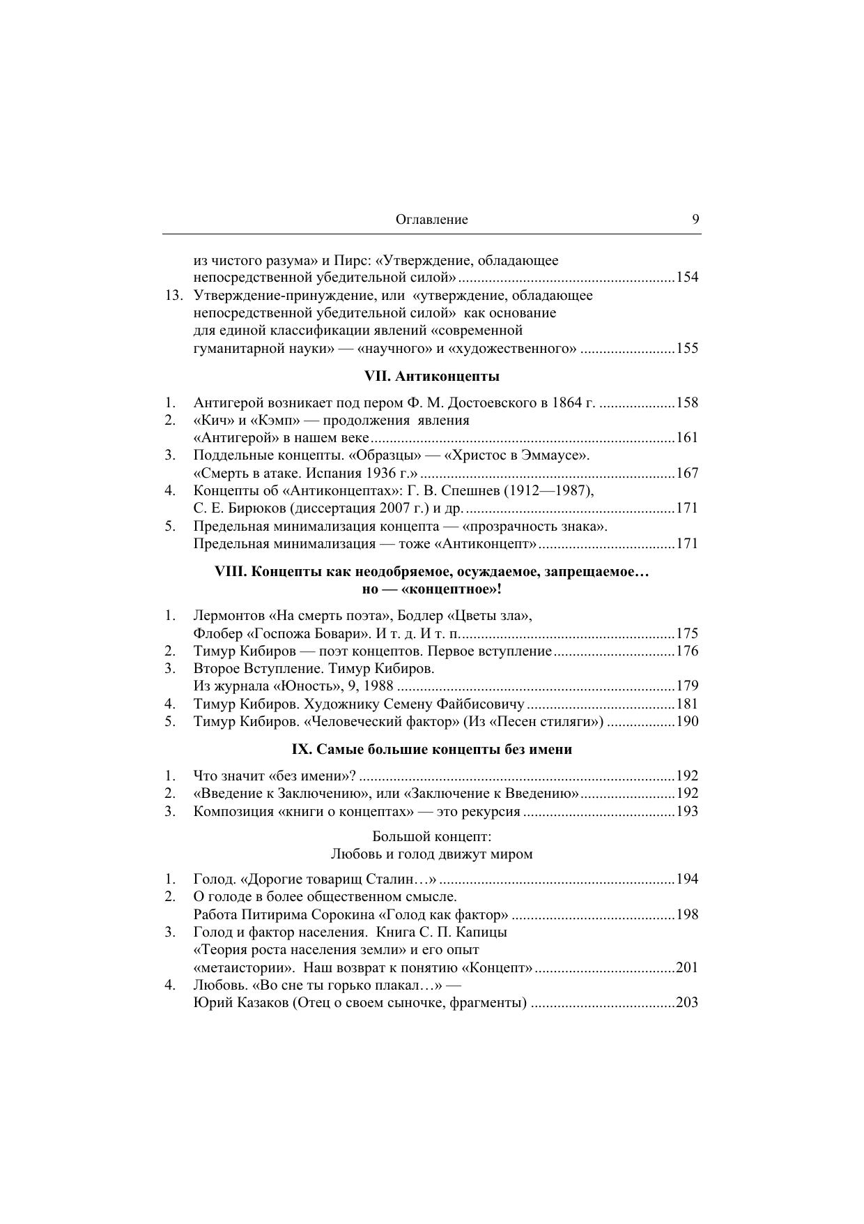 Ключевым термином этой книги является концепт. Под концептом понимается явление культуры, родственное «понятию» в логике, психологии и философии, исторически – «идеям» Платона. «Идеи – словесные образы бытия, имена – их осуществление» (о. Сергей Булгаков, 1953). Осуществление концепта – это прежде всего его имя, но часто, притом в самых важных случаях, просто фраза, целое высказывание, бытовое, музыкальное или живописное, картина или даже нечто несловесное, «недискретное». В нашей книге с этой целью введены две внетекстовые цветные вклейки, как бы «две книги внутри книги». Изучение концептов состоит не в классификации их «осуществлений», а в раскрытии их внутренних мыслительных связей. Поэтому внешним образом книга делится на «главы» (I, II … IX), а внутренне, концептуально на темы, которые проходят сквозь главы, пересекают их: «Концепты» и «Антиконцепты», «Минимализация в литературе и искусстве», «Научное и Художественное», «Любовь и голод движут миром», «Сексуальная философия по Саду („садизм“)» и т. д. В совокупности концептов и их тем открывается какое-то новое состояние общественной духовной жизни, не нашедшее еще общего «имени» («Новая антропология»? «Новая семиотика культуры»? «Цивилизация духа»?).