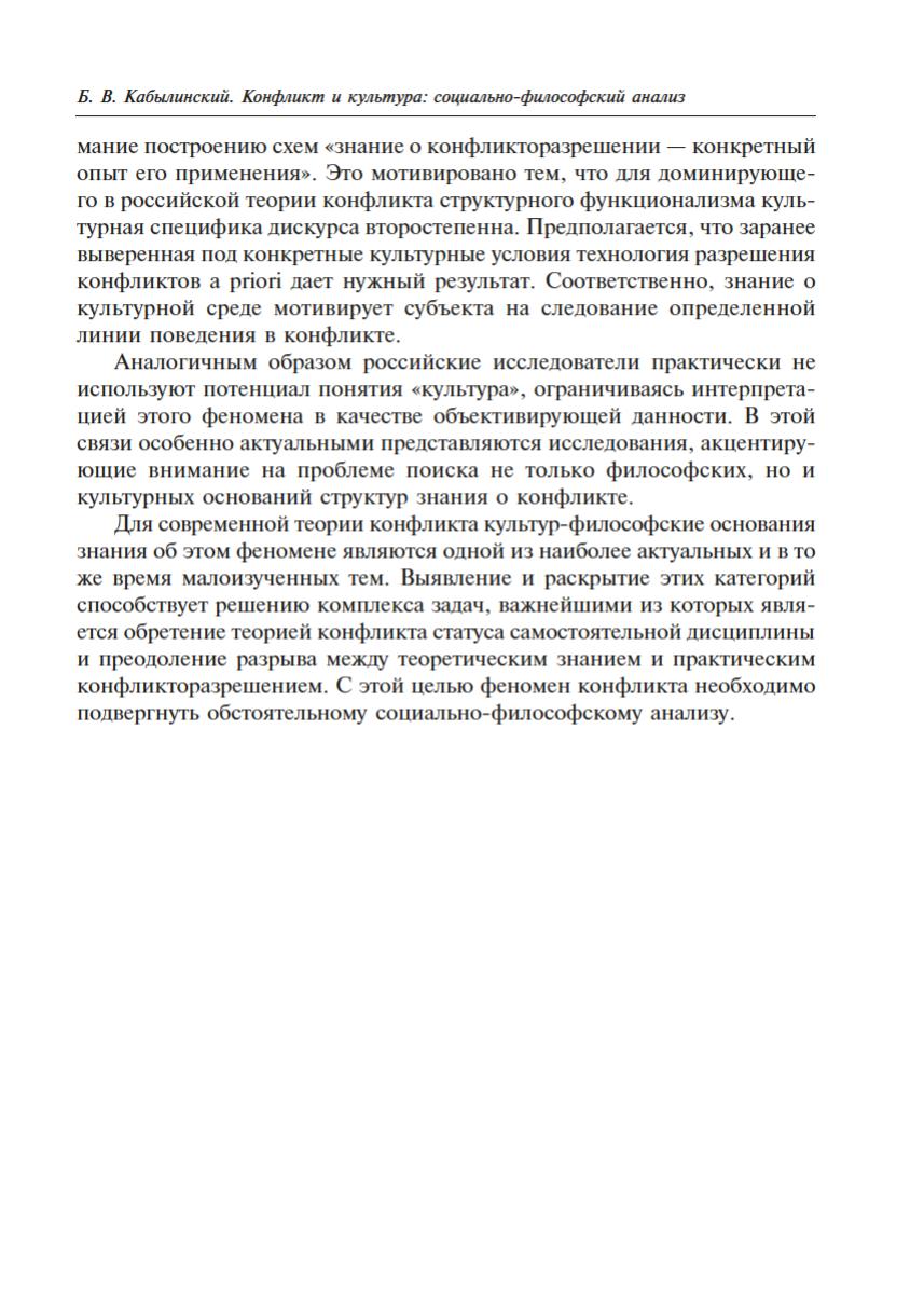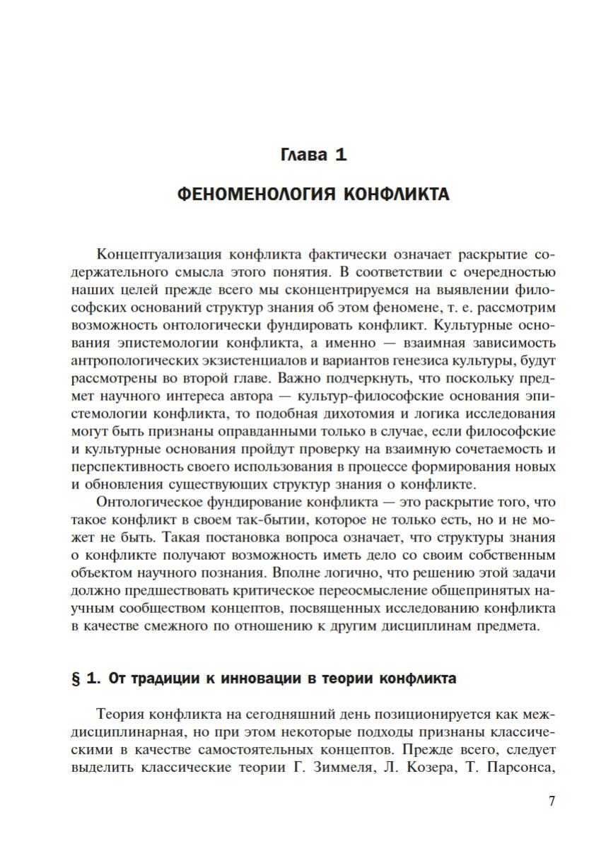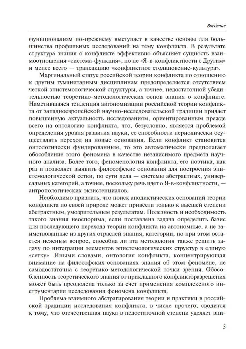 Отличительной чертой новейшей исследовательской школы изучения конфликта является убежденность в том, что сопряженная с конфликтом проблематика сугубо акцидентальна. Наметившаяся тенденция автономизации российской теории конфликта от западноевропейской научно-исследовательской традиции придает повышенную актуальность исследованиям, ориентированным, прежде всего, на онтологию конфликта, что, безусловно, является проблемой определения уровня развития науки, ее способности периодически осуществлять переход на новые основания. Для современной теории конфликта культурфилософские основания знания об этом феномене являются одной из наиболее актуальных и в то же время малоизученных тем. Выявление и раскрытие этих категорий способствует решению комплекса задач, важнейшими из которых является обретение теорией конфликта статуса самостоятельной дисциплины и преодоление разрыва между теоретическим знанием и практическим конфликторазрешением. С этой целью феномен конфликта подвергается в монографии обстоятельному социально-философскому анализу