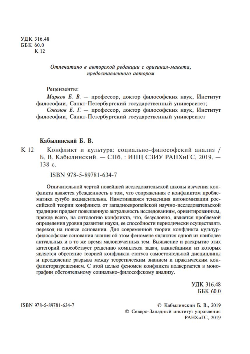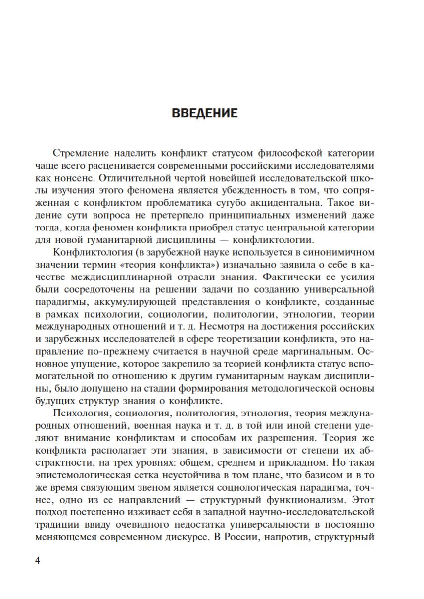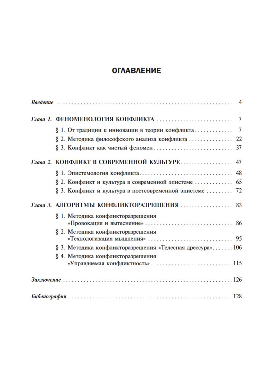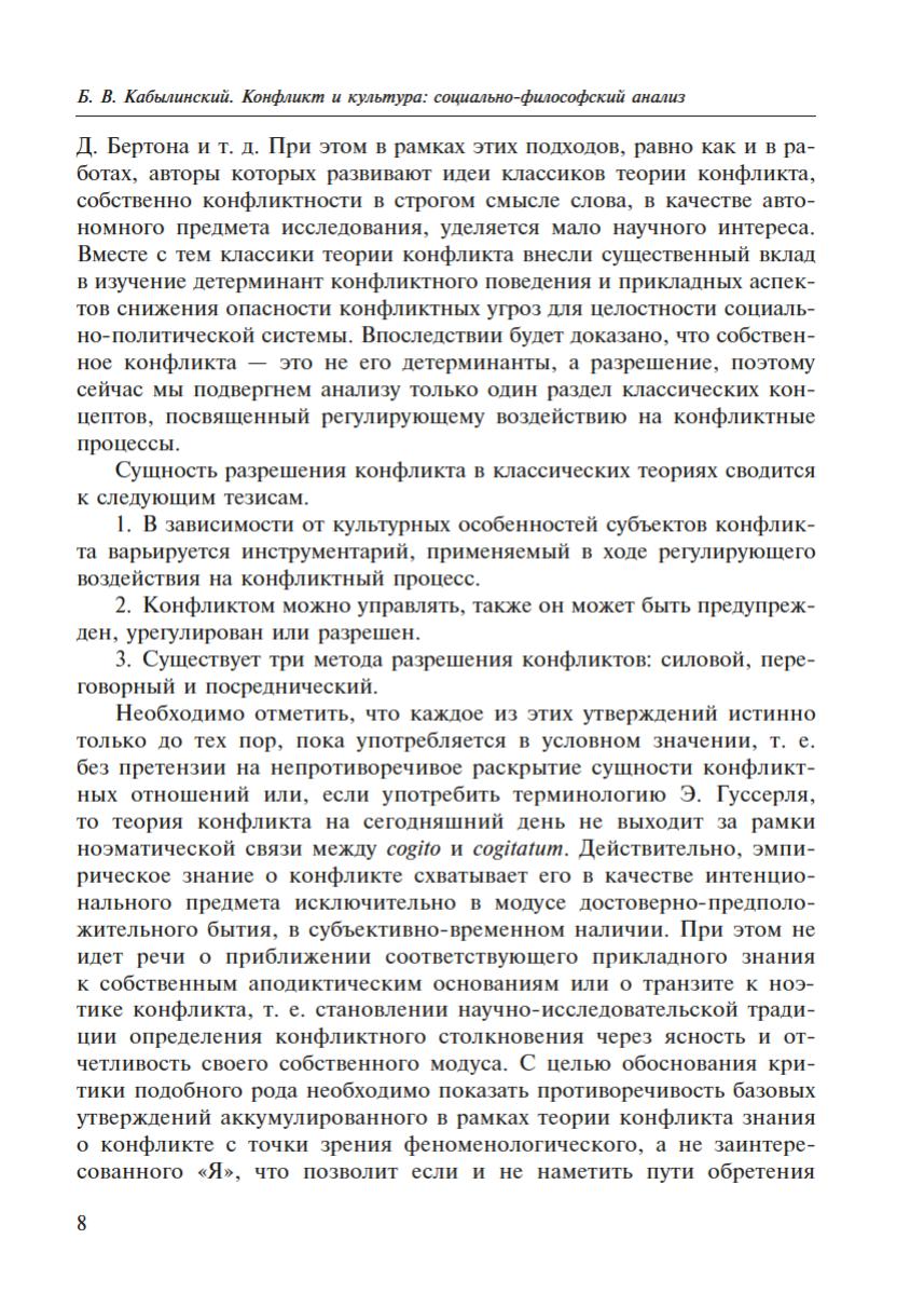 Отличительной чертой новейшей исследовательской школы изучения конфликта является убежденность в том, что сопряженная с конфликтом проблематика сугубо акцидентальна. Наметившаяся тенденция автономизации российской теории конфликта от западноевропейской научно-исследовательской традиции придает повышенную актуальность исследованиям, ориентированным, прежде всего, на онтологию конфликта, что, безусловно, является проблемой определения уровня развития науки, ее способности периодически осуществлять переход на новые основания. Для современной теории конфликта культурфилософские основания знания об этом феномене являются одной из наиболее актуальных и в то же время малоизученных тем. Выявление и раскрытие этих категорий способствует решению комплекса задач, важнейшими из которых является обретение теорией конфликта статуса самостоятельной дисциплины и преодоление разрыва между теоретическим знанием и практическим конфликторазрешением. С этой целью феномен конфликта подвергается в монографии обстоятельному социально-философскому анализу