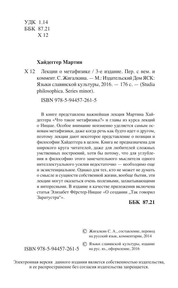В книге представлена важнейшая лекция Мартина Хайдеггера «Что такое метафизика?» и главы из курса лекций о Ницше. Особое внимание неизменно уделяется самым основам метафизики, даже когда речь как будто идет о другом, поэтому лекции дают некоторое представление о позиции и философии Хайдеггсра в целом. Книга не предназначена для широкого круга читателей, даже для любителей сложных умственных построений, хотя бы потому, что для углубления в философию этого замечательного мыслителя одного интеллектуального усилия недостаточно - необходимо еще и экзистенциальное. Однако для тех, кто не может не думать о смысле и сущности собственной жизни, вообще бытия, эти лекции могут оказаться очень полезными, захватывающими и интересными. В издание в качестве приложения включена статья Элизабет Фёрстер-Ницше «О создании "Так говорил Заратустра"».