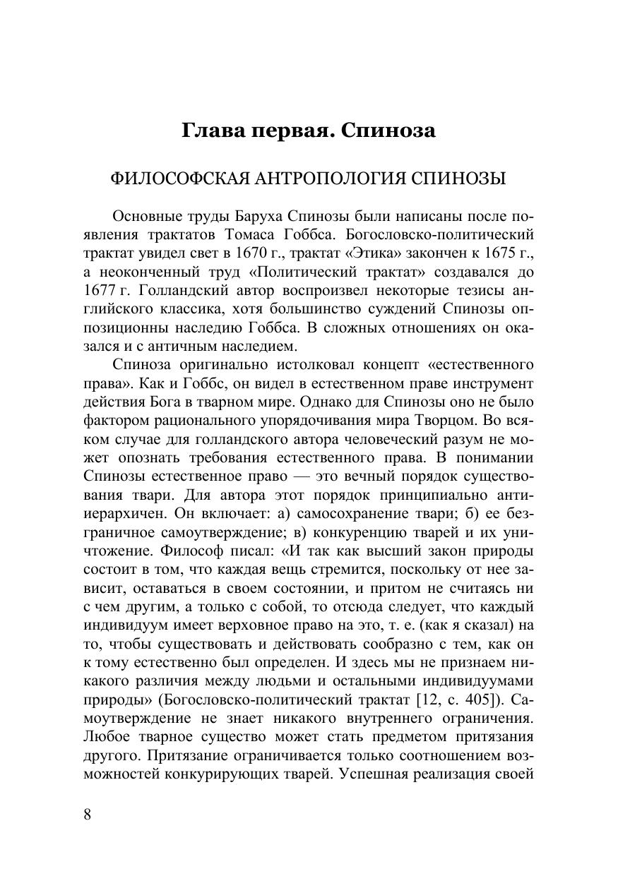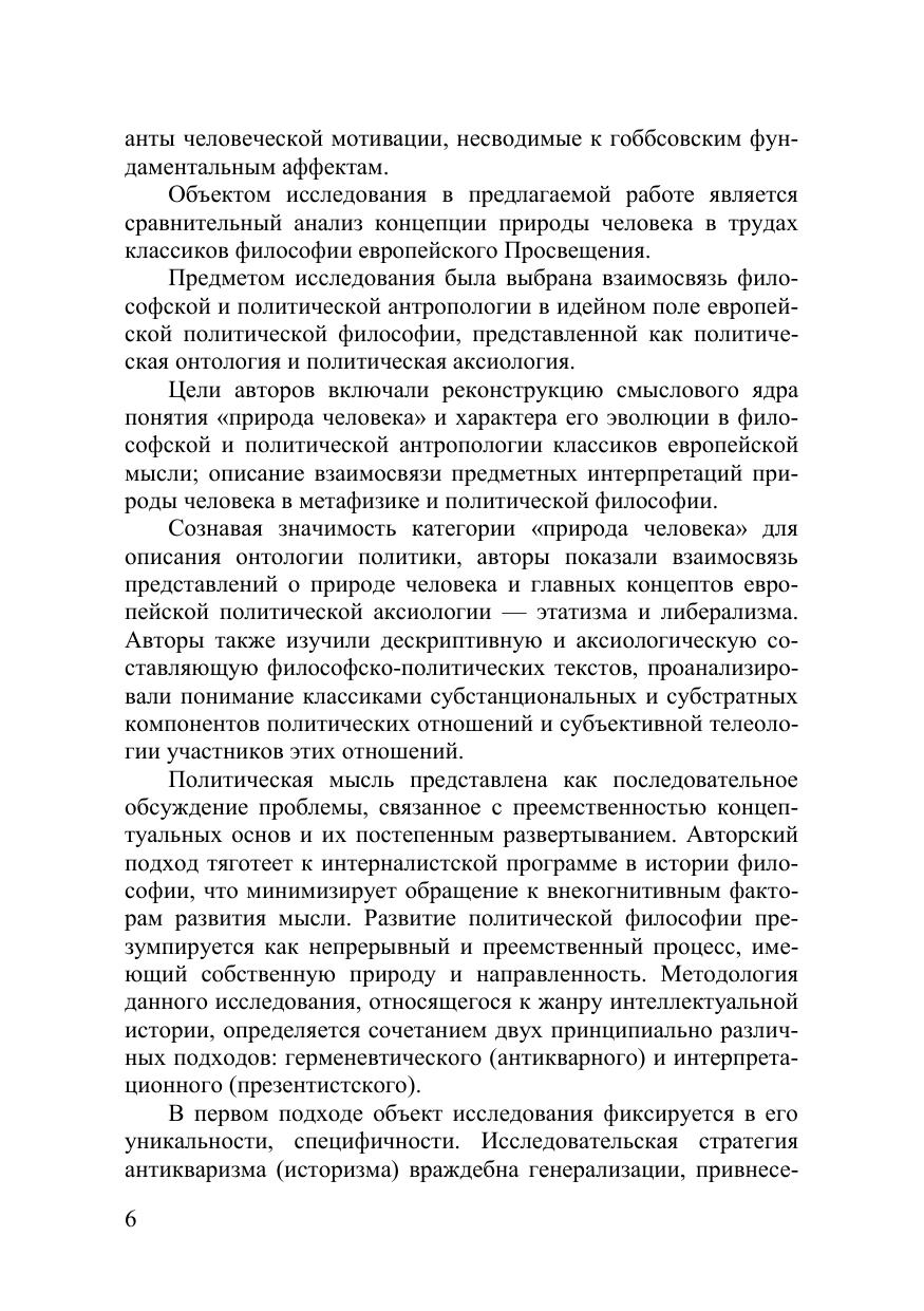 Книга является продолжением ранее вышедшего издания «Левиафан и Homo rebellеs (История политической антропологии в европейском фило-софском сознании. Античность — Новое время)». В монографии представлены воззрения на природу человека классиков европейской философии (Спиноза, Локк, Юм, Монтескье, Руссо, Морелли, Гельвеций и Гольбах), которые твори-ли между двумя европейскими революциями в эпоху Просвещения (XVIII в.). В работе прослеживается переход от философской антропологии к политиче-ской онтологии и аксиологии, представленный в трудах этих авторов. В эпоху Просвещения возникает базовый политический проект совре-менности — либерализм, рассматривающий свободу индивида и подотчет-ность ему власти как фундаментальную норму. Философской традицией, ока-завшейся адекватной либерализму, становится антропологизм (представление о реальности как проекции человеческой природы). В политической филосо-фии Просвещения антропологизм не нашел адекватной реализации, поскольку мыслители разрабатывали феноменалистскую модель человека, которая соот-ветствовала проекту этатизма, а не либерализма. Монография посвящена ис-следованию этого противоречия и поиску адекватной либерализму модели чело-века в философии Просвещения. В книге также анализируются основные поня-тия классической политической философии: естественное право, естественный закон, политический разум, легитимация власти, общественный договор, право на восстание, дилемма безопасности, государственная мощь, автаркия. Монография представляет интерес для философов, историков обще-ственной мысли и политологов.