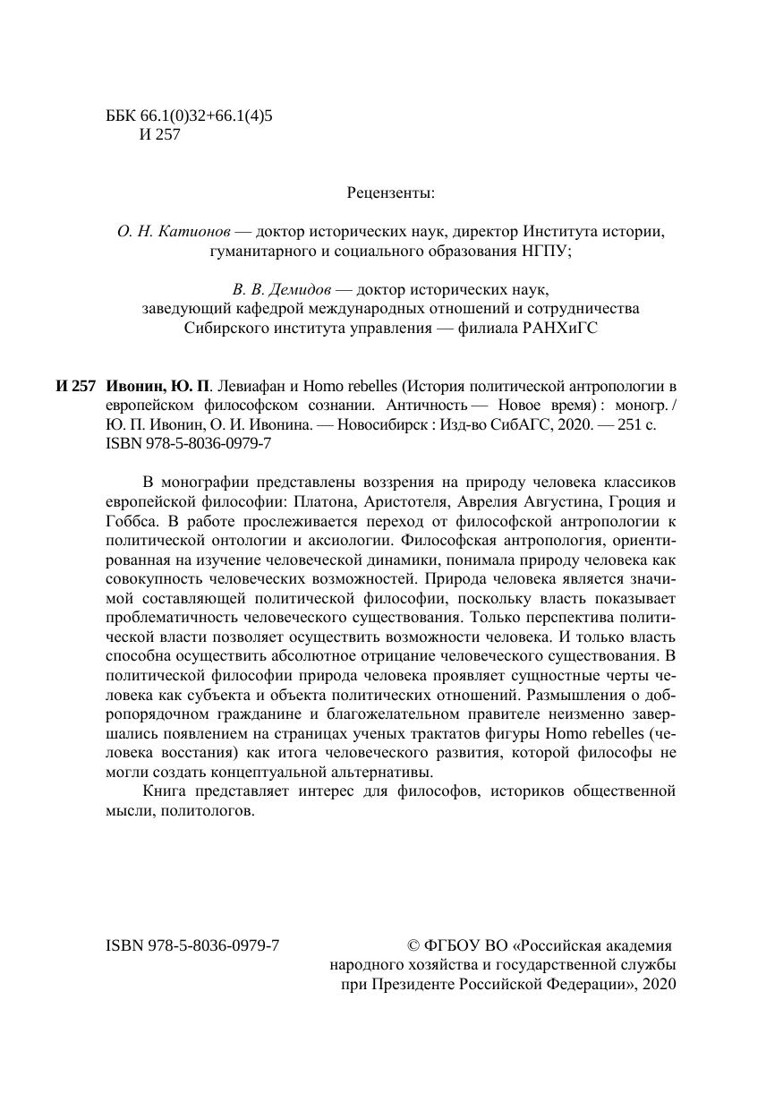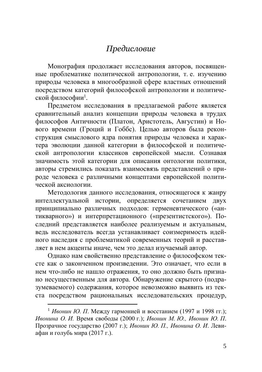 В монографии представлены воззрения на природу человека классиков европейской философии: Платона, Аристотеля, Аврелия Августина, Гроция и Гоббса. В работе прослеживается переход от философской антропологии к политической онтологии и аксиологии. Философская антропология, ориенти-рованная на изучение человеческой динамики, понимала природу человека как совокупность человеческих возможностей. Природа человека является значи-мой составляющей политической философии, поскольку власть показывает проблематичность человеческого существования. Только перспектива полити-ческой власти позволяет осуществить возможности человека. И только власть способна осуществить абсолютное отрицание человеческого существования. В политической философии природа человека проявляет сущностные черты че-ловека как субъекта и объекта политических отношений. Размышления о доб-ропорядочном гражданине и благожелательном правителе неизменно завер-шались появлением на страницах ученых трактатов фигуры Homo rebelles (че-ловека восстания) как итога человеческого развития, которой философы не могли создать концептуальной альтернативы. Книга представляет интерес для философов, историков общественной мысли, политологов.