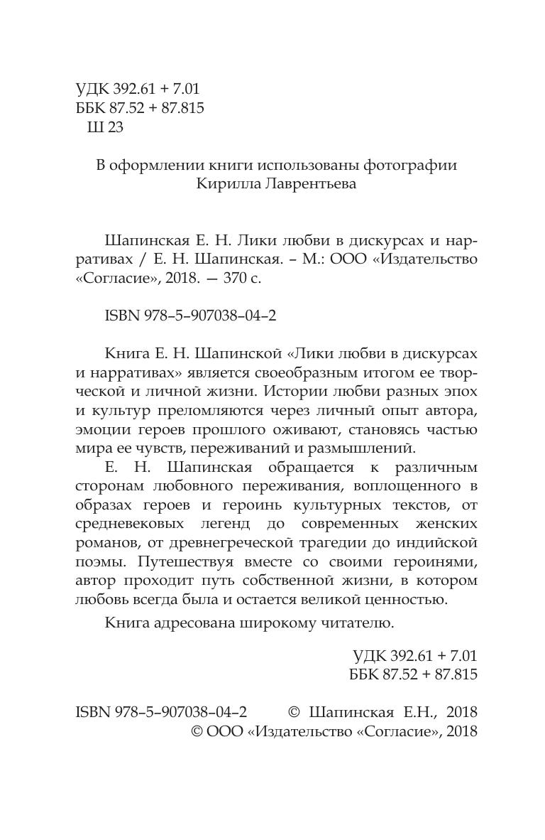 Книга Е. Н. Шапинской «Лики любви в дискурсах и нарративах» является своеобразным итогом ее творческой и личной жизни. Истории любви разных эпох и культур преломляются через личный опыт автора, эмоции героев прошлого оживают, становясь частью мира ее чувств, переживаний и размышлений. Е. Н. Шапинская обращается к различным сторонам любовного переживания, воплощенного в образах героев и героинь культурных текстов, от средневековых легенд до современных женских романов, от древнегреческой трагедии до индийской поэмы. Путешествуя вместе со своими героинями, автор проходит путь собственной жизни, в котором любовь всегда была и остается великой ценностью. Книга адресована широкому читателю.