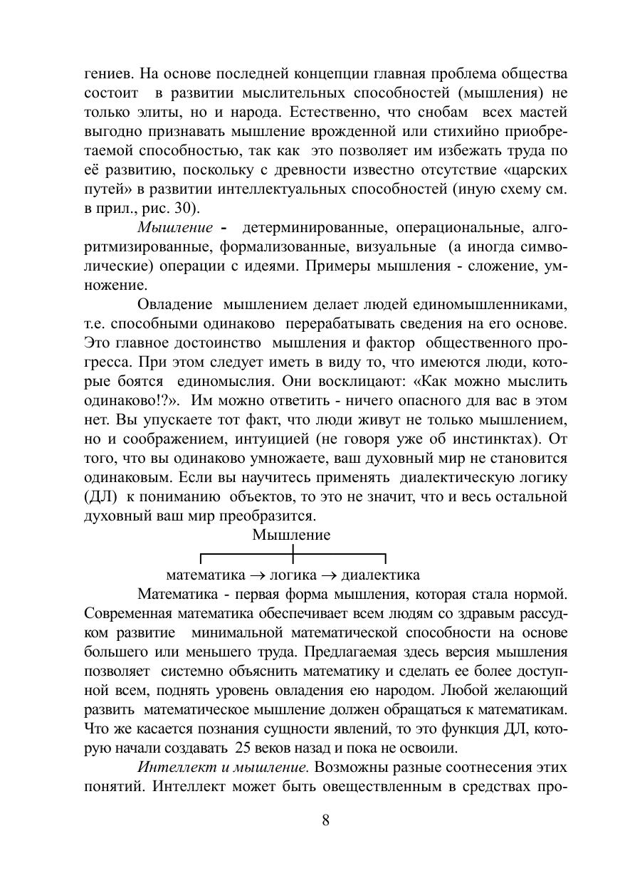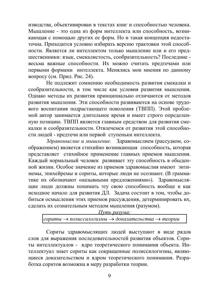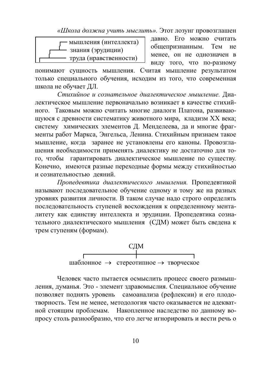 Интеллигентность, теоретичность, интеллектуальность человека предполагают его способность мыслить. Ее обеспечивают логика и диалектика. Однако учебные пособия по этим наукам недостаточны для развития мышления. Используя их, следует найти новые возможности для развития умения применять логику и диалектику в единстве, в качестве непосредственного, прямого, общенаучного, сознательного, практического, наблюдаемого метода мышления (иначе – как диалектическую логику).