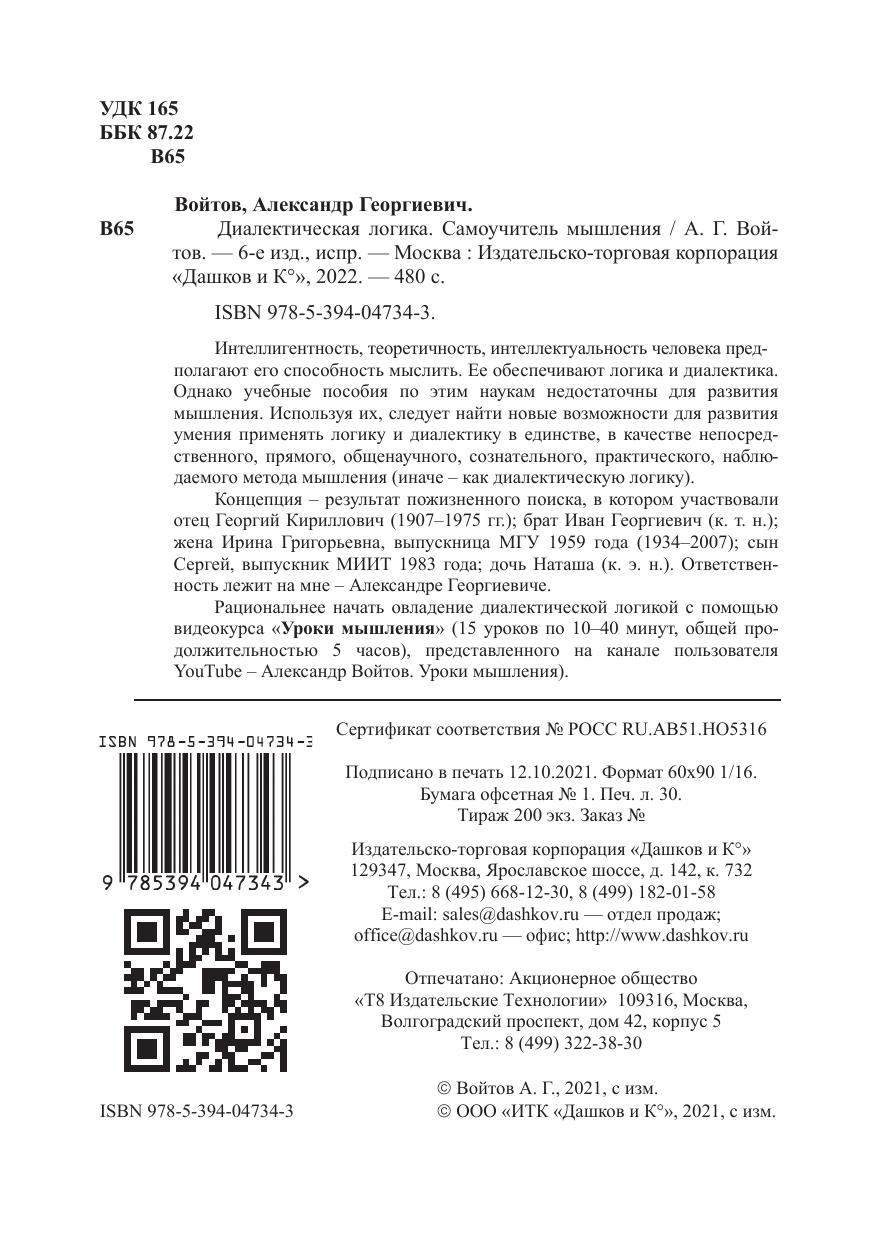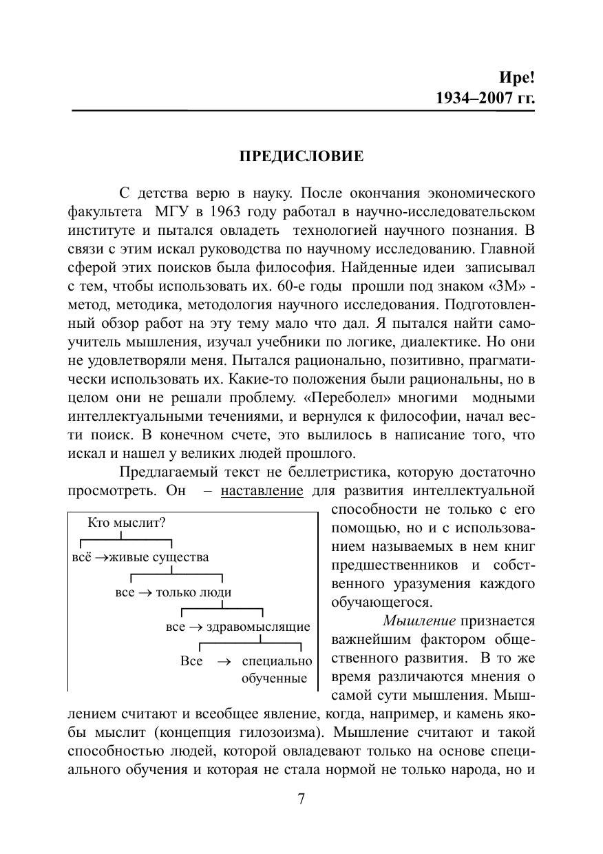 Интеллигентность, теоретичность, интеллектуальность человека предполагают его способность мыслить. Ее обеспечивают логика и диалектика. Однако учебные пособия по этим наукам недостаточны для развития мышления. Используя их, следует найти новые возможности для развития умения применять логику и диалектику в единстве, в качестве непосредственного, прямого, общенаучного, сознательного, практического, наблюдаемого метода мышления (иначе – как диалектическую логику). Концепция – результат пожизненного поиска, в котором участвовали отец Георгий Кириллович (1907–1975 гг.), брат Иван Георгиевич (к. т. н.), жена Ирина Григорьевна, выпускница МГУ 1959 года (1934–2007), сын Сергей, выпускник МИИТ 1983 года, дочь Наташа (к. э. н.). Ответственность лежит на мне – Александре Георгиевиче. Рациональнее начать овладение диалектической логикой с помощью компьютерного аудио- и видеокурса «Уроки мышления» (15 уроков по 10–40 минут, общей продолжительностью 5 часов), www\\miit–ief.ru \дистанционное обучение \ учебные материалы