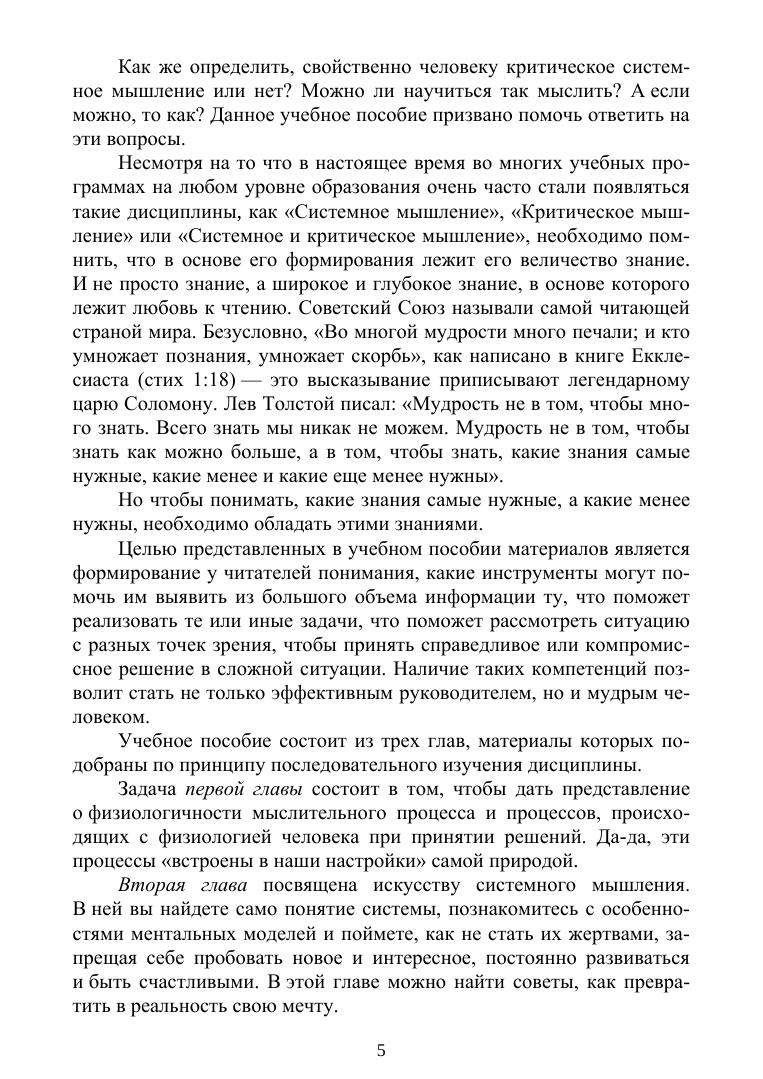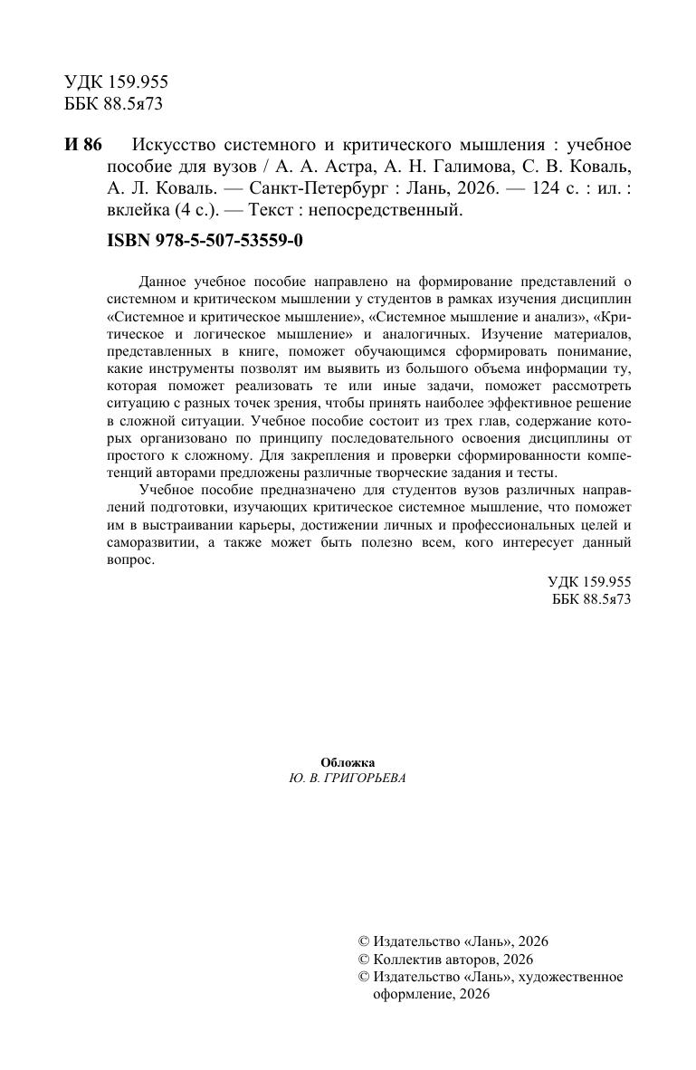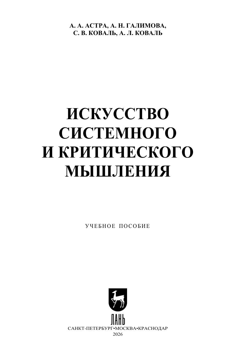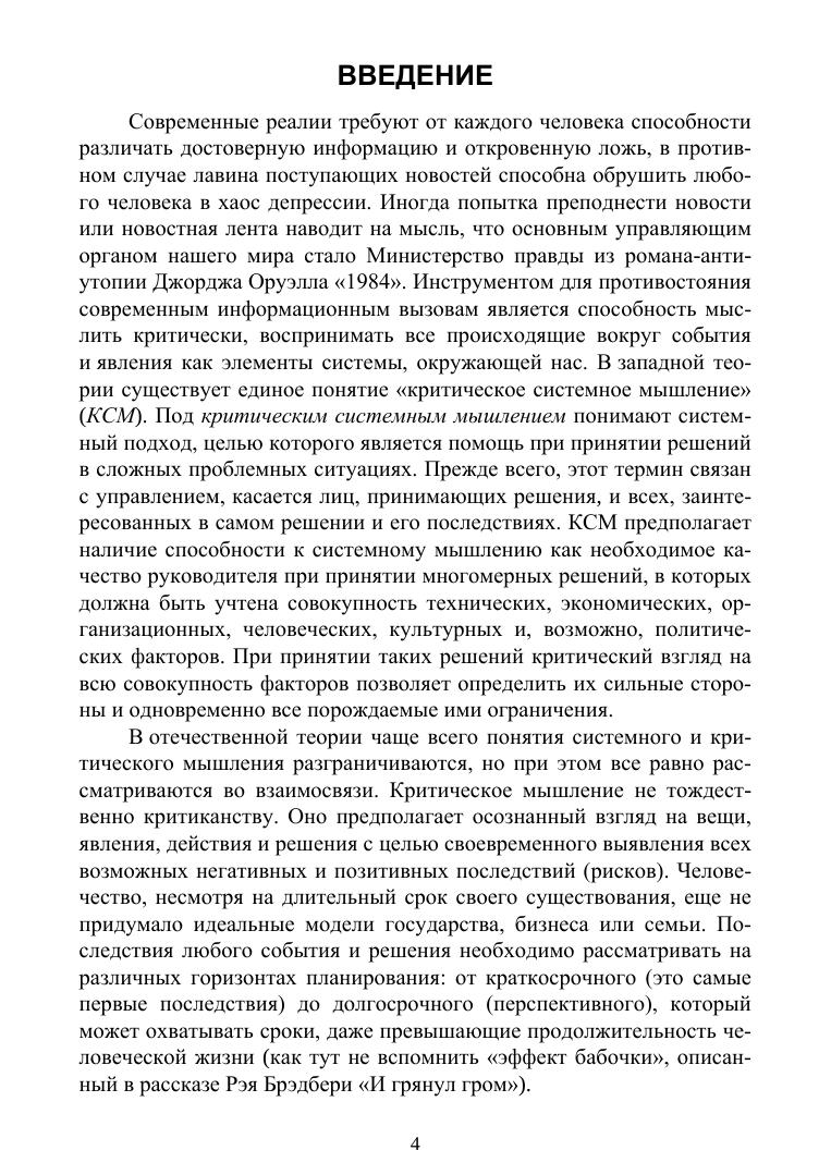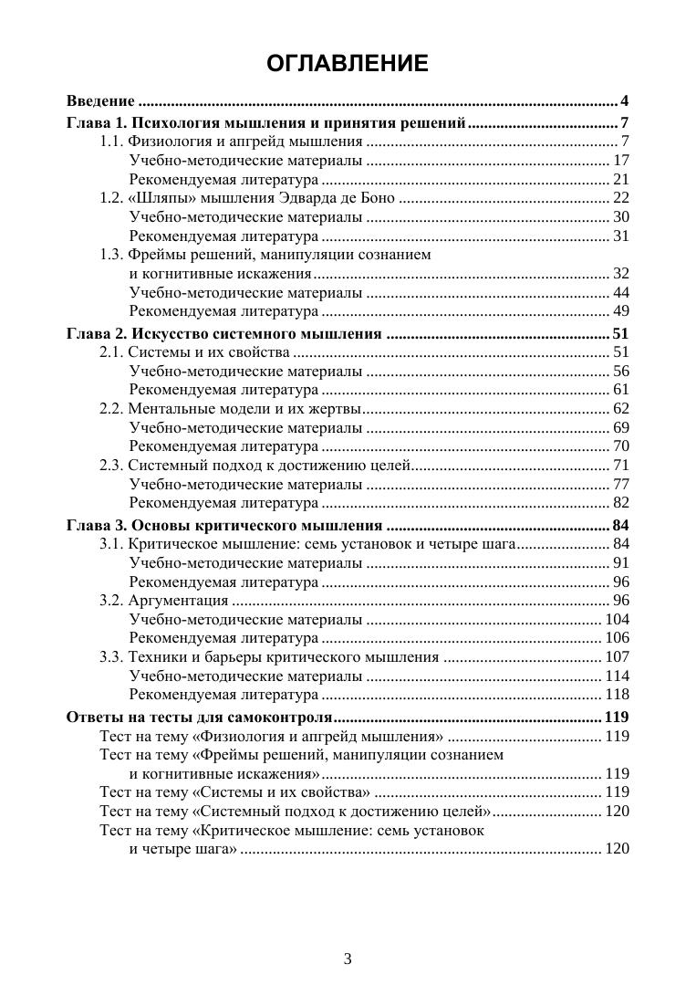 Данное учебное пособие направлено на формирование представлений о системном и критическом мышлении у студентов в рамках изучения дисциплин «Системное и критическое мышление», «Системное мышление и анализ», «Критическое и логическое мышление» и аналогичных. Изучение материалов, представленных в книге, поможет обучающимся сформировать понимание, какие инструменты позволят им выявить из большого объема информации ту, которая поможет реализовать те или иные задачи, поможет рассмотреть ситуацию с разных точек зрения, чтобы принять наиболее эффективное решение в сложной ситуации. Учебное пособие состоит из трех глав, содержание которых организовано по принципу последовательного освоения дисциплины от простого к сложному. Для закрепления и проверки сформированности компетенций авторами предложены различные творческие задания и тесты. Учебное пособие предназначено для студентов вузов различных направлений подготовки, изучающих критическое системное мышление, что поможет им в выстраивании карьеры, достижении личных и профессиональных целей и саморазвитии, а также может быть полезно всем, кого интересует данный вопрос.
