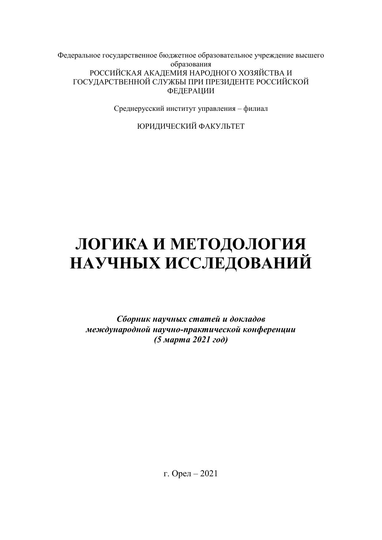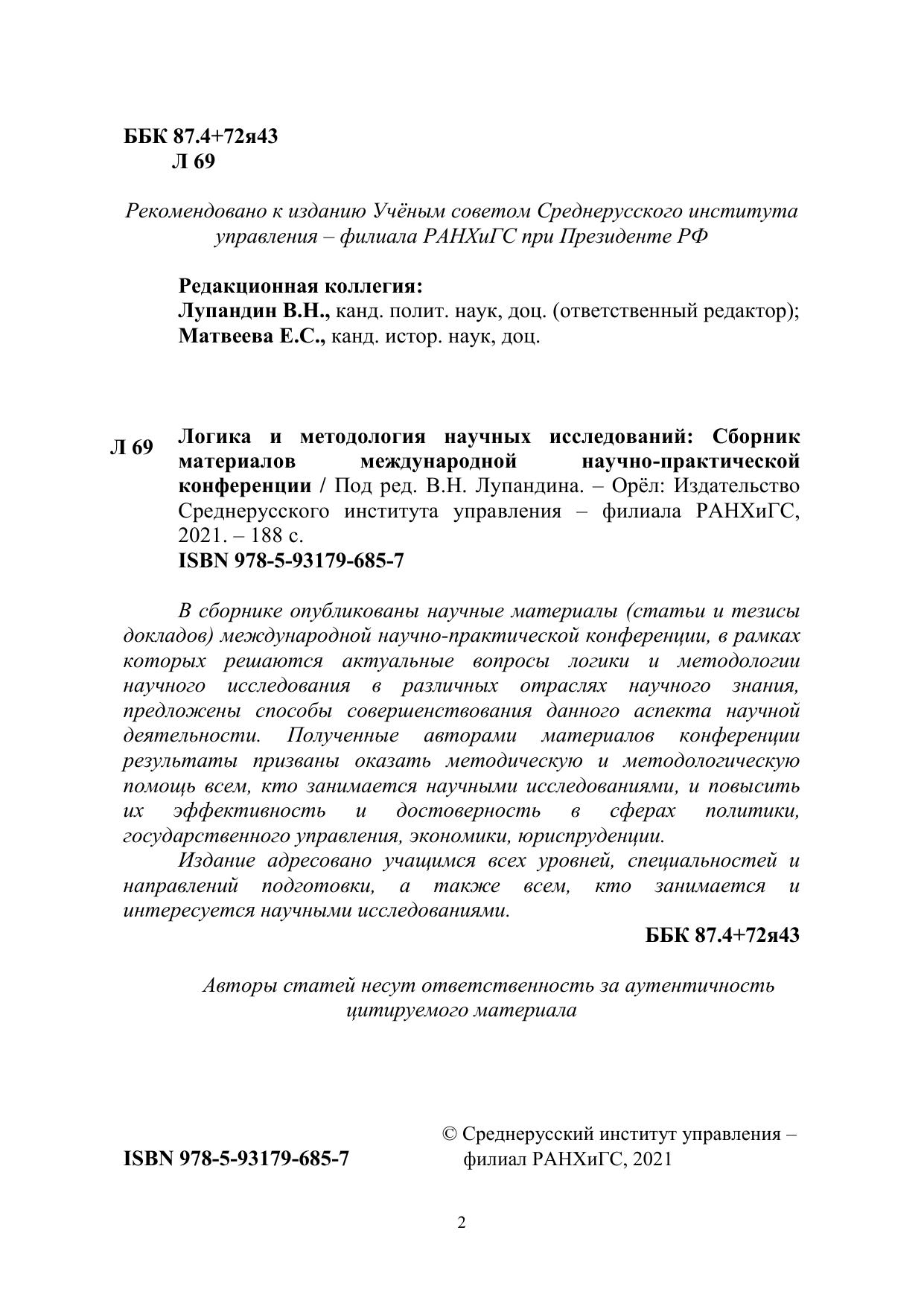 В сборнике опубликованы научные материалы (статьи и тезисы докладов) международной научно-практической конференции, в рамках которых решаются актуальные вопросы логики и методологии научного исследования в различных отраслях научного знания, предложены способы совершенствования данного аспекта научной деятельности. Полученные авторами материалов конференции результаты призваны оказать методическую и методологическую помощь всем, кто занимается научными исследованиями, и повысить их эффективность и достоверность в сферах политики, государственного управления, экономики, юриспруденции. Издание адресовано учащимся всех уровней, специальностей и направлений подготовки, а также всем, кто занимается и интересуется научными исследованиями.