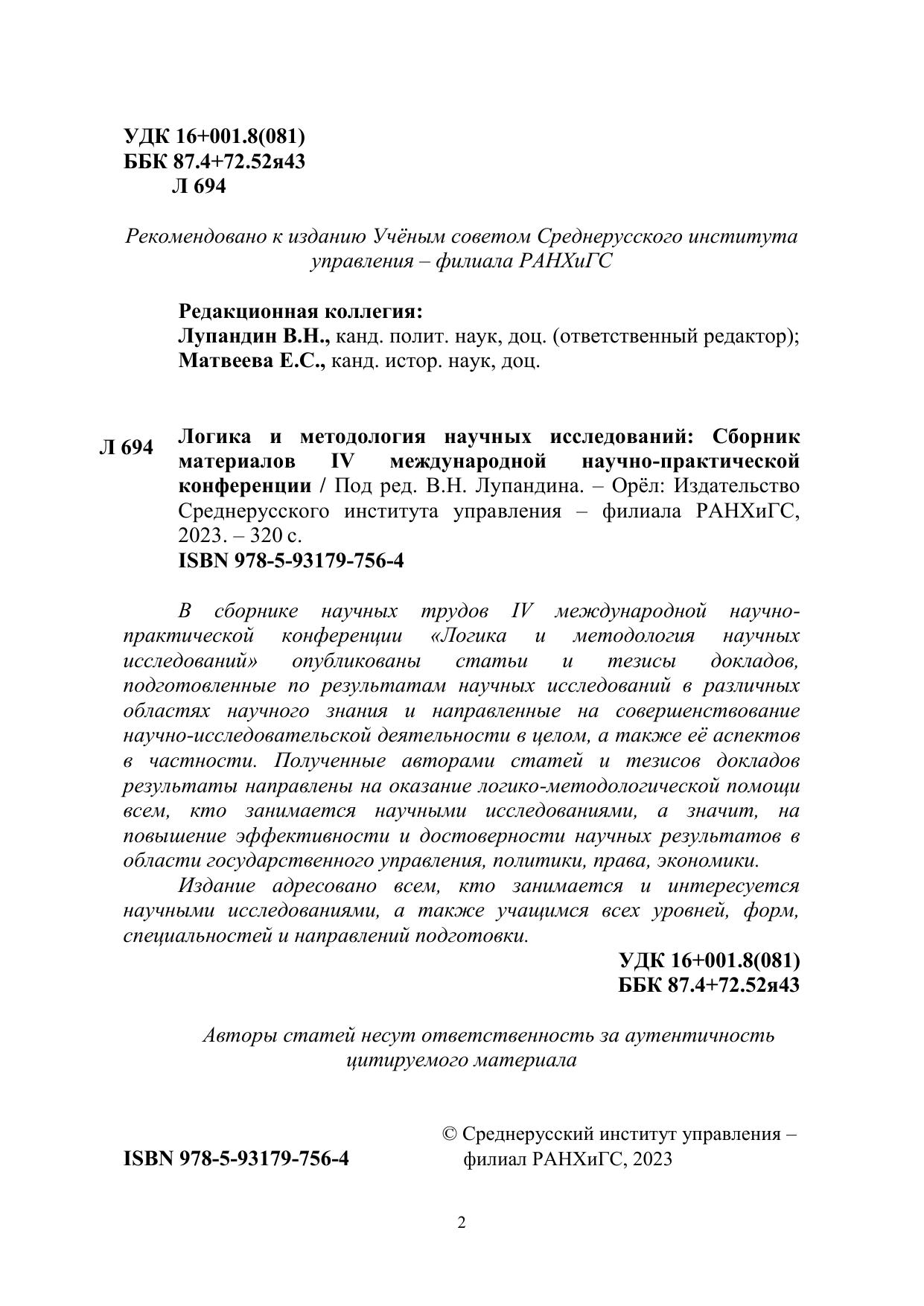 В сборнике научных трудов IV международной научнопрактической конференции «Логика и методология научных исследований» опубликованы статьи и тезисы докладов, подготовленные по результатам научных исследований в различных областях научного знания и направленные на совершенствование научно-исследовательской деятельности в целом, а также её аспектов в частности. Полученные авторами статей и тезисов докладов результаты направлены на оказание логико-методологической помощи всем, кто занимается научными исследованиями, а значит, на повышение эффективности и достоверности научных результатов в области государственного управления, политики, права, экономики. Издание адресовано всем, кто занимается и интересуется научными исследованиями, а также учащимся всех уровней, форм, специальностей и направлений подготовки.