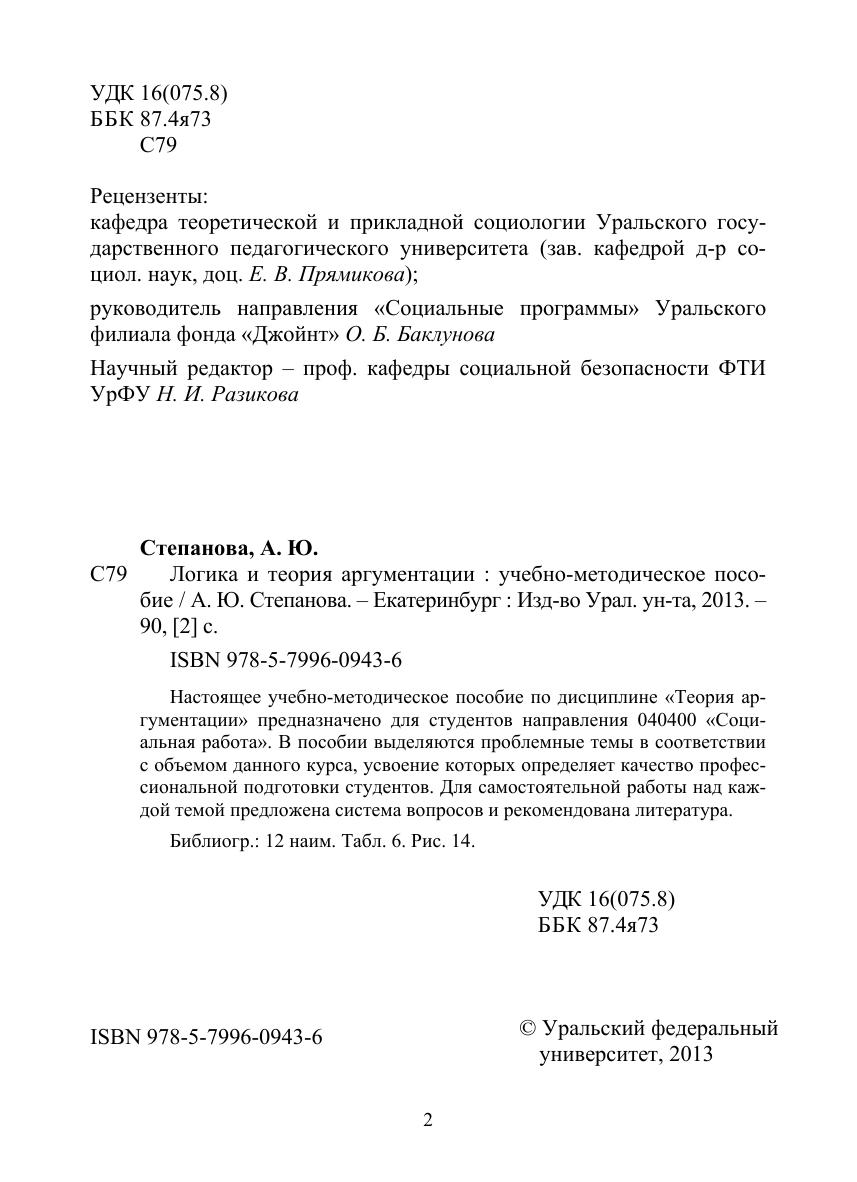 Настоящее учебно-методическое пособие по дисциплине «Теория аргументации» предназначено для студентов направления 040400 «Социальная работа». В пособии выделяются проблемные темы в соответствии с объемом данного курса, усвоение которых определяет качество профессиональной подготовки студентов. Для самостоятельной работы над каждой темой предложена система вопросов и рекомендована литература.