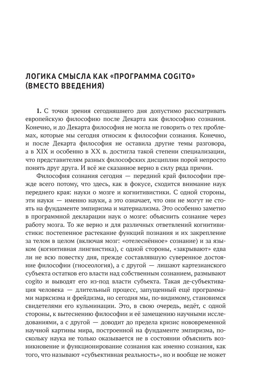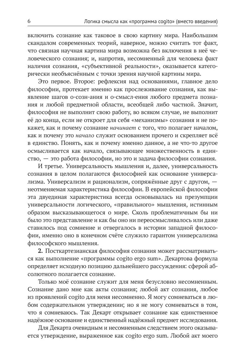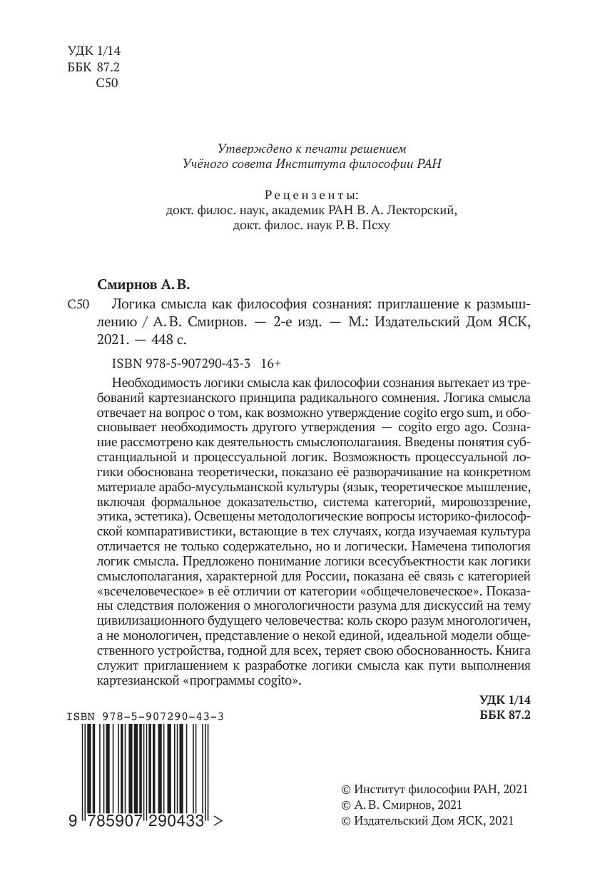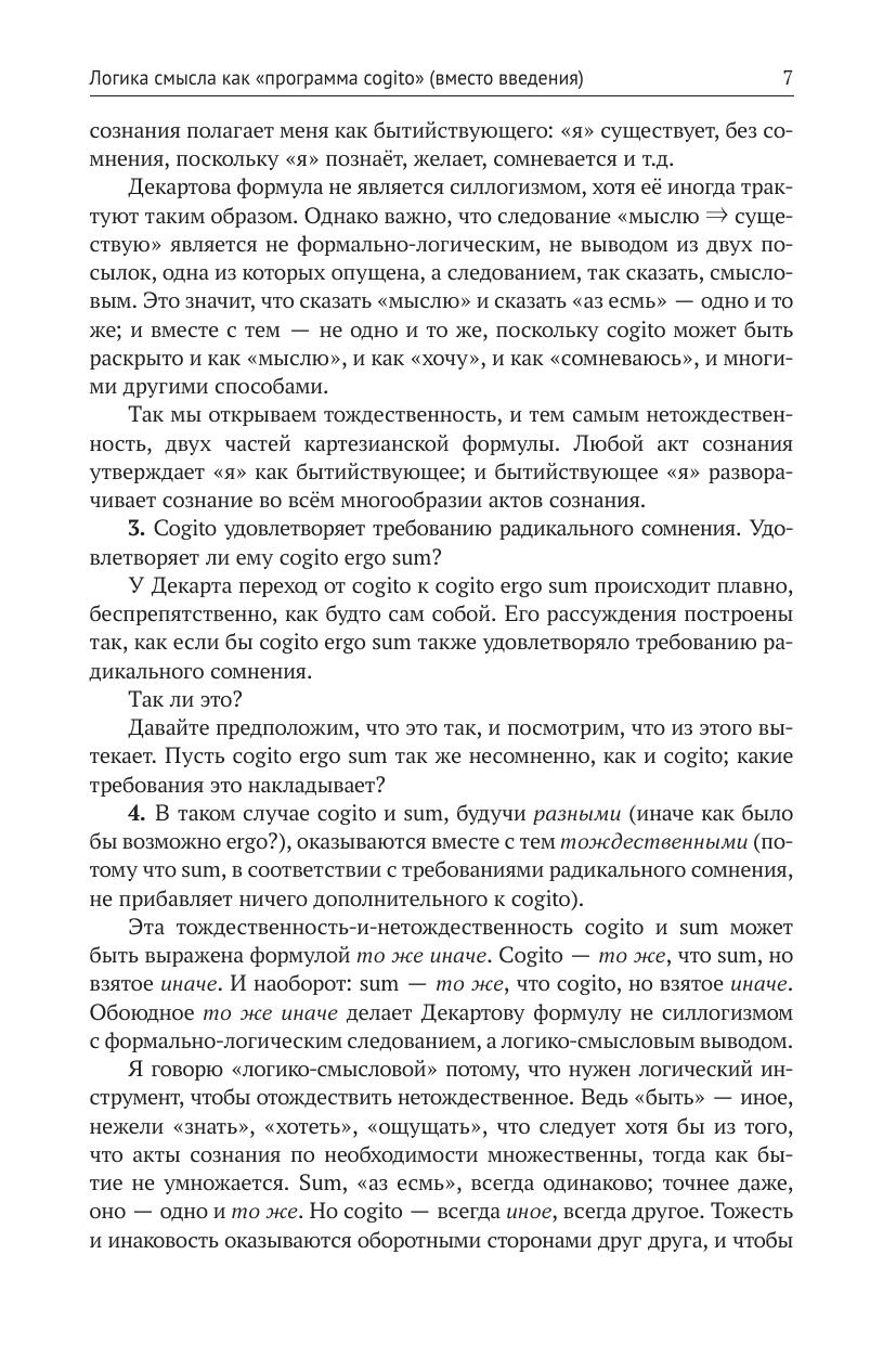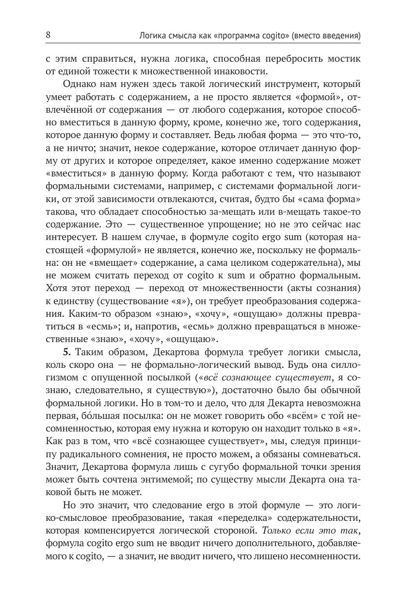 Необходимость логики смысла как философии сознания вытекает из требований картезианского принципа радикального сомнения. Логика смысла отвечает на вопрос о том, как возможно утверждение cogito ergo sum, и обосновывает необходимость другого утверждения — cogito ergo ago. Сознание рассмотрено как деятельность смыслополагания. Введены понятия субстанциальной и процессуальной логик. Возможность процессуальной логики обоснована теоретически, показано её разворачивание на конкретном материале арабо-мусульманской культуры (язык, теоретическое мышление, включая формальное доказательство, система категорий, мировоззрение, этика, эстетика). Освещены методологические вопросы историко-философской компаративистики, встающие в тех случаях, когда изучаемая культура отличается не только содержательно, но и логически. Намечена типология логик смысла. Предложено понимание логики всесубъектности как логики смыслополагания, характерной для России, показана её связь с категорией «всечеловеческое» в её отличии от категории «общечеловеческое». Показаны следствия положения о многологичности разума для дискуссий на тему цивилизационного будущего человечества: коль скоро разум многологичен, а не монологичен, представление о некой единой, идеальной модели общественного устройства, годной для всех, теряет свою обоснованность. Книга служит приглашением к разработке логики смысла как пути выполнения картезианской «программы cogito».