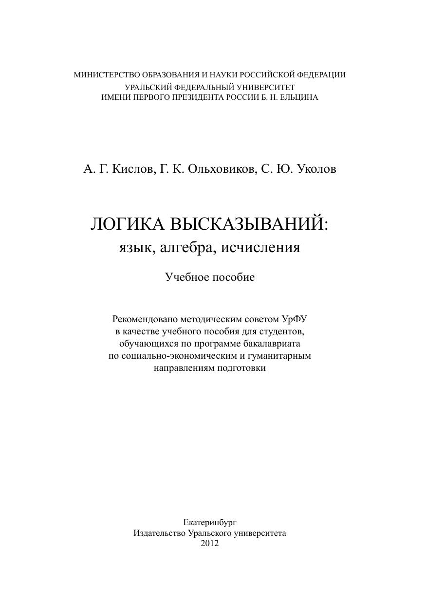 Логика высказываний: язык, алгебра, исчисления: учеб. пособие