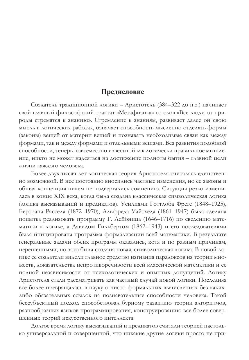 Излагаются основные темы традиционной и современной логики. Главное внимание уделено интерпретации логических знаний, принципов и методов с позиций сегодняшнего дня и их практическому приложению. Логика рассматривается как теория открытия, дедуктивного развития, обоснования и аргументированной защиты истины. Анализируется большое число примеров, используется оригинальная техника решения логических задач. Раскрываются познавательные и эвристические возможности логики. Даются контрольные вопросы и задания для самостоятельной учебной работы. Содержание учебного пособия отвечает требованиям действующих федеральных образовательных стандартов высшего профессионального образования и отражает опыт преподавания курса логики в Санкт-Петербургском государственном университете, других ведущих вузах. Для студентов высших учебных заведений, получающих образование по направлениям (специальностям) «Философия», «Юриспруденция» и др. Может использоваться в учебном процессе системы повышения квалификации и переподготовки кадров, а также специалистами, аспирантами, научными работниками, решающими логические проблемы или применяющими инструментарий логики в ходе практической и исследовательской деятельности.