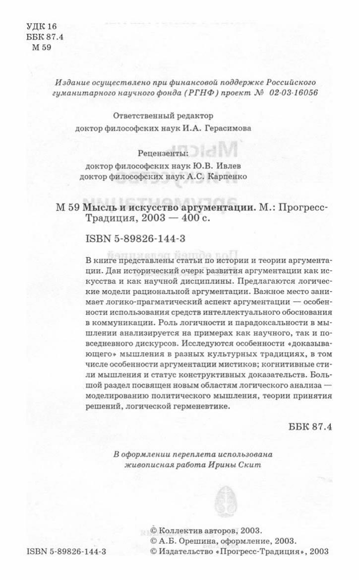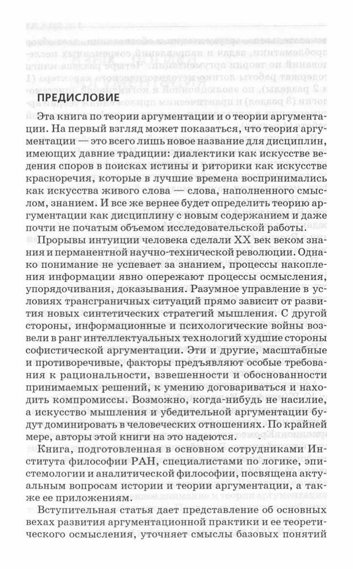 В книге представлены статьи по истории и теории аргументации. Дан исторический очерк развития аргументации как искусства и как научной дисциплины. Предлагаются логические модели рациональной аргументации. Важное место занимает логико-прагматический аспект аргументации - особенности использования средств интеллектуального обоснования в коммуникации. Роль логичности и парадоксальности в мышлении анализируется на примерах как научного, так и повседневного дискурсов. Исследуются особенности "доказывающего" мышления в разных культурных традициях, в том числе особенности аргументации мистиков; когнитивные стили мышления и статус конструктивных доказательств. Большой раздел посвящен новым областям логического анализа - моделированию политического мышления, теории принятия решений, логической герменевтике.