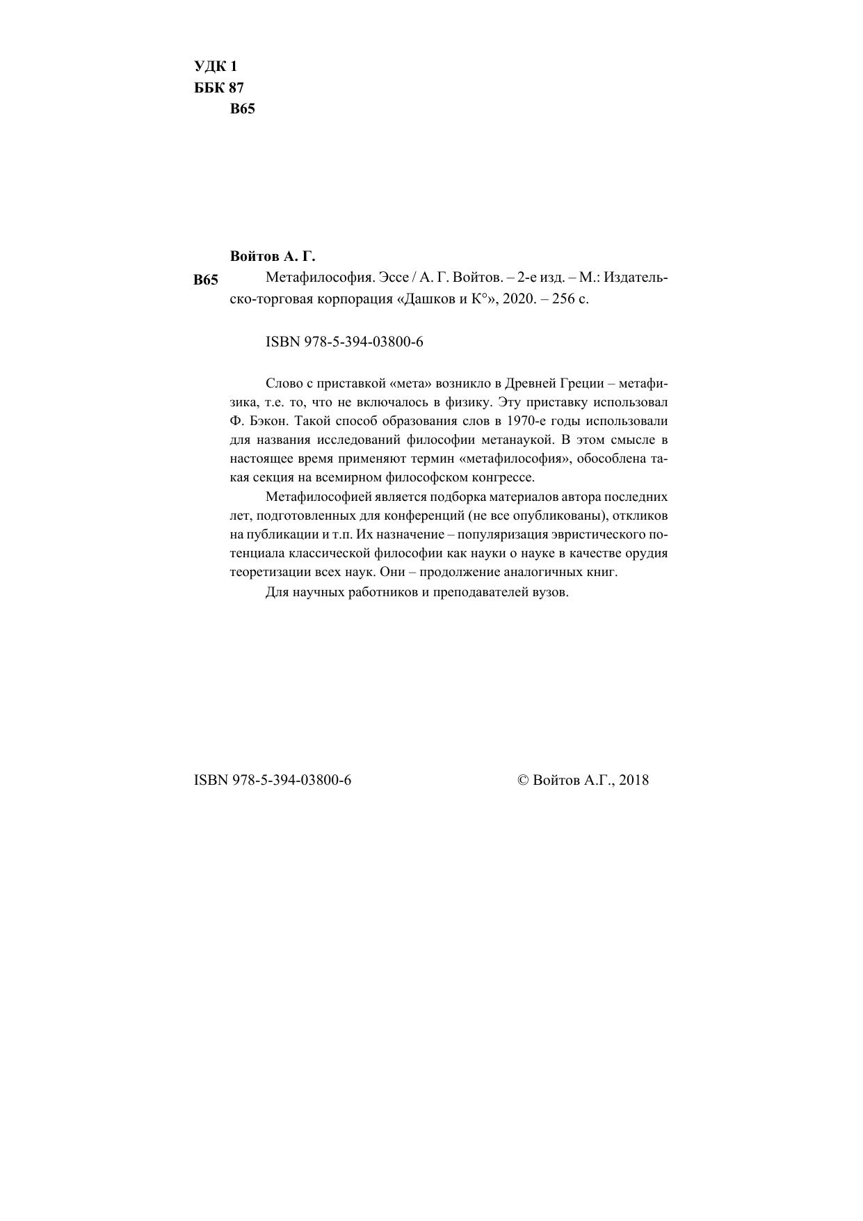 Слово с приставкой "мета" возникло в Древней Греции - метафизика, т.е. то, что не включалось в физику. Эту приставку использовал Ф.Бэкон. такой способ образования слов в 1970-е годы использовали для названия исследований философии метанаукой. В этом смысле в настоящее время применяют термин "метафилософия", обособлена такая секция на всемирном философском конгрессе. Метафилософией является подборка материалов автора последних лет, подготовленных для конференций (не все опубликованы), откликов на публикации и т.п. Их назначение - популяризация эвристического потенциала классической философии как науки о науке в качестве орудия теоретизации всех наук. Они - продолжение аналогичных книг. Для научных работников и преподавателей вузов.