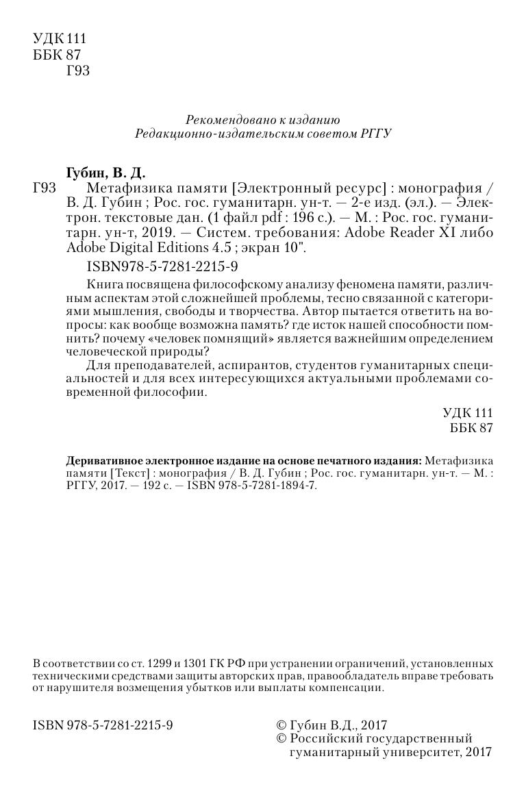 Книга посвящена философскому анализу феномена памяти, различным аспектам этой сложнейшей проблемы, тесно связанной с категориями мышления, свободы и творчества. Автор пытается ответить на вопросы: как вообще возможна память? где исток нашей способности помнить? почему «человек помнящий» является важнейшим определением человеческой природы?