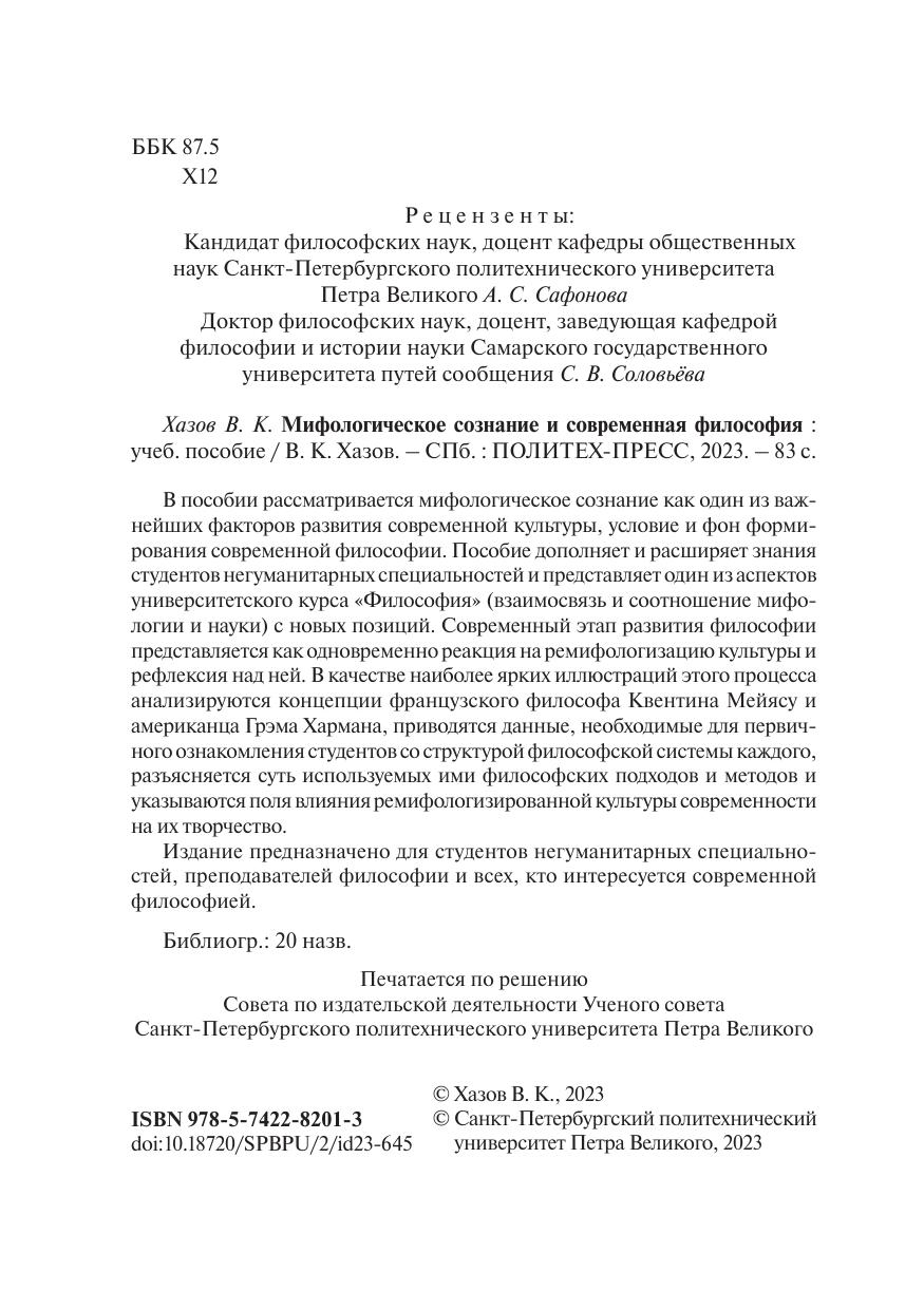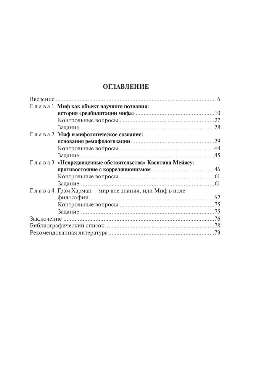 В пособии рассматривается мифологическое сознание как один из важнейших факторов развития современной культуры, условие и фон формирования современной философии. Пособие дополняет и расширяет знания студентов негуманитарных специальностей и представляет один из аспектов университетского курса «Философия» (взаимосвязь и соотношение мифологии и науки) с новых позиций. Современный этап развития философии представляется как одновременно реакция на ремифологизацию культуры и рефлексия над ней. В качестве наиболее ярких иллюстраций этого процесса анализируются концепции французского философа Квентина Мейясу и американца Грэма Хармана, приводятся данные, необходимые для первичного ознакомления студентов со структурой философской системы каждого, разъясняется суть используемых ими философских подходов и методов и указываются поля влияния ремифологизированной культуры современности на их творчество. Издание предназначено для студентов негуманитарных специальностей, преподавателей философии и всех, кто интересуется современной философией.