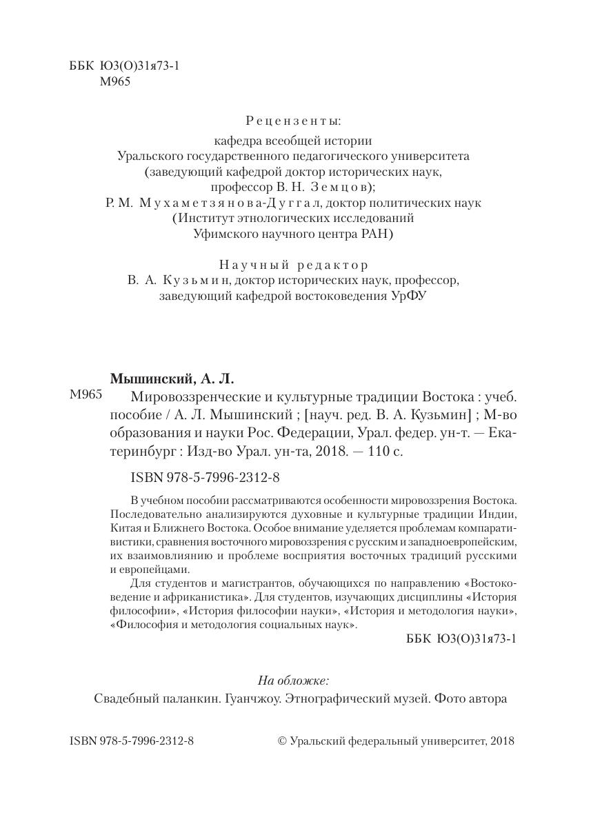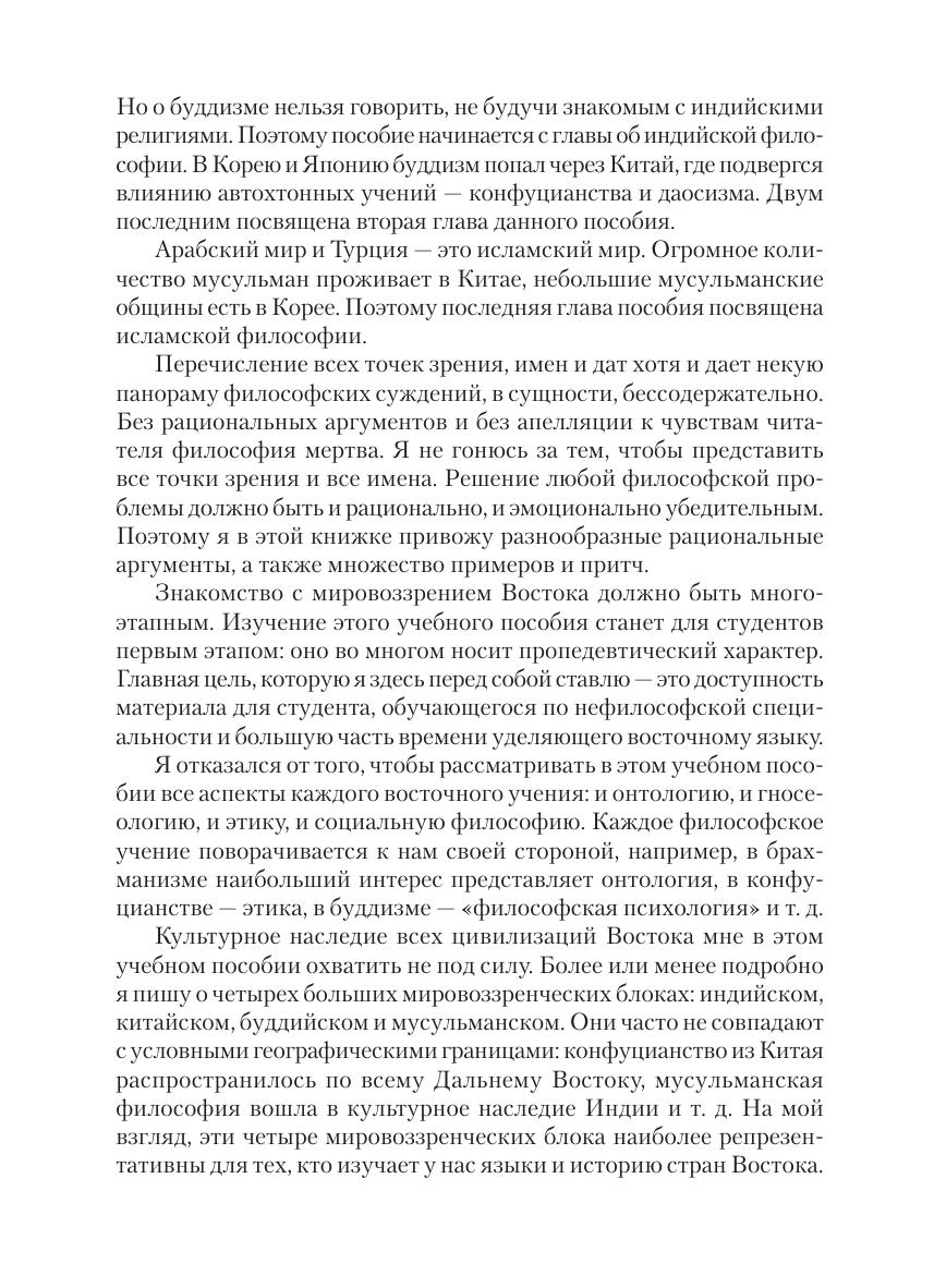 В учебном пособии рассматриваются особенности мировоззрения Востока. Последовательно анализируются духовные и культурные традиции Индии, Китая и Ближнего Востока. Особое внимание уделяется проблемам компаративистики, сравнения восточного мировоззрения с русским и западноевропейским, их взаимовлиянию и проблеме восприятия восточных традиций русскими и европейцами. Для студентов и магистрантов, обучающихся по направлению «Востоковедение и африканистика». Для студентов, изучающих дисциплины «История философии», «История философии науки», «История и методология науки», «Философия и методология социальных наук».
