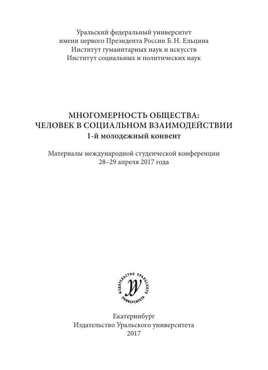 Сборник материалов первого молодежного конвента Уральского федерального университета содержит работы студентов, аспирантов и молодых ученых по искусствоведению и культурологии, истории и археологии, теоретической и прикладной лингвистике, международным отношениям, психологии и нейронаукам, социологии и социальной работе, филологии, философии. Издание адресовано студентам бакалавриата, магистратуры, аспирантуры общественных и гуманитарных наук.