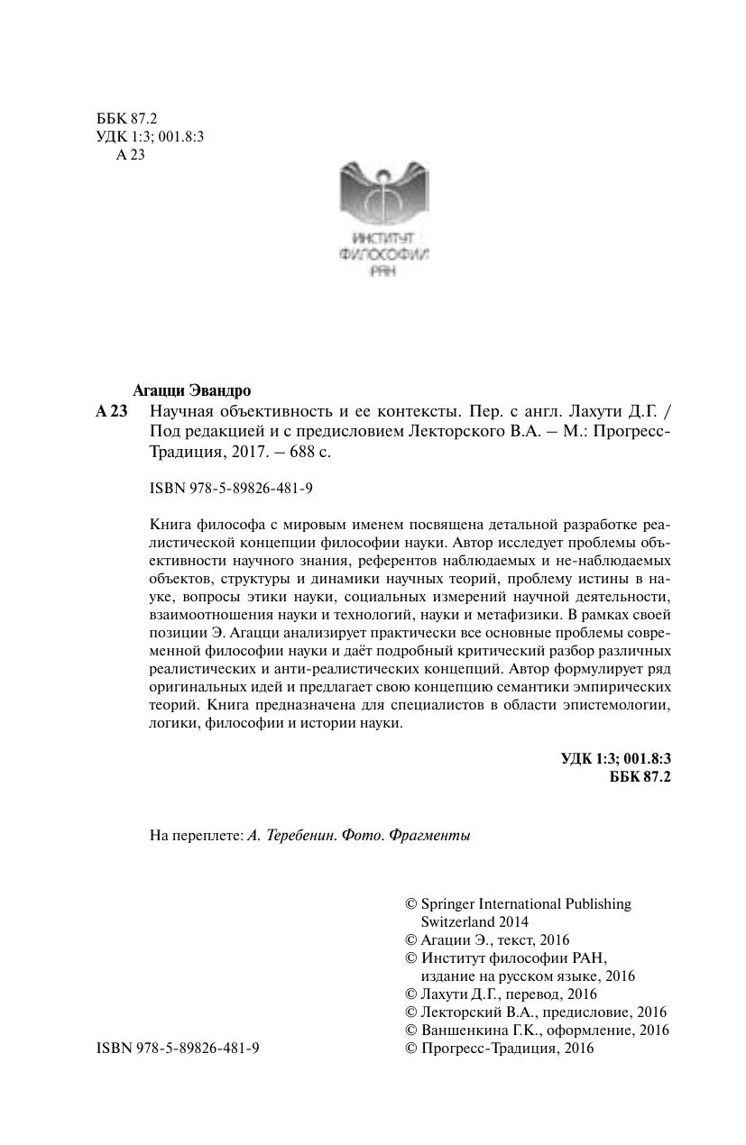 Книга философа с мировым именем посвящена детальной разработке реалистической концепции философии науки. Автор исследует проблемы объективности научного знания, референтов наблюдаемых и ненаблюдаемых объектов, структуры и динамики научных теорий, проблему истины в науке, вопросы этики науки, социальных измерений научной деятельности, взаимоотношения науки и технологий, науки и метафизики. В рамках своей позиции Э. Агацци анализирует практически все основные проблемы современной философии науки и даёт подробный критический разбор различных реалистических и антиреалистических концепций. Автор формулирует ряд оригинальных идей и предлагает свою концепцию семантики эмпирических теорий. Книга предназначена для специалистов в области эпистемологии, логики, философии и истории науки.
